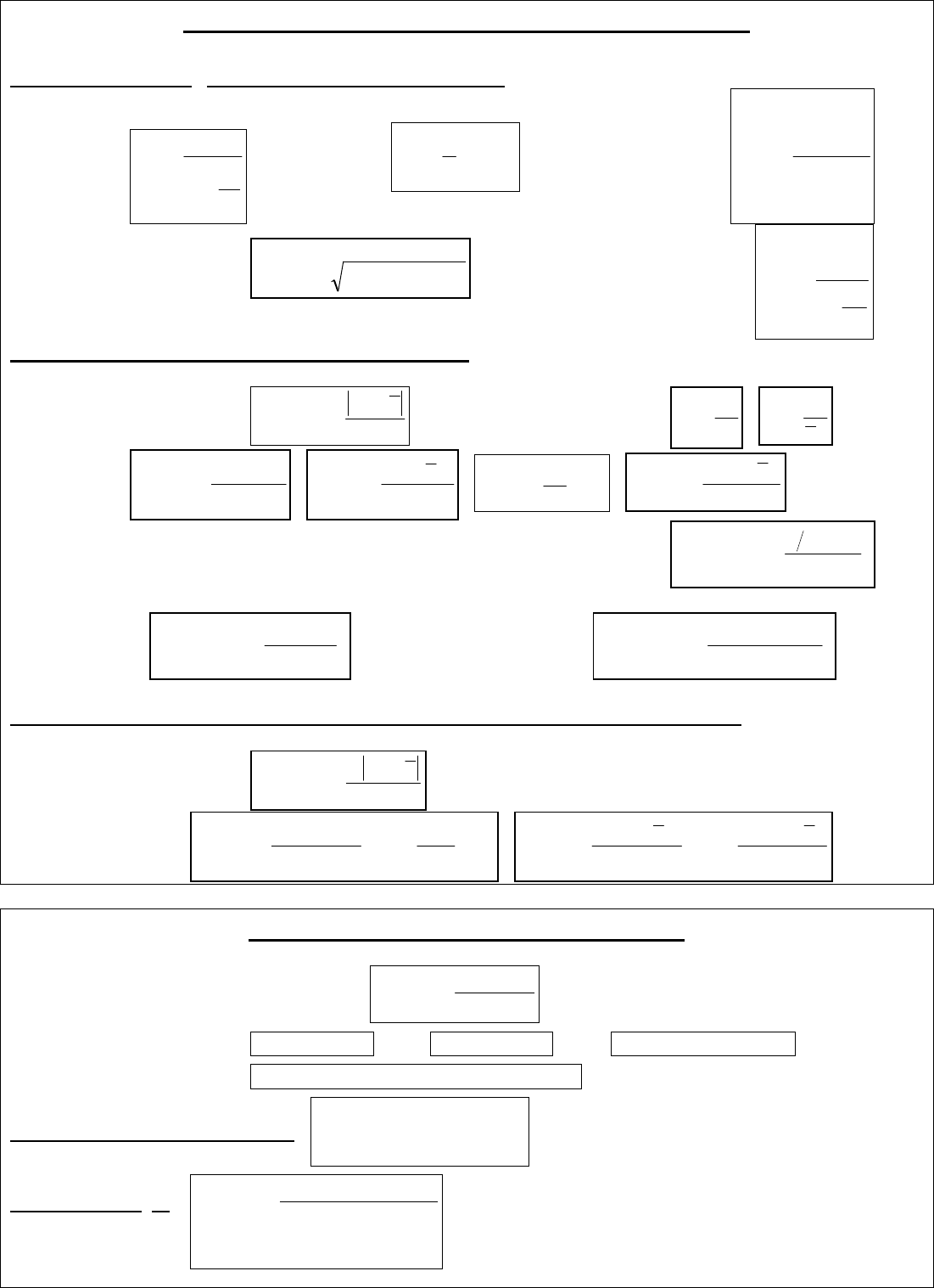 FÓRMULAS DE ESTATÍSTICA DESCRITIVA MEDIDAS DE POSIÇÃO OU TENDÊNCIA CENTRAL Média harm.: ∑∑∑∑ ==== ==== n 1i i h x 1 n m Média quad.: ∑∑∑∑ ==== ==== n 1i 2 iq x n 1 m Média arit. Pond. ∑∑∑∑ ∑∑∑∑ ==== ==== ==== k 1i i k 1i ii p w wx ma Média geom. ponderada: ∑ = = k 1i i k21 w w k w 2 w 1p ...xxxmg Média harmônica ponderada: ∑ ∑ = = = k 1i i i k 1i i p x w w mh MEDIDAS DE VARIABILIDADE OU DISPERSÃO Desvio Médio Absoluto: ∑∑∑∑ −−−− ==== n xx dma i Variâncias Relativas: 2 2 2 μ σ γ = 2 2 2 x sg = Variâncias: ∑∑∑∑ ==== −−−− ==== N 1i 2 i2 N μ)(x σ ∑∑∑∑ ==== −−−− −−−− ==== n 1i 1n )x(x s 2 i2 ∑ −= 2 2 i2 μ N x σ ∑∑∑∑ −−−− −−−− ==== 1n xnx s 22 i2 Mediana de uma distribuição de freqüências por classes ou intervalos: − += − i 1i iie f F2nhlim Moda de uma distribuição de freqüências por classes ou intervalos: Moda de King + += +− + 1i1i 1i iio ff fhlim Moda de Kzuber −− − += +− − 1i1ii 1ii iio ff2f ffhlim MEDIDAS DE VARIABILIDADE OU DISPERSÃO PARA DADOS AGRUPADOS Desvio Médio Absoluto: ∑∑∑∑ −−−− ==== n xxf dma ii As Variâncias: 2 N 1i 2 ii N 1i 2 ii2 μ N xf N μ)(xf σ −−−−==== −−−− ==== ∑∑∑∑∑∑∑∑ ======== ∑∑∑∑ ∑∑∑∑ ==== ==== −−−− −−−− ==== −−−− −−−− ==== n 1i n 1i 22 ii 2 ii2 1n xnxf 1n )x(xf s FÓRMULAS DE PROBABILIDADE Probabilidade de B condicionada a A: P(A) B)P(AP(B/A) ∩∩∩∩==== Eventos independentes: P(A/B) = P(A) ou P(B/A) = P(B) ou P(A ∩ B) = P(A) P(B) Eventos dependentes: P(A ∩ B) = P(B/A) P(A) = P(A/B) P(B) Teorema da Probabilidade Total: ∑∑∑∑ ==== ==== n 1 i ii )P(A )P(B/AP(B) Teorema de Bayes: ∑∑∑∑ ==== ==== n 1 i ii ii i )P(A )P(B/A )P(A )P(B/A/B)P(A VARIÁVEIS ALEATÓRIAS DISCRETAS (VAD) (a) Expectância, esperança, média ou valor esperado de X: ∑ = = n 1i ii )f(xxE(X) (b) A variância de X: ( )2ii n 1i μx)x(fV(X) −= ∑ = ou [[[[ ]]]]22 E(X))E(XV(X) −−−−==== , onde ∑∑∑∑==== )f(xx)E(X ii22 Distribuição Binomial: xnxqp x n x)P(Xf(x)p(x) − ==== E(X) = np V(X) = npq Distribuição Hipergeométrica: −−−− −−−− ============ n N xn rN x r x)P(Xp(x) npE(X) ==== 1N N n npq)(V −−−− −−−− ====X Para N≥20n a Distribuição Hipergeométrica pode ser aproximada pela Distribuição Binomial, com parâmetros “n” e “ Nrp = ” Distribuição de Poisson: x! λ e x)P(Xp(x) xλ−−−− ============ E(X) = V(X) = λ Aproximação da Distribuição Binomial usando a Distribuição de Poisson: x! λeqp x n limx)P(Xlim xλ xnx nn − − ∞→∞→ = == com λ = np FÓRMULAS DE VARIÁVEIS ALEATÓRIAS CONTÍNUAS Propriedades: (a) Expectância, esperança, média ou valor esperado de X: ∫ ∞+ ∞− == f(x)dxxE(X)μ (b) A variância de X: (((( )))) 222 2 22 μ)E(Xμf(x)dxxf(x)dxμxV(X) −−−−====−−−−====−−−−======== ∫∫∫∫∫∫∫∫ ∞∞∞∞++++ ∞∞∞∞−−−− ∞∞∞∞++++ ∞∞∞∞−−−− σ Distribuição Uniforme: ≤≤ − = valor.outroqualquer para 0, bxa para , ab 1 f(x) Propriedades: 2 baE(X) ++++==== 12 a)(b 2V(X) −−−−==== FDA: ≥ <≤ − − < = − =≤= ∫ ∞− b xse 1, bxa se , ab ax a xse 0, du ab 1 x)P(XF(X) x Distribuição Exponencial: >>>> ==== −−−− contrário. caso 0, 0 tpara ,λ f(t) λte Propriedades: λ 1E(X) ==== 2λ 1V(X) ==== FDA: ≥≥≥≥−−−− <<<< ========≤≤≤≤==== −−−− −−−−∫∫∫∫ 0 tse ,1 0, tse 0, duλet)P(TF(t) λte t 0 λu Distribuição Normal Padrão ou Reduzida: σ μX Z −−−− ====