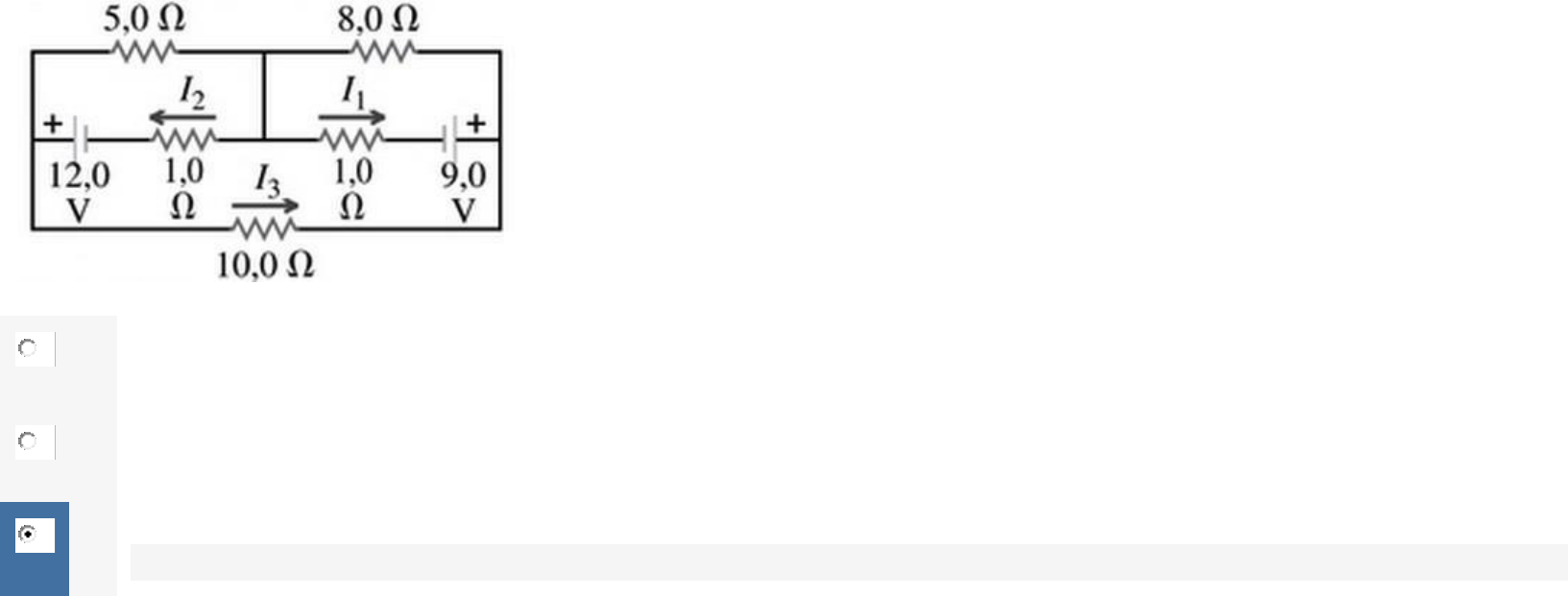 Questão 1/5 - Física - Eletricidade Calcule as correntes I1, I2 e I3 indicadas na figura a seguir. Assinale a alternativa que contém os valores corretos: Nota: 20.0 A I1=0,967 A, I2= 2,14 A e I3=0,271 A; B I1=0,848 A, I2=3,15 A e I3=0,271 A; C I1=0,848 A, I2=2,14 A e I3=0,171 A; Você acertou! D I1=0,967 A, I2=3,15 A e I3=0,171 A. Questão 2/5 - Física - Eletricidade Um circuito elétrico, conforme mostra a figura, é composto por uma bateria de FEM $$\varepsilon$$ = 15,5 V, com resistência interna r = 3 ohms e um resistor de R = 6,5 ohms. I. A corrente elétrica I que passa pelo circuito é 2,47 A; II. A tensão Vab entre os pontos a e b é 10,61 V. Assinale a alternativa correta: Nota: 20.0 A Todas as proposições são verdadeiras; B Somente a proposição I é verdadeira; C Somente a proposição II é verdadeira; Você acertou! D Todas as proposições são falsas. Questão 3/5 - Física - Eletricidade Você deseja medir a corrente que passa pelo resistor de 2 $$\Omega$$ indicado na figura e também a diferença de potencial através dele. Como um voltímetro e um amperímetro devem ser conectados a esse resistor? Nota: 0.0 A Amperímetro e voltímetro ligados em série com o resistor. B Amperímetro em série com o resistor e voltímetro conectado entre os pontos b e d. Resposta: Um amperímetro deve ser sempre ligado em série com o dispositivo em que se quer determinar a corrente elétrica e o voltímetro deve ser ligado em paralelo com o dispositivo. C Amperímetro conectado entre os pontos b e d e voltímetro em série com o resistor. D Amperímetro e voltímetro ligados entre os pontos b e d. Questão 4/5 - Física - Eletricidade A utilização de instrumentos de medidas elétricas como voltímetros, amperímetros e ohmímetros são fundamentais quando trabalhamos com circuitos elétricos reais. Geralmente é mais rápido e fácil se executar uma medição de uma determinada grandeza elétrica no circuito do que calculá-la. Mas para isso é fundamental saber como utilizá-los corretamente. Um voltímetro deve ser inserido em ________ com o elemento em que se deseja medir a _________. Para que o voltímetro não altere os valores do circuito sua resistência interna deve ser____________. Já um amperímetro deve ser inserido em ________ com o elemento em que se deseja medir a _________. Para que o amperímetro não altere os valores do circuito sua resistência interna deve ser____________. Assinale a alternativa que contenha as palavras corretas, que estão faltando no trecho acima. Nota: 20.0 A Série, corrente elétrica, muito alta, paralelo, voltagem, muito baixa; B Paralelo, corrente elétrica, muito baixa, série, voltagem, muito alta; C Paralelo, voltagem, muito alta, paralelo, corrente elétrica, muito alta; D Paralelo, voltagem, muito alta, série, corrente elétrica, muito baixa. Você acertou! Gabarito: Rota aula 3, página 33-35 Questão 5/5 - Física - Eletricidade Um fio de cobre possui diâmetro de 1,25 mm. Esse fio com resistividade p = 2,64.10-9 ohm.m, está ligado a um chuveiro e conduz uma corrente elétrica de 43 A. Analise as proposições: I. O módulo do campo elétrico no fio é 0,0925 V/m; II. A diferença de potencial entre os dois pontos do fio separados por uma distância igual a 65,0 m é 6,0125 V; III. A resistência de um segmento do fio de comprimento igual a 65,0 m é de 0,14 ohms. Assinale a alternativa correta: Nota: 20.0 A Somente as proposições I e III são verdadeiras; B Todas as proposições são verdadeiras; Você acertou! C Somente as proposições II e III são verdadeiras; D Somente a proposição III é verdadeira.
