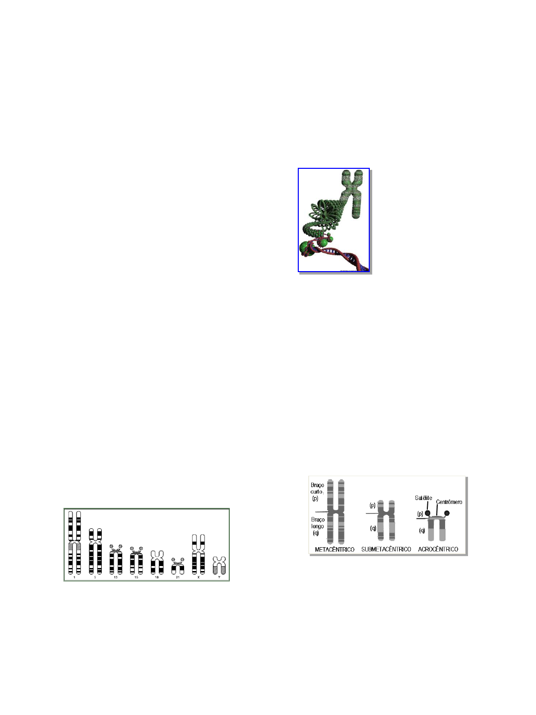 14/10/2015 1 Cromossomos humanos e suas alterações Profa Janainna Olegario FACTHUS / 2015 Citologia + Genética = Citogenética “Compreende todo e qualquer estudo relativo ao cromossomo isolado ou em conjunto, condensado ou distendido, tanto no que diz respeito a sua morfologia, organização, função e replicação quanto a sua variação e evolução” Marcelo Guerra Denver – 1960 (Colorado/USA) 1- Posição do Centrômero (Meta, Submeta e Acro) 2- Tamanho (Grande, Médio e Pequeno) Classificação dos cromossomos 1. Posição do Centrômero (Meta, Submeta e Acro) 14/10/2015 2 Metacêntrico Submetacêntrico Acrocêntrico 2. Tamanho (Grande, Médio e Pequeno) www.geneticamedica.com.br/.../ citogenetica.htm 14/10/2015 3 coloração uniforme dos cromossomos:identificação morfológica dos pares cromossômicos: 1, 2, 3, 16, 17, 18 e Y. Classificação dos cromossomos em grupos: A - G COLORAÇÃO USUAL Grupo Características No. de Cromossomos Pares Cromossômicos Tamanho Posição do Centrômero A Grandes Meta Submeta Meta 6 1 2 3 B Grandes Submeta 4 5 e 6 C Médios Submeta ♀ 16 ♂ 15 6, 7, 8, 9, 10, 11, 12 e X D Médios Acro 6 13, 14 e 15 E Pequenos Submeta 6 16, 17 e 18 F Pequenos Meta 4 19 e 20 G Pequenos Acro ♀ 4 ♂ 5 21, 22 e Y Total 46 Cromossomos ISCN: An International System for Human Cytogenetic Nomenclature CLASSIFICAÇÃO DOS CROMOSSOMOS HUMANOS (GRUPOS A – G) Bandeamento cromossômico • Coloração usual com Giemsa • Bandeamento Q • Bandeamento G • Bandeamento R • Bandeamento C • Coloração Ag-NOR BANDA GTG: Seabright (1971) • Tratamento com tripsina e coloração com Giemsa • Bandas claras e escuras intercaladas (450 bandas) • Bandas G+ ricas em AT (pobre em genes) • Bandas G- ricas em GC (rica em genes) • Identificação de alterações estruturais e pareamento dos cromossomos 14/10/2015 4 www.ucm.es/.../AVG/practicas/ cariotipo/carioP.htm http://www.scielosp.org/scielo.php?pid=S1413-81232002000300013&script=sci_arttext Nomenclatura em cariótipos humanos Cariótipo Humano • Em 1960 foi criado o sistema Denver. • Numerou os cromossomos de 1 a 22 e os separou em sete grupos distintos. • Patau então nomeou cada grupo com uma letra (A, B, C, D, E, F e G). • Incluiu o X no grupo C e o Y no grupo G. • Mais tarde, constrições secundárias foram usadas para distinção mais detalhada. Análise de Cariótipo • Fotomicrografias de metáfases são tiradas e os cromossomos identificados. • O primeiro padrão é o tamanho e a posição do centrômero. • O padrão de bandas característico de cada cromossomo ajuda na distinção. 14/10/2015 5 Aberrações Numéricas • Definição: Desvio do número normal de cromossomos de uma célula humana. • Pode ser dividido em: – Euploidia – Aneuploidia Euploidia • Poliploidia: acontece quando há duplicação dos cromossomos sem ocorrer citocinese. A alteração é múltiplo exato do número haplóide (n). – Tumores malignos e abortos espontâneos. – Células: 3n, 4n, 8n... Aneuploidia • Número irregular de cromossomos devido a mudanças que envolvem cromossomos individualmente e não o conjunto todo. • Há um aumento ou diminuição de um ou mais pares de cromossomos, mas não de todos. • A maioria dos pacientes aneuplóides apresenta trissomia (três cromossomos em vez do par normal) ou, menos frequente, monossomia (apenas um representante de um cromossomo). Trissomia Monossomia 14/10/2015 6 Aberrações Estruturais A estrutura dos cromossomos pode ser alterada de diversas maneiras: DELEÇÃO - perda de um segmento do cromossomo INVERSÕES - quando um segmento do cromossomo originado de duas quebras sofre rotação de 180° e é ressoldado. Quando a inversão envolve o centrômero – pericêntrica. Quando não envolve o centrômero - paracêntrica. TRANSLOCAÇÃO - troca de segmentos entre cromossomos não homólogos. DUPLICAÇÃO - quando um segmento de um cromossomo apresenta- se duplicado ISOCROMOSSOMOS - Resultam de um erro na divisão do centrômero que ao invés de separar as cromátides separa os braços do cromossomo. Deleções: É a quebra ou perda de fragmento cromossômico e sua consequente perda. Por estar desprovido de centrômero, não podendo segregar na Anáfase. Há perda da informação genética que vai com o fragmento. a) terminal: perda extremidade do cromossomo b) intersticial: duas quebras com a perda da parte intercalar a estas duas quebras Inversões: Quando pedaços dos cromossomos fazem um giro de 180o e são ressoldados, invertendo as sequências dos genes. São possivelmente as mais comuns. Geralmente não causam mudanças fenotípicas, exceto se envolverem exons durante a meiose. • a) Paracêntricas: duas quebras ocorrem em um braço do cromossomo (não inclui o centrômero). Geralmente associada a esterilidade devido ao comportamento cromossômico na meiose. • b) Pericêntricas: cada quebra se dá em cada braço (inclui o centrômero). Só formam gametas inviáveis e muda a morfologia do cromossomo) . Inversões: 14/10/2015 7 Translocação recíproca • TRANSLOCAÇÕES: São mudanças de um segmento cromossômico para outro não homólogo. A mais comum é a translocação recíproca que não provocam alterações no conteúdo gênico. • Heterozigotos para uma translocação recíproca: quando possui dois cromossomos translocados e dois normais. Translocação Robertsoniana • Ocorrem quando dois cromossomos acrocêntricos (em humanos os cromossomos 13, 14, 15, 21 e 22) perdem seus braços curtos e se unem próximo à região centromérica, formando um único cromossomo derivado . Duplicações • Duplicações: Há ganhos extras de segmentos de cromossomos. Podem ser de várias maneiras: a) Tandem ou fila; b) Tandem reverso; c) Transporte para um braço diferente; d) Deslocamento para um outro cromossomo. Em geral, as duplicações são menos deletérias do que as deficiências. • Genes poliméricos: São aqueles derivados d
