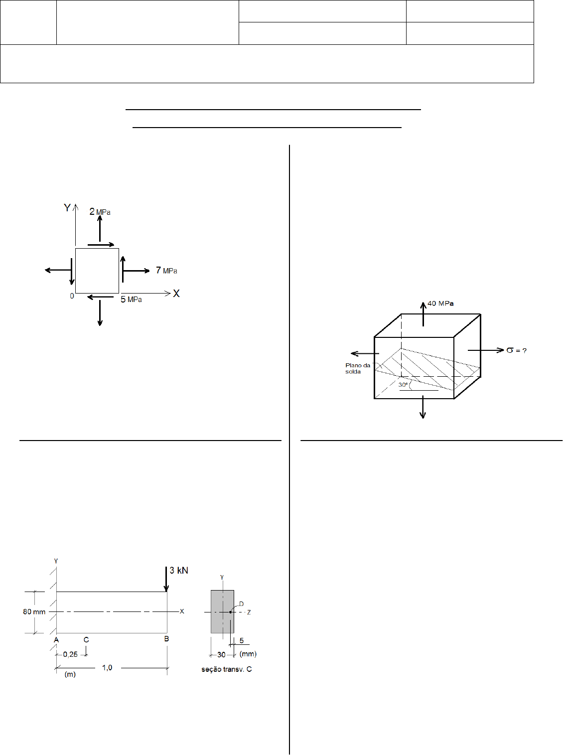 UMC RESISTÊNCIA DOS MATERIAIS III Prof. Márcio Cintra CURSO: Enga. ________ TURMA:__________________ DATA: _____/____/_____ ALUNO:............……………………………………………………………………..RGM:………........………….. Lista 01- Data de apresentação: na data de realização da P1 Apresentar esta folha como capa da lista de exercícios. Para cada estado de tensão bidimensional a seguir determinar: 1) a) A representação gráfica para o estado plano de tensão com θ = - 30º. 2) Em função dos esforços internos atuantes em uma viga de seção transversal retangular constante, representar graficamente (com Ɵ = 0) o estado plano de tensões atuante no ponto “D” da seção transversal „C”. 3) Uma placa soldada está sujeita a uma tração biaxial conforme figura. Determinar a tensão “σ máxima” a ser aplicada na placa para que sejam atendidas as tensões admissíveis, normal (60 MPa) e de cisalhamento (25 MPa) atuantes no plano da solda. 4) O estado de tensão em um ponto é definido (com θ = zero) pelas tensões: σx= 20 MPa σy= - 10 MPa δxy= - 10 MPa Representar graficamente pela técnica do Círculo de Mohr: a) As tensões principais e de cisalhamento (máximo e mínimo). b) As tensões atuantes para o ponto em análise, com planos orientados de 30º (sentido anti-horário de rotação).
