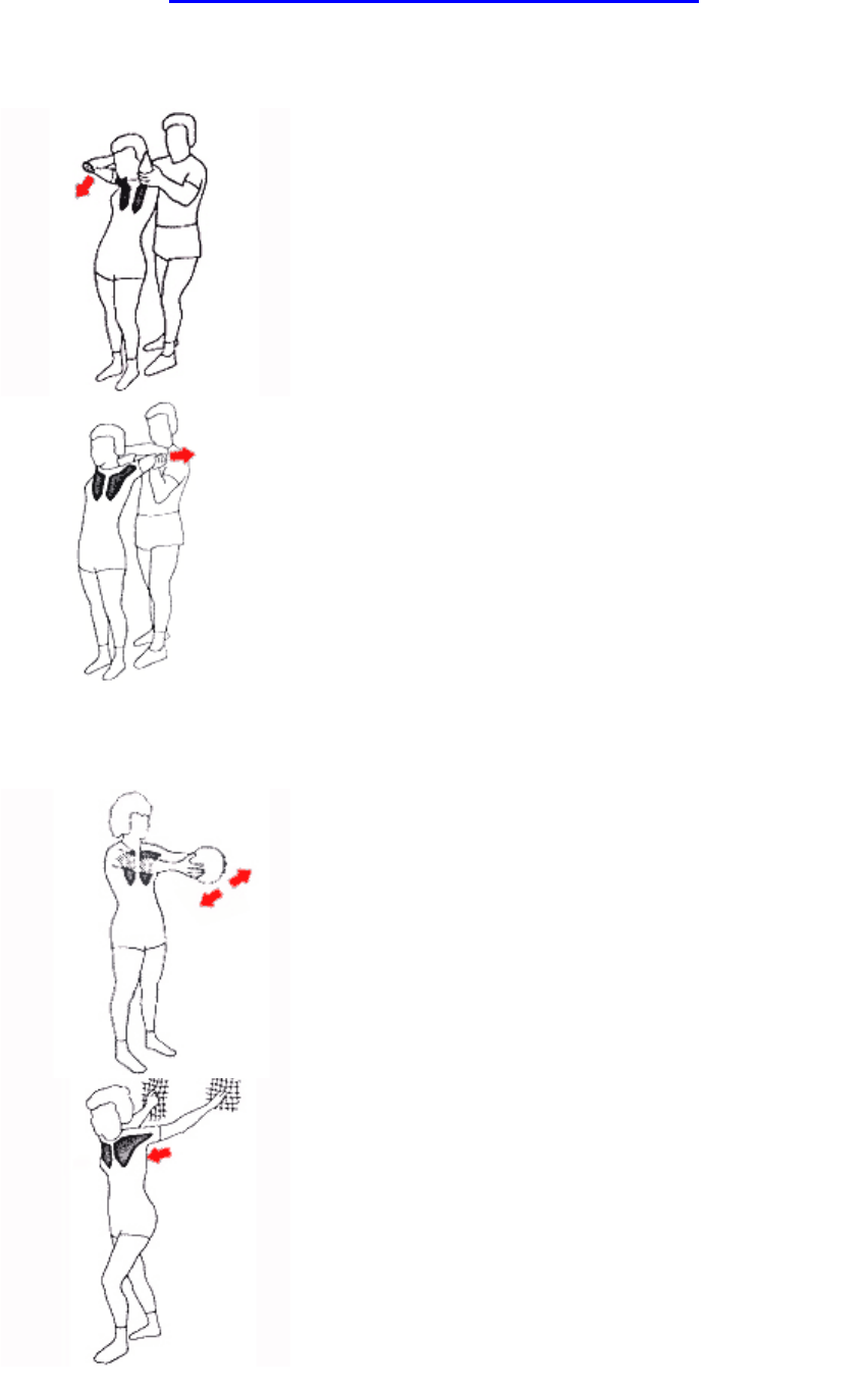 Alongamento de Membros Superiores 1. Músculos que movimentam o braço para a frente Músculo deltóide/porção ventral/m. peitoral maior. Função: Mover o braço levantado para a frente. A. Tensionar Cruze as mãos atrás da nuca e segure-as contra a cabeça. O seu companheiro de exercícios segurará seus cotovelos enquanto você estiver pressionando-os para a frente, por 20 segundos. B. Alongar Alongamento passivo, fazendo seu companheiro de exercícios puxar os cotovelos para trás e mantendo a posição por aproximadamente 20 segundos. 2. Musculatura Peitoral M. peitoral maior & menor, m. CoracobraquiaL Função: Mover o braço para a frente e para dentro na articulação do ombro abaixá-los e mover o ombro para a frente. A. Tensionar Com os braços estendidos para a frente, pressione as mãos uma contra a outra (com ou sem bola), com a maior força possível, por 20 segundos. B. Alongar Estenda os braços para trás e para cima, de forma passiva, e fique nesta posição por 20 segundos. segurando-se numa rede. O alongamento também pode ser feito com ajuda de um companheiro de exercícios, que segurará seus pulsos. Os dois exercícios acima podem ser feitos com um companheiro, taticamente. Fique de pé e apóie suas costas nas do companheiro. com as mãos um do outro, com os braços esticados para os lados. Primeiro tentem pressionar os braços para a frente com uma tensão muscular ativa. Depois, alonguem os braços esticados, separando-se um pouco um do outro, sem soltar as mãos. 3. Musculatura Peitoral M. peitoral maior. Função: Mover o braço para a frente (e para dentro) na articulação do ombro. A. Tensionar Com os braços estendidos para a frente, pressione as mãos uma contra a outra (com ou sem o auxílio de uma bola), com a maior força possível, por 20 segundos. B. Alongar Fique de pé, de frente para o canto de um cômodo. Coloque as mãos (ou os antebraços) contra as paredes e deixe o corpo cair para a frente. Pressione o corpo para dentro de tal forma que você sinta a tensão na frente da caixa torácica. Fique nesta posição por 20 segundos. A tensão “A” pode ser feita na mesma posição, no canto, como o alongamento. Porém não pressione o corpo de tão longe. 4. Musculatura Peitoral M. peitoral maior m. grande redondo. Função: Mover os braços para a frente e para baixo, de uma posição levantada. A. Tensionar De pé, com o corpo inclinado para frente, as pernas levemente separadas e as mãos bem afastadas uma da outra, segure-se numa barra ou algo semelhante. Pressione as mãos e os braços para baixo, com a maior força possível, e tente empurrar a barra para baixo, por 20 segundos. Sinta a tensão nos músculos peitorais. B. Alongar Pressione lentamente o tronco para baixo, segurando-se na barra, com os braços esticados, por 20 segundos. Sinta o alongamento no peito. Você pode tornar o alongamento mais proveitoso flexionando os joelhos ligeiramente. Variando a distância entre as mãos, você pode exercitar outras partes da musculatura peitoral. Colocando as mãos em diferentes alturas, você também muda a área de alongamento. 5. Os Grandes Músculos Peitorais M .peitoral maior. Função: Mover o braço para a frente, da articulação do ombro. A. Alongar Mantenha o antebraço na mesma posição de “A” e firme os pés no chão. Gire o tronco para fora e para a frente de maneira que o peito seja empurrado o mais possível para a frente. Sinta a tensão no peito, na parte anterior dos ombros. Fique nesta posição por 20 segundos. B.Tensionar De pé, apóie-se de lado no batente de uma porta e pressione sua mão ou o antebraço contra ele, com a maior força possível, durante 20 segundos. Alternativa: Em vez de usar o batente de uma porta, você pode segurar-se numa barra; de pé, de costas para a barra, tente puxar a barra como se quisesse arrancá-la. Faça o mesmo se você utilizar uma rede. Mudando a posição do braço para cima e para baixo, você pode exercitar diferentes partes da musculatura peitoral. 6. Musculatura Anterior do Ombro M. subescapular, m. peitoral maior/porção clavicular. Função: Girar o braço para dentro, na articulação do ombro. A. Tensionar Mantenha o cotovelo flexionado num angulo reto (90º), com os braços encostados nos lados do corpo. Pressione as mãos (com ou sem bola) uma contra a outra, com a maior força possível, por aproximadamente 20 segundos. B.Alongar Com a ajuda de um companheiro de exercícios, mova os braços para trás, alcançando a maior distância possível. A parte de cima dos braços continua junto aos lados do corpo. Fique nesta posição por 20 segundos. Este exercício também pode ser feito por você, sozinho, num canto da casa, no batente de uma porta ou em qualquer outro local semelhante. 8. Músculos Posteriores do Ombro M. deltóide, porção dorsal (tri. grande dorsal, m. trapézio). Função:Mover o braço para trás, quando este é levantado em ângulo reto (90 graus) em relação ao corpo, cotovelo também flexionado em ângulo reto (90 graus). A. Tensionar Puxe um cotovelo, cruzando o peito em direção ao outro ombro. Nesta posição, pressione o cotovelo com a outra mão, com a maior força possível, para a frente e para fora, por 10 a 15 segundos. B. Alongar Pressione o cotovelo, com a maior força possível, com a outra mão, em direção ao outro ombro. Fique nesta posição por 10 a 15 segundos. 9. Músculos Posteriores do Braço e Músculos Laterais Superiores das Costas M.tríceps braquial, porção escapular, m. grande dorsal, m. deltóide, m. grande redondo. Função: Mover o braço para a frente e para baixo, com o cotovelo levantado. A. Tensionar Fique de pé, em frente a uma parede, e levante o cotovelo, mantendo o antebraço esticado para trás da cabeça. Pressione o cotovelo, com a maior força possível, contra a parede, por 15 segundos. Alternativa: Você também pode usar a outra mão como elemento de resistência. B. Alongar Flexione o braço