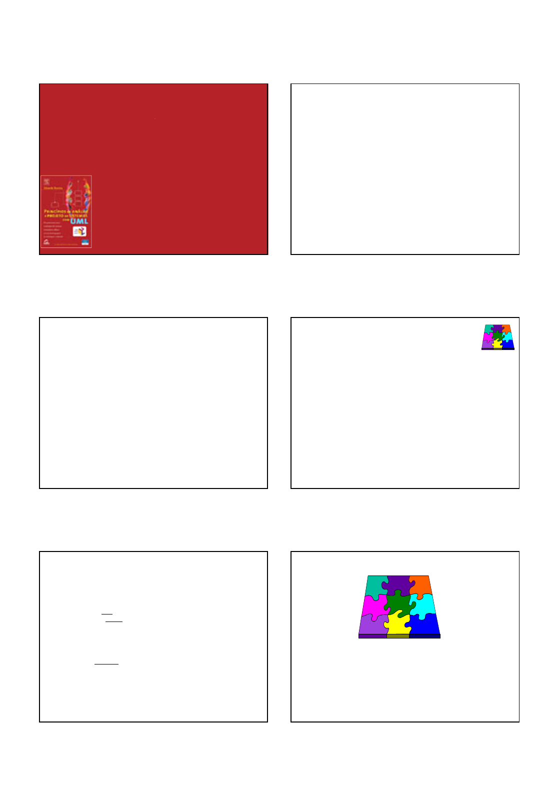 •Modelagem de Software usando UML •1 Princípios de Análise e Projeto de Sistemas com UML 2ª edição Eduardo Bezerra Editora Campus/Elsevier Universidade Federal de Santa Maria Politécnico Sistemas para Internet Modelagem de Estados Disciplina: Modelagem de Software usando UML Material disponibilizado pelo autor do livro Princípios de Análise e projeto de Sistemas com UML, Eduardo Bezerra, 2 ed, Ed. Campus, 2007. Capítulo 9 Modelagem de estados Todos os adultos um dia foram crianças, mas poucos se lembram disso. --O Pequeno Príncipe, Antoine de Saint-Exupéry Princípios de Análise e Projeto de Sistemas com UML - 2ª edição 4 Tópicos • Introdução • Diagramas de transição de estados • Identificação dos elementos de um diagrama de estados • Construção de diagramas de transição de estados • Modelagem de estados no processo de desenvolvimento Princípios de Análise e Projeto de Sistemas com UML - 2ª edição 5 Introdução • Objetos do mundo real se encontram em estados particulares a cada momento. – uma jarra está cheia de líquido – uma pessoa está cansada. • Da mesma forma, cada objeto participante de um sistema de software orientado a objetos se encontra em um estado particular. • Um objeto muda de estado quando acontece algum evento interno ou externo ao sistema. • Durante a transição de um estado para outro, um objeto realiza determinadas ações dentro do sistema. • Quando um objeto transita de um estado para outro, significa que o sistema no qual ele está inserido também está mudando de estado. 9.1 Diagramas de transição de estados •Modelagem de Software usando UML •2 Princípios de Análise e Projeto de Sistemas com UML - 2ª edição 7 Diagrama de transição de estado • Através da análise das transições entre estados dos objetos de um sistema de software, podem-se prever todas as possíveis operações realizadas, em função de eventos que possam ocorrer. • O diagrama da UML que é utilizado para realizar esta análise é o diagrama de transição de estado (DTE). • A UML tem um conjunto rico de notações para desenhar um DTE. – Estados – Transições – Evento – Ação – Atividade – Transições internas – Estados aninhados – Estados concorrentes Princípios de Análise e Projeto de Sistemas com UML - 2ª edição 8 Estado • Situação na vida de um objeto em que ele satisfaz a alguma condição ou realiza alguma atividade. É função dos valores dos atributos e (ou) das ligações com outros objetos. – O atributo reservado deste objeto livro tem valor verdadeiro. – Uma conta bancária passa para o vermelho quando o seu saldo fica negativo. – Um professor está licenciado quando não está ministrando curso algum durante o semestre. – Um tanque está na reserva quando nível de óleo está abaixo de 20%. – Um pedido está atendido quando todos os seus itens estão atendidos. • Estados podem ser vistos como uma abstração dos atributos e associações de um objeto. Princípios de Análise e Projeto de Sistemas com UML - 2ª edição 9 Estados inicial e final • O estado inicial indica o estado de um objeto quando ele é criado. Só pode haver um estado inicial em um DTE. – Essa restrição serve para definir a partir de que ponto um DTE deve começar a ser lido. • O estado final é representado como um círculo “eclipsado” e indica o fim do ciclo de vida de um objeto. – é opcional e pode haver mais de um estado final em um DTE. • Notação da UML para estados: Princípios de Análise e Projeto de Sistemas com UML - 2ª edição 10 • Os estados estão associados a outros pelas transições. • Uma transição é mostrada como uma linha conectando estados, com uma seta apontando para um dos estados. • Quando uma transição entre estados ocorre, diz-se que a transição foi disparada. • Uma transição pode ser rotulada com uma expressão da seguinte forma: evento (lista-parâmetros) [guarda] / ação Transições Princípios de Análise e Projeto de Sistemas com UML - 2ª edição 11 Eventos • Uma transição possui um evento associado. • Um evento é algo que acontece em algum ponto no tempo e que pode modificar o estado de um objeto: – Pedido realizado – Fatura paga – Cheque devolvido • Os eventos relevantes a um sistema de software podem ser classificados em nos seguintes tipos. 1. Evento de chamada: recebimento de uma mensagem de outro objeto. 2. Evento de sinal: recebimento de um sinal. 3. Evento temporal: passagem de um intervalo de tempo predefinido. 4. Evento de mudança: uma condição que se torna verdadeira. Princípios de Análise e Projeto de Sistemas com UML - 2ª edição 12 Tipos de Evento • Evento de chamada – corresponde ao recebimento de uma mensagem de outro objeto. – Pode-se pensar neste tipo de evento como uma solicitação de serviço de um objeto a outro. • Evento de sinal – Neste evento o objeto recebe um sinal de outro objeto que pode fazê-lo mudar de estado. – A diferença básica entre o evento de sinal e o evento de chamada é que neste último o objeto que envia a mensagem fica esperando a execução da mesma. • No evento de sinal, o objeto remetente continua o seu processamento após ter enviado o sinal. •Modelagem de Software usando UML •3 Princípios de Análise e Projeto de Sistemas com UML - 2ª edição 13 Tipos de Evento (cont.) • Evento de temporal – Corresponde à passagem de um intervalo de tempo predefinido. • O objeto pode interpretar a passagem de um certo intervalo de tempo como sendo um evento. – É especificado com a cláusula after seguida de um parâmetro que especifica um intervalo de tempo. • after(30 segundos): indica que a transição será disparada 30 segundos após o objeto ter entrado no estado atual. • Evento de mudança – Corresponde a uma condição que se torna verdadeira. – É representado por uma expressão de valor lógico (verdadeiro ou falso) e