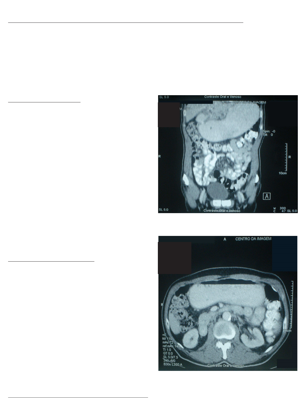 430 Rev. Col. Bras. Cir. 2013; 40(5): 430-432 Garr i tanoGarr i tanoGarr i tanoGarr i tanoGarr i tano Síndrome de estenose pilórica por adenocarcinoma de piloroRelato de CasoRelato de CasoRelato de CasoRelato de CasoRelato de Caso Síndrome de estenose pilórica por adenocarcinoma de piloroSíndrome de estenose pilórica por adenocarcinoma de piloroSíndrome de estenose pilórica por adenocarcinoma de piloroSíndrome de estenose pilórica por adenocarcinoma de piloroSíndrome de estenose pilórica por adenocarcinoma de piloro Pyloric stenosis due to adenocarcinoma of the pylorusPyloric stenosis due to adenocarcinoma of the pylorusPyloric stenosis due to adenocarcinoma of the pylorusPyloric stenosis due to adenocarcinoma of the pylorusPyloric stenosis due to adenocarcinoma of the pylorus CÉLIA REGINA DE OLIVEIRA GARRITANO, TCBC-RJ1; JOSÉ CARLOS GUIMARÃES GOMES, ACBC-RJ2; RAFAEL DOMINGOS DA SILVA3; RAFAEL THOME DA SILVA DE SOUSA3 Trabalho realizado no Hospital da Venerável Ordem Terceira de São Francisco da Penitência, Rio de Janeiro, RJ. 1. Professora Associada da Clínica Cirúrgica “A”, da Universidade Federal do Estado do Rio de Janeiro, UNIRIO – Rio de Janeiro – RJ-BR; 2. Chefe da Cirurgia Geral do Hospital São Francisco da Penitência; 3. Graduação em Medicina da Universidade Federal do Estado do Rio de Janeiro, UNIRIO. INTRODUÇÃOINTRODUÇÃOINTRODUÇÃOINTRODUÇÃOINTRODUÇÃO Os adenocarcinomas, linfomas, sarcomas e tumores carcinoides representam de 1% a 5% de todos os tumores malignos gastrointestinais. O tipo mais comum de câncer de duodeno é o adenocarcinoma1,2, sendo respon- sável por 50% dos casos2,3. Foi descrito pela primeira vez por Hamberger, em 17463-5. Acomete mais o sexo mascu- lino, sexta e sétima décadas de vida, ocorrendo, preferen- cialmente, na região periampular5. O acometimento da primeira, terceira e quarta porções, é raro, especialmente na região pilórica, repre- sentando somente 0,35% dos cânceres do sistema digesti- vo, com poucos relatos descritos na literatura1. O reconhecimento precoce dos sintomas e a di- ferenciação com outras doenças de caráter benigno são importantes para que seja feita uma opção adequada de tratamento, reduzindo, assim, a morbidade e a mortalida- de. Relatamos uma síndrome de estenose pilórica ocasionada por adenocarcinoma de piloro. RELATO DO CASORELATO DO CASORELATO DO CASORELATO DO CASORELATO DO CASO Sexo masculino, 71 anos, com queixa de pleni- tude pós-prandial, desconforto em epigástrio, queimação retroesternal e dispepsia. Foi submetido a duas endoscopias digestivas altas (EDA), que não foram conclusivas. Fez tra- tamento com sintomáticos, obtendo melhora. Após quatro meses, os sintomas se agravaram, sendo realizada outra EDA, que evidenciou uma grande quantidade de resíduo gástrico, não sendo feita biópsia. Foi solicitada uma tomografia computadorizada (TC) abdominal, que eviden- ciou o estômago dilatado, cheio de resíduos, esvaziamen- to retardado, caracterizando um quadro obstrutivo (Figuras 1 e 2). O paciente foi internado para realização de exa- mes laboratoriais, correção de distúrbios hidroeletrolíticos e encaminhado para o tratamento cirúrgico. Durante a operação foi identificada dilatação gástrica e estenose cer- rada do piloro, com aspecto sugestivo de malignidade. Figura 2 -Figura 2 -Figura 2 -Figura 2 -Figura 2 - TC abdominal – grande quantidade de resíduos no estômago. Figura 1 Figura 1 Figura 1 Figura 1 Figura 1 - TC abdominal – grande dilatação gástrica e estenose pilórica. Garr i tanoGarr i tanoGarr i tanoGarr i tanoGarr i tano Síndrome de estenose pilórica por adenocarcinoma de piloro 431 Rev. Col. Bras. Cir. 2013; 40(5): 430-432 Foi realizada a gastrectomia subtotal alargada. O laudo histopatológico da peça cirúrgica evidenciou adenocarcinoma de piloro, invadindo a serosa, com metástase para um linfonodo localizado na pequena curva- tura. A evolução pós-operatória foi satisfatória, com o paci- ente obtendo alta hospitalar em boas condições clínicas. DISCUSSÃODISCUSSÃODISCUSSÃODISCUSSÃODISCUSSÃO A maioria dos casos de obstrução pilórica tem como principal suspeita clínica a doença ulcerosa péptica, e, pela raridade de adenocarcinomas nesta região, estes tumores não são comumente considerados como uma pro- vável causa. A demora na identificação da doença é refle- tida na presença de metástases. O diagnóstico é geralmente feito quando há com- plicações, como estenose, hemorragia, ou somente duran- te o ato cirúrgico. Isto acontece porque os sintomas inespecíficos1,3,5, como perda ponderal, náuseas, vômitos, anorexia, dor abdominal e anemia ferropriva, são também encontrados em outras doenças. Foi o que ocorreu no caso apresentado. A endoscopia digestiva alta é o principal méto- do para o diagnóstico, embora uma obstrução cerrada e a presença de resíduos no estômago possam dificultar o pro- cedimento. No caso relatado, a EDA não foi conclusiva, talvez pelo fato de não ter sido realizado um preparo ade- quado para o completo esvaziamento gástrico com o intui- to de se ter uma boa visualização para coleta de material da lesão. A tomografia computadorizada e a ressonância nuclear magnética são exames complementares à EDA, na tentativa de identificar a causa de uma obstrução pilórica, ou, se já estabelecido o diagnóstico de neoplasia, como métodos para o estadiamento. No caso apresenta- do, a TC evidenciou um quadro obstrutivo, sem identificar a causa. O tratamento dos cânceres do intestino delgado é cirúrgico, sendo a duodenopancreatectomia o procedi- mento de escolha para os tumores da segunda porção do duodeno, podendo também ser utilizado para neoplasias de primeira e terceira porções4. No tumor de piloro, a indi- cação é a gastrectomia subtotal alargada, procedimento realizado no caso apresentado. Os tratamentos quimio e radioterápico não influ- enciam a