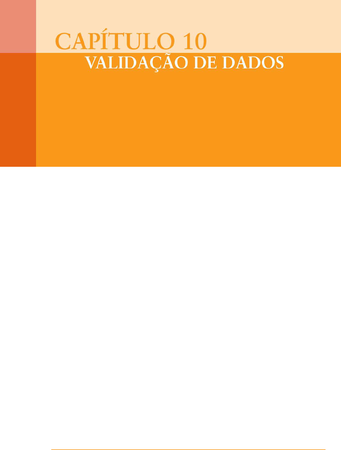 Excel 2010 – Avançado Senac São Paulo 181 OBJETIVOS Restringir a introdução de dados nas planilhas. Excel 2010 – Avançado 182 Senac São Paulo Excel 2010 – Avançado Senac São Paulo 183 Atividade 1 – Criar regras de validação Objetivo : • Determinar quais dados pode ser introduzido nas planilhas. Tarefa : • Definir as regras para aceitação dos dados introduzidos na planilha. Algumas planilhas podem conter restrições quanto às informações que podem ser introduzidas em determinadas colunas. Neste caso precisamos estabelecer quais serão os critérios para aceitação ou não dos dados introduzidos. Para esse fim utilizamos o recurso Validação de Dados. 1. Abra o arquivo Validação.xlsx. 2. Selecione a coluna A clicando no botão seletor. 3. Clique no botão Validação de Dados do grupo Ferramentas de Dados da guia Dados. 4. Na caixa de combinação Permitir: escolha Data. 5. Na caixa de combinação Dados: escolha é maior do que. 6. Em Data de inicio: digite 30/09/10. Somente datas posteriores à data de início serão aceitas. Excel 2010 – Avançado 184 Senac São Paulo 7. Clique em OK. Vá para o final da planilha e introduzida dados na primeira linha disponível. 8. Informe a data de 10/05/10. A Validação de Dados está restringindo os dados desta coluna para datas posteriores a 30/09/10. Portanto uma mensagem de erro surge informando que a regra foi violada. 9. O botão Repetir permite que você volte à célula e digite uma data válida. O botão Cancelar desconsidera a digitação e retorna o valor anterior da célula. Clique em Repetir e digite uma data válida. Os dados da coluna Projeto devem pertencer a uma lista de projetos já definidos na planilha Projetos. 10. Clique na planilha Projetos. A lista desta planilha é a que deve ser considerada a digitação da coluna Projeto. 11. Selecione a coluna A. 12. Clique na caixa de nome para definir um nome para o intervalo selecionado. 13. Digite Projetos e finalize com ENTER. 14. Volte à planilha Dados. 15. Selecione a coluna B. 16. Clique no botão Validação de Dados do grupo Ferramentas de Dados da guia Dados. 17. No campo Permitir escolha Lista. 18. No campo Fonte: digite =Projetos. 19. Desmarque a opção Ignorar em branco. Excel 2010 – Avançado Senac São Paulo 185 20. Você pode associar uma Mensagem de entrada às células que recebem a Validação de Dados como forma de auxílio ao digitador. Clique na guia Mensagem de entrada. 21. Preencha os campos Título e Mensagem de entrada. Esta mensagem ficará visível quando a célula for ativada. 22. Você também pode substituir o alerta de erro padrão por um alerta de erro personalizado. Clique na guia Alerta de erro. 23. Preencha o Título e a Mensagem de erro. Tecle ENTER para continuar o texto em outra linha. 24. Escolha o Estilo do quadro de mensagem. Excel 2010 – Avançado 186 Senac São Paulo - O estilo Parar apresenta os botões Repetir para voltar à célula no modo de edição, e o botão Cancelar para retornar ao conteúdo anterior da célula. Neste estilo não há possibilidade de introduzir algum dado que infrinja o critério. - O estilo Aviso apresenta o botão Sim para aceitar o dado digitado, Não para rejeitá-lo e voltar à digitação e Cancelar para retornar o dado anterior. - O estilo Informações exibe o botão OK para aceitar o dado digitado e o botão Cancelar para retornar o dado anterior. 25. Escolha Aviso ou Informações. 26. Clique em OK. Excel 2010 – Avançado Senac São Paulo 187 Agora você aplicará a validação de dados à coluna E/S para aceitar os valores Entrada ou Saída. 27. Selecione a coluna E. 28. Clique no botão Validação de Dados do grupo Ferramentas de Dados da guia Dados. 29. Em Permitir: escolha Lista. 30. No campo Fonte: digite Entrada e Saída separados por ponto e vírgula (;). 31. Escolha o estilo de alerta de erro e preencha os campos Título e Mensagem de erro. 32. Clique em OK. 33. Os valores a serem introduzidos em Valor – coluna F – não podem ser menores ou iguais a zero e nem maiores que 10 milhões. Você aplicará a validação de dados para que este critério seja respeitado. Selecione a coluna F. 34. Clique no botão Validação de Dados do grupo Ferramentas de Dados da guia Dados. 35. Em Permitir: escolha Decimal. 36. Preencha o campo Mínimo: com 1 e o campo Máximo: com 10000000. 37. Defina o Alerta de erro e clique em OK. 38. Complete as informações das colunas restantes. Excel 2010 – Avançado 188 Senac São Paulo Exercício Proposto 1. Abra a pasta validaexercício.xlsx . 2. Coloque restrições para que a coluna Estado civil apresente uma lista com Casado(a), Solteiro(a), Viúvo(a), Separado(a). 3. Na coluna Sexo deve aparecer uma lista com Masculino e Feminino. 4. Na coluna Nascimento somente devem ser aceitas pessoas nascidas antes de 1996. 5. Na coluna Salário o limite superior é 18.000.