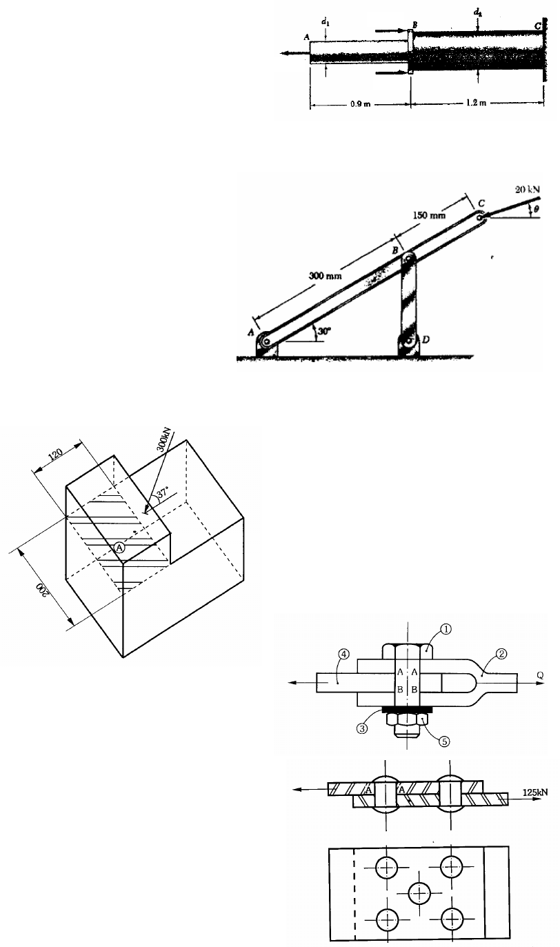 Mecânica dos Sólidos II Prof. Denis Rinaldi Petrucci Lista de Exercícios Tensões 1 – Duas barras cilíndricas AB e BC são unidas em B, como mostra a figura. Sabendo que os diâmetros d1 = 30 mm e d2 = 50 mm. Determine as tensões: a) Na barra AB; (84,9 MPa) b) Na barra BC. (-96,8 MPa) 2 – Supondo para a figura acima, a tensão admissível do material das barras σadm = 150 MPa, tanto para tração como para compressão, determine os diâmetros para as seções AB e BC. (d1 = 22,6 mm e d2 = 40,2 mm) 3 – A barra BD de seção transversal retangular de 30 X 12 mm, e o diâmetro dos pinos são de 10 mm. Determine para a barra BD: a) A tensão normal, se o ângulo θ = 0° (sem considerar os pinos). (48,11 MPa) b) A tensão normal máxima, se o ângulo for θ= 0°. (72,2 MPa) c) A tensão normal, se o ângulo θ = 90°. (-83,3 MPa) d) A tensão normal máxima, se o ângulo for θ = 90°. (-125 MPa) 4 – Determine as tensões normal e de cisalhamento que atua no plano A da figura. (σ = -7,52 MPa e τ = 9,98 MPa) 5 – Para a figura abaixo a carga Q aplicada é de 6 kN. Determine: a) A tensão de cisalhamento Atuante no pino. (τ = 26,5 MPa) b) A tensão de esmagamento na haste central. (σesm = 62,5 MPa) c) A tensão de esmagamento nas hastes do garfo. (σesm = 41,7 MPa) Legenda: 1 – Parafuso; 2 – Haste em garfo; 3 – arruela; 4 – haste central; 5 – Porca sextavada. 6 – Para uma junta rebitada que suporta uma carga de 125 kN, aplicada conforme a figura, determine o diâmetro mínimo para os cinco rebites, sabendo que a tensão de cisalhamento admissível do material do rebite é 105 MPa e a tensão de esmagamento do rebite é 225 MPa e que a espessura da chapa é de 8 mm. (d =18 mm) 60 kN 125 kN 125 kN Mecânica dos Sólidos II Prof. Denis Rinaldi Petrucci 7 – Determinar a relação entre a espessura da chapa e o diâmetro do rebite em uma chapa simplesmente cisalhada, para que somente o dimensionamento ao cisalhamento seja suficiente no projeto da junta. (Lembre-se que o número de rebites necessários ao cisalhamento tem de ser maior ou igual ao número de rebites necessários ao esmagamento ou nc ≥nesm). Dados: τ reb = 105 MPa e σesm = 225 MPa ( d e ≥0,37) 8 – Para a treliça da figura, determine a tensão normal na haste BE, sabendo que a seção transversal tem área de 5,87 in2. (8,52 kgf/in2) 9 – Um momento M = 1500 Nm é aplicado conforme figura, o ponto A permite apenas rotação em torno de seu eixo.. Determine a força P aplicada para manter o equilíbrio na condição apresentada na figura e a tensão normal na barra BC, sendo a área de sua seção transversal de 450 mm2. (17,86 kN e σBC = -41,4 MPa) 10 – Duas placas de madeira de 2,5 cm de espessura e 16 cm de largura são unidas por cola, conforme figura. Determine o comprimento d necessário para que as placas suportem a força axial P = 1200 N, sabendo que a tensão de cisalhamento admissível da cola é 120 kPa. (57,14 mm) 11 – A haste BC de seção transversal 6 X 25 mm é feita de material que suporta 480 MPa. Qual a tensão que a barra suporta se a força P = 16 kN. Determine também a relação entre a força ultima que a barra pode suportar e a força suportada pela barra. (σ BC = 133 MPa, BCF Fu = 3,6) 12 – Para a treliça da figura as tensões nas barras AB, BC e AC, sabendo que a área das seções transversais são iguais, A = 400 mm2. (ainda não tenho as respostas) 13 – Determinar o diâmetro dos parafusos da figura sabendo que a tensão admissível do material do parafuso é de 52 MPa e a força aplicada é de 24 kN. (14 mm) 80 kgf 80 kgf 80 kgf H cola 2 cm 2 cm 16 cm P P d 28 kN 24 kN Mecânica dos Sólidos II Prof. Denis Rinaldi Petrucci Deformações 1 - 2- 3- Mecânica dos Sólidos II Prof. Denis Rinaldi Petrucci 4-