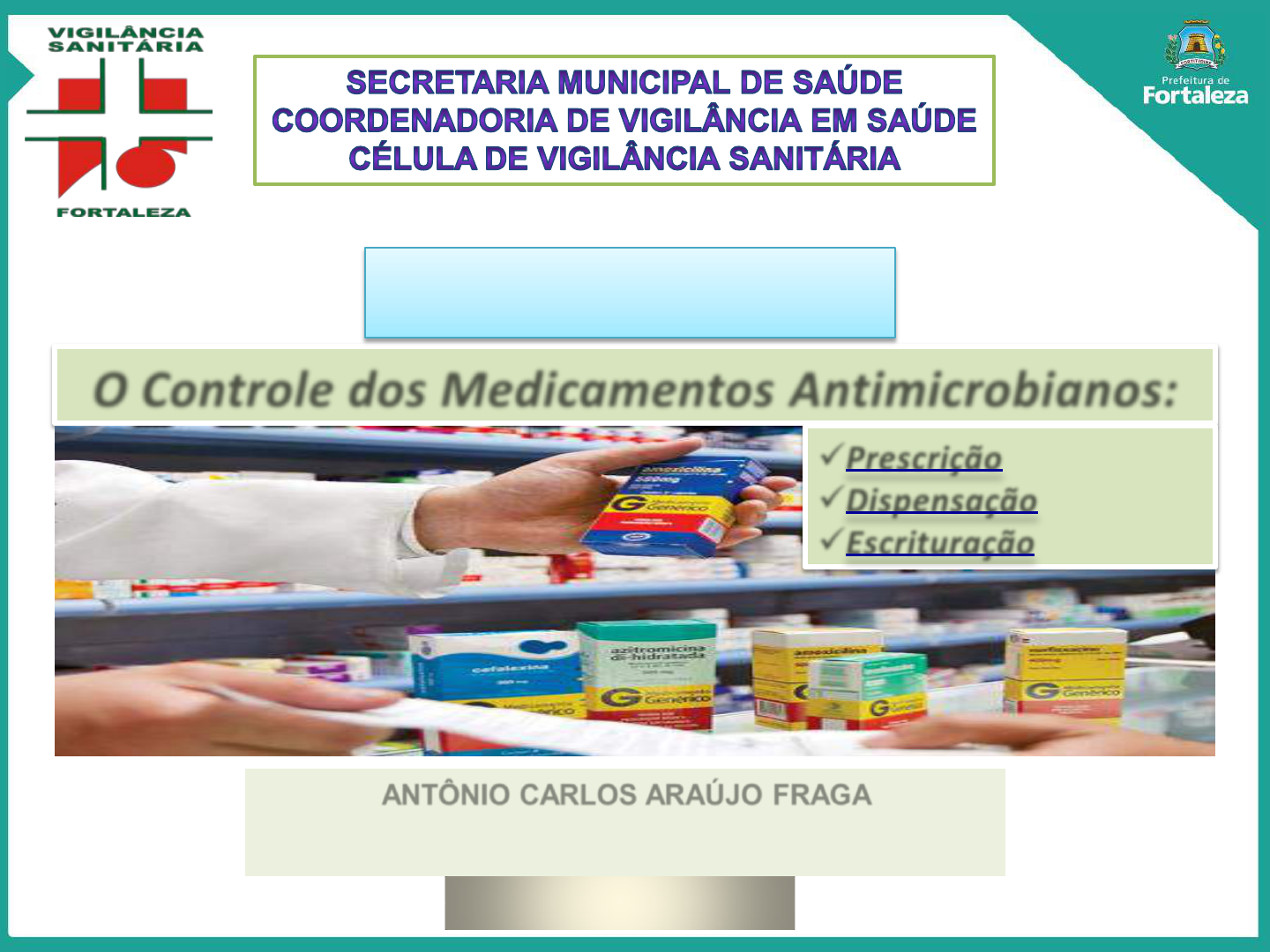 O Controle dos Medicamentos Antimicrobianos: Fortaleza-CE 2015 ANTÔNIO CARLOS ARAÚJO FRAGA Farmacêutico / Fiscal Municipal de Vigilância Sanitária Especialista em Vigilância Sanitária RDC Nº 20/2011 Prescrição Dispensação Escrituração APRESENTAÇÃO O objetivo do controle de antimicrobianos; A operacionalização da RDC Nº20/2011 tem gerado confusões, principalmente no momento da prescrição e da dispensação; Na RDC Nº20/2011 e na NT (atualizada em 24/09/13) muitos aspectos práticos ainda não estão claramente definidos; As responsabilidades dos prescritores e dos dispensadores; A fiscalização do cumprimento da RDC Nº20/2011; A avaliação da prescrição é atribuição do farmacêutico, conforme estabelece a resolução CFF Nº357/01 e resolução Anvisa RDC Nº44/09, avaliação esta que deve abordar tanto aspectos terapêuticos quanto legais, cabendo assim a este profissional conhecer as exigências legais para uma correta avaliação da prescrição, podendo, conforme previsto no Código de Ética Farmacêutica, decidir sobre o aviamento ou não de qualquer prescrição, desde que devidamente justificada sua decisão”. RDC Nº 20, de 5 de maio de 2011 - Dispõe sobre o controle de medicamentos à base de substâncias classificadas como antimicrobianos, de uso sob prescrição, isoladas ou em associação; NOTA TÉCNICA sobre a RDC Nº20/2011 - Orientações de procedimentos relativos ao controle de medicamentos à base de substâncias classificadas como antimicrobianos, de uso sob prescrição isoladas ou em associação. (Atualizada em 24 de setembro de 2013 - O documento poderá ser atualizado conforme necessidade identificada pela autoridade sanitária). RDC Nº 22, de 29 de abril de 2014 - Dispõe sobre o Sistema Nacional de Gerenciamento de Produtos Controlados. Lei Federal Nº 5.991, de 17 de Dezembro de 1973 – Dispõe sobre o controle sanitário de comércio de drogas, medicamentos, insumos farmacêuticos e correlatos. RDC Nº 44, de 17 de Agosto de 2009 - Dispõe sobre Boas Práticas Farmacêuticas para o controle sanitário do funcionamento, da dispensação e da comercialização de produtos e da prestação de serviços farmacêuticos em farmácias e drogarias e dá outras providências. RDC Nº 68, de 28 de novembro de 2014 - Dispõe sobre a atualização do Anexo I, Lista de Antimicrobianos Registrados na Anvisa, da Resolução – RDC nº 20, de 5 de maio de 2011 e dá outras providências. As orientações contidas nesta apresentação obedecem ao disposto nas seguintes legislações: Ficam revogadas as Resoluções de Diretoria Colegiada : RDC Nº 44, de 26 de outubro de 2010 RDC Nº 61, de 17 de dezembro de 2010 RDC Nº 17, de 15 de abril de 2011 RES. CFF Nº 542, de 19 de JANEIRO de 2011 - Dispõe sobre as atribuições do farmacêutico na dispensação e no controle de antimicrobianos. Não poderão ser aviadas receitas ilegíveis e/ou que possam induzir a erro ou troca na dispensação dos antimicrobianos ou que se apresentem em código, sigla, número, etc. No ato da dispensação de qualquer antimicrobiano: O farmacêutico deve explicar clara e detalhadamente ao paciente/usuário o benefício do tratamento. Deve considerar que a educação/orientação ao paciente/usuário é fundamental não somente para a adesão ao tratamento, como também para a minimização de ocorrência de resistência bacteriana. Deve, ainda, certificar-se de que o paciente/usuário não apresenta dúvidas a respeito de aspectos, como: I - motivos da prescrição, contraindicações e precauções; II - posologia (dosagem, dose, forma farmacêutica, técnica, via e horários de administração); III - modo de ação; IV – reações adversas e interações; V - duração do tratamento; VI - condições de conservação, guarda e descarte. Para otimizar a dispensação, o farmacêutico deverá ser capaz de tomar atitudes, desenvolver habilidades de comunicação e estabelecer relações interpessoais com o paciente/usuário. O farmacêutico deve fornecer toda a informação necessária para o uso correto, seguro e eficaz dos antimicrobianos, de acordo com as necessidades individuais do paciente/usuário. AS PRINCIPAIS EXIGÊNCIAS - RDC nº 20, de 05 de maio de 2011 Uma lista de 119 substâncias classificadas como antimicrobianas foi publicada em anexo à resolução e, todo e qualquer medicamento que possuir pelo menos uma dessas substâncias em sua composição, somente será liberado com a apresentação e retenção da receita. Estabelece os critérios para a prescrição, dispensação, controle, embalagem e rotulagem de medicamentos à base de substâncias classificadas como antimicrobianos de uso sob prescrição, isoladas ou em associação. Também se aplica a sais, éteres, ésteres e isômeros das substâncias antimicrobianas. ABRANGÊNCIA As farmácias e drogarias privadas, as unidades públicas de dispensação municipais, estaduais e federais que disponibilizam medicamentos mediante ressarcimento, a exemplo das unidades do Programa Farmácia Popular do Brasil. As unidades de dispensação municipais, estaduais e federais, as farmácias de unidades hospitalares ou de quaisquer outras unidades equivalentes de assistência médica, públicas ou privadas, que não comercializam medicamentos devem manter os procedimentos de controle específico de prescrição e dispensação já existentes para os medicamentos que contenham substâncias antimicrobianas. AS PRINCIPAIS EXIGÊNCIAS - RDC nº 20, de 05 de maio de 2011 ABRANGÊNCIA A prescrição dos medicamentos antimicrobianos deverá ser realizada por profissionais legalmente habilitados. AS PRINCIPAIS EXIGÊNCIAS - RDC nº 20, de 05 de maio de 2011 PRESCRIÇÃO AS PRINCIPAIS EXIGÊNCIAS - RDC nº 20, de 05 de maio de 2011 RECEITA A prescrição de medicamentos antimicrobianos deverá ser realizada em receituário privativo do prescritor ou do estabelecimento de saúde, não havendo, portanto modelo 