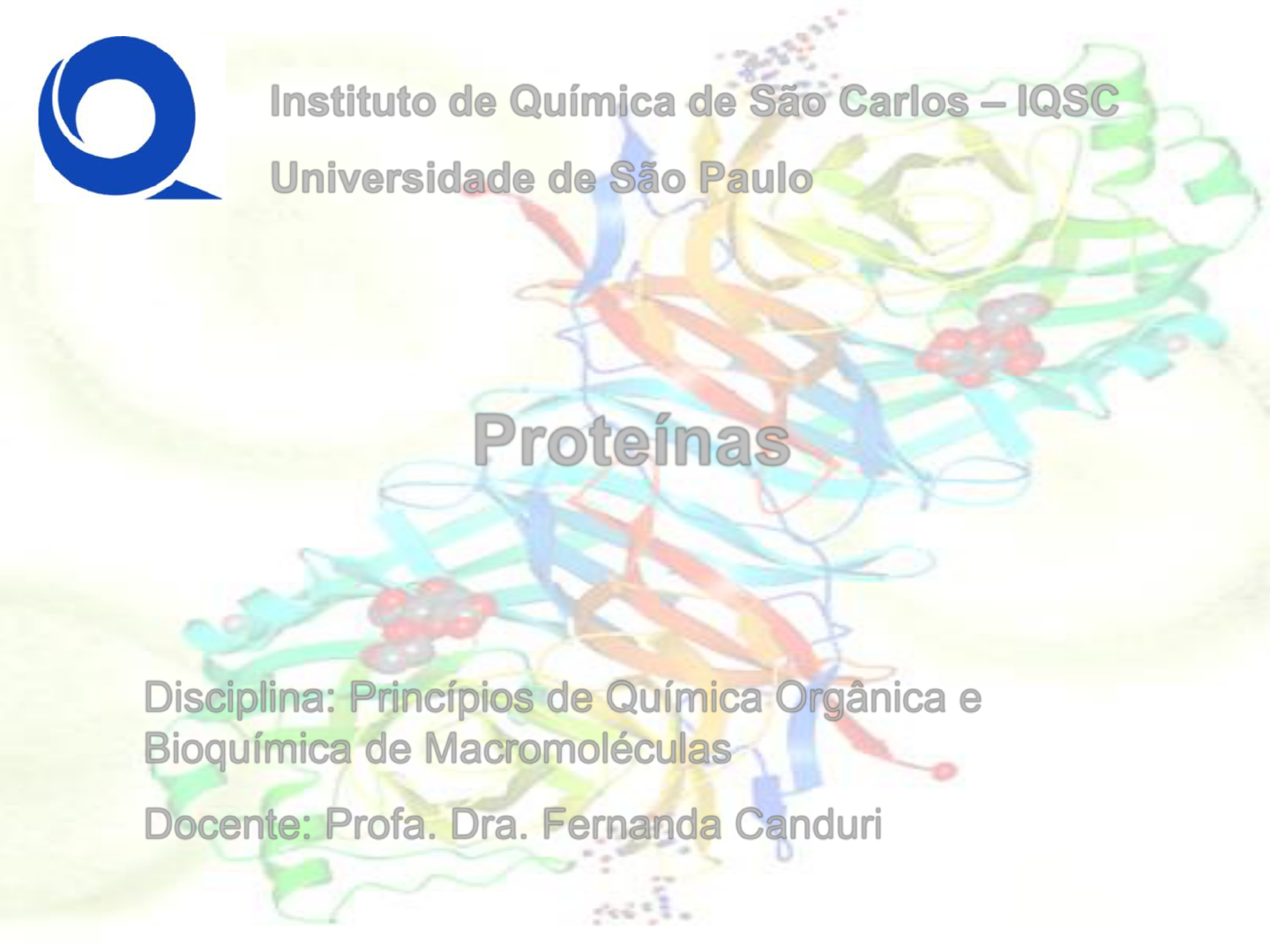 Instituto de Química de São Carlos – IQSC Universidade de São Paulo Proteínas Disciplina: Princípios de Química Orgânica e Bioquímica de Macromoléculas Docente: Profa. Dra. Fernanda Canduri A cadeia polipeptídica Ângulos de torção , e O gráfico de Ramachandran Níveis de estrutura protéica Estrutura primária A cadeia polipeptídica Hélice Alfa Distância entre resíduos adjacentes = 1,5 Å Rotação de 100o entre AA adjacentes = 3,6 resíduos por volta = passo 1 Passo = 5,4 Å Estrutura helicoidal à direita Estabilização por ligações de H entre aminoácidos (AA) próximos n + 4 paralelas à direção da cadeia n n+1 n+2 n+3 n+4 n+5 Estruturas secundárias A Hélice Interações entre os grupos R adjacentes podem estabilizar ou desestabilizar a Hélice Alfa presença de Gly e Pro Exemplo de proteína constituída de hélices Folha beta pregueada Estrutura distendida em ziguezague Estabilizada por ligações de H pela C–C=O e H–N– C da cadeia principal de AA distantes na seqüência de aminoácidos Distância entre os carbonos alfa de AA adjacentes de 3,5 Å Folha antiparalela Folha paralela Exemplo de proteína constituída de folhas Qual a diferença entre Fita e Folha ? Conectam os segmentos de Hélices Alfa e Folhas beta Mudam a direção da cadeia São estruturas estabilizadas por ligações de H entre os grupos C– C=O e H–N–C da cadeia principal do AA n e n + 3. Alças são segmentos maiores de 8 a 16 resíduos de AA Voltas Type II – presença de Gly e Pro Estrutura primária e secundária Estrutura Secundária Preferência relativa de estrutura Secundária pelos diferentes AA Depende da seqüência de AA – estrutura primária É possível predizer a estrutura secundária de uma seqüência por Bioinformática Plot de Ramachandran dos diferentes tipos de Estruturas secundárias Plot de Ramachandran da Piruvato quinase - Cada ponto representa 1 resíduo (Exceto Gly) Estrutura Supersecundária Combinações entre diferentes arranjos de estrutura secundária Formam domínios (ou motivos) característicos de famílias de proteínas Unidade βαβ Unidade alfa-alfa Meandro β Chave grega (Barril β) Barril Meandro β Estrutura terciária Relacionamento espacial entre todos os aminoácidos de um polipeptídeo Estrutura tridimensional Estabilizada por interações diversas entre as cadeias laterais e pontes dissulfeto Ligações de H têm pequena contribuição devido à competição com a água Pontes dissulfeto Ligações de H entre grupos R Atração eletrostática Interações hidrofóbicas Coordenação por íon metálico α Hélice Folha β Forças que estabilizam a estrutura protéica A estrutura terciária e quaternária Na estrutura terciária, aminoácidos da cadeia polipeptídica com características hidrofílicas tendem a permanecer na periferia, expostos ao solvente, enquanto aminoácidos hidrofóbicos, tendem a permanecer no interior da proteína. lisozima Malato desidrogenase (proteína dimérica) Proteína quinase (proteína trimérica) Estrutura Quaternária Reunião de diferentes subunidades Interações entre grupos laterais de cadeias diferentes Mesmas interações que na estrutura terciária Possuem diversos eixos de simetria cristalina Lactato desidrogenase (tetramérica) Estrutura quaternária Consiste de mais de uma cadeia polipeptídica unidas por diferentes interações, formando polímeros necessários para a função da proteína. (b) Succinato desidrogenase (complexo II CTE) Classificação segundo Scope - Structural Classification of Proteins Banco de dados de Proteínas - O PDB Two views of the map of the protein structure space. Hou J et al. PNAS 2005;102:3651-3656 ©2005 by National Academy of Sciences Classes Multidomínios Classes Classes Proteínas de membrana Pequenas proteínas Enovelamento de proteínas Ao longo da evolução, as células incorporaram mecanismos bastante eficientes para evitar que erros na transmissão da informação genética se propaguem na replicação, na transcrição e na tradução. Ainda assim, é possível que proteínas recém sintetizadas não consigam desempenhar suas funções por erro no enovelamento. Proteínas com multidomínios e multissubunidades, cujos componentes devem estar totalmente formados antes que se possam associar de modo correto entre si, necessitam de auxílio para tanto. Dogma de Anfinsen: As informações necessárias para uma proteína obter sua estrutura nativa estão na sequência de aminoácidos da proteína. Enovelamento protéico “O efeito hidrofóbico” A introdução de um composto hidrofóbico perturba a rede de água; A água tende a minimizar seu contato com as moléculas hidrofóbicas; Exclusão do composto apolar da fase aquosa Interações hidrofóbicas Formação de aglomerados apolares reduz a área de contato com a água Um conjunto de proteínas não-enoveladas no meio aquoso enovelam-se espontaneamente (ΔG < 0), para atingirem um estrutura organizada com baixa ΔS “O efeito hidrofóbico” Existem exceções à regra - as proteínas de membrana Linguagem de 20 aminoácidos permitem a diversidade estrutural das proteínas Enovelamento de proteínas As proteínas podem ser desnaturadas e renaturadas in vitro Agentes desnaturantes de proteínas freqüentemente utilizados no Laboratório de Bioquímica: Ácidos e detergentes, além de altas temperaturas Enovelamento de proteínas A proteína pode ser renaturada pela diálise e eliminação gradativa de um agente redutor A retirada do agente redutor de forma gradativa “catalisa” o enovelamento correto RNase A possui 4 pontes dissulfeto Reenovelamento Incorreto Enovelamento de proteínas O enovelamento é cooperativo O enovelamento ocorre de maneira hierárquica porções locais enovelam primeiro e sucessivamente Intermediários do enovelamento são observados Teoria do Funil Enovelamento de proteínas Existem proteínas que, além de auxiliar o enovelamento protéico, encaminha a proteína