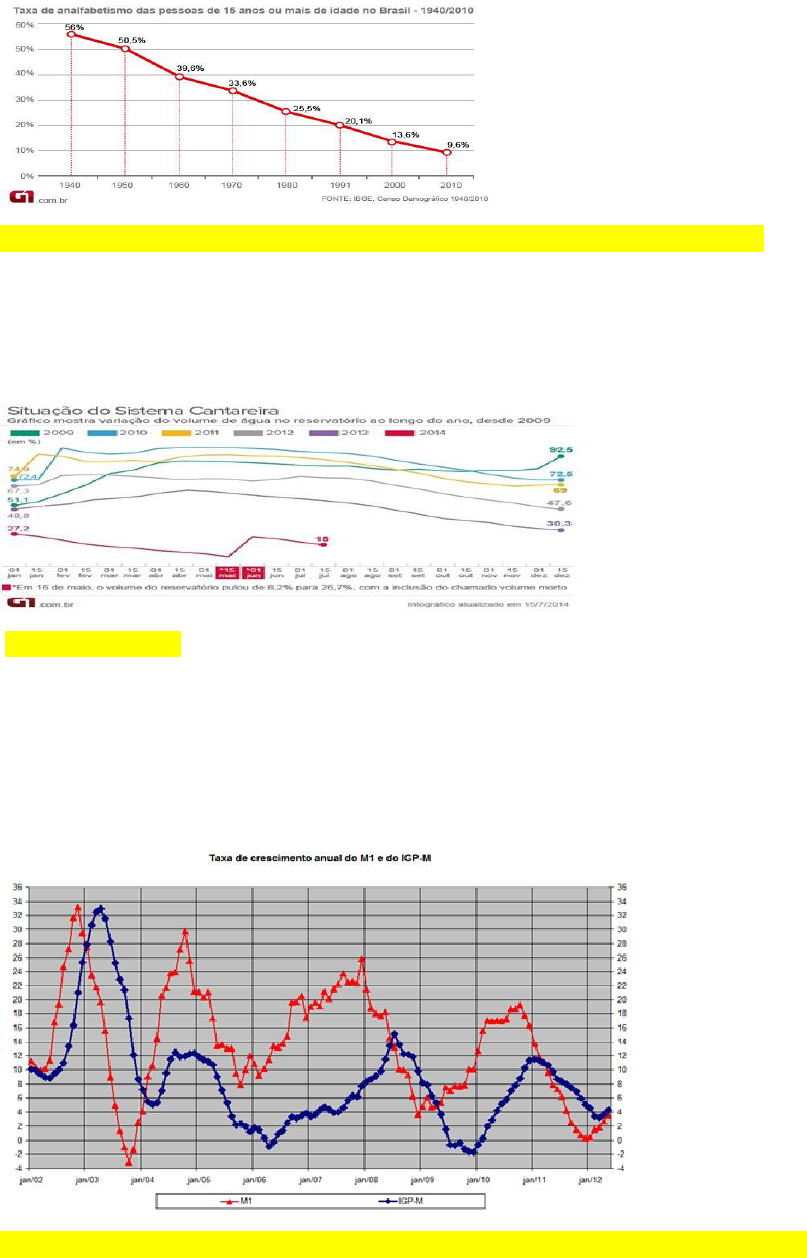 RACIOCÍNIO LÓGICO 1a Questão (Ref.: 201607893252) Marque a alternativa que apresenta a conclusão verdadeira sobre o analfabetismo no Brasil, a partir de 15 anos de idade, entre 1940 e 2010, com base na análise do gráfico mostrado. Certo A taxa de analfabetismo em 1980 foi aproximadamente 50% da taxa de 1950. 2a Questão (Ref.: 201607948176) O gráfico abaixo extraído da reportagem do G1.com.br, em 15/07/2014, mostra que o Sistema Cantareira, conjunto de reservatórios de água que abastece a região metropolitana de São Paulo e parte do interior do estado, opera atualmente com apenas 18% de seu volume total. Comparando o início e o fim, os anos que não ocorreram queda na reserva de água do Sistema Cantareira foram: Certo 2009 e 2010 3a Questão (Ref.: 201607948128) 1 - O gráfico a seguir mostra a variação anual do IGP-M (índice geral de preços de mercado) e a variação anual da oferta monetária M1 (papel moeda em poder do público mais contas correntes), que representa o dinheiro prontamente disponível para ser utilizado por empresas e indivíduos. Todas as vezes que o crescimento anual do M1 (linha vermelha) foi menor que o crescimento anual do IGP-M, houve recessão no setor industrial e aumento das demissões neste setor, que ocorreram nos períodos de: Certo b ¿ 2003, meados de 2008 até início de 2009 e início de 2011 até meados de 2012. 4a Questão (Ref.: 201607345497) De acordo com o IBGE. "A informática está longe de ser democratizada no Brasil, onde muitas pessoas não sabem utilizar um computador e outras nunca estiveram diante de um. Porém, não se pode negar que o surgimento dos computadores pessoais fez com que a informática se espalhasse pelo mundo de tal forma que o Brasil não ficasse de fora. Hoje, 10,6 % da população brasileira têm microcomputadores." Esta conclusão foi pautada no Censo Demográfico de 2000 e está retratada no gráfico abaixo. Observe as afirmativas abaixo com relação aos bens de consumo pesquisados: (I) O bem de consumo mais utilizado é o serviço de Iluminação Elétrica. (II) O ar condicionado é mais utilizado que o microcomputador. (III) A coleta de lixo é um serviço menos utilizado que a linha telefonica. Certo Somente (I) é verdadeira. 5a Questão (Ref.: 201607420530) Observe o grafico abaixo que retrata a Taxa de Mortalidade Infantil (TMI), segundo dados do SIAB para a região metropolitana de Goiânia, e considere as afirmações: (I) A Taxa de Mortalidade Infantil (TMI) para a região metropolitana de Goiânia-SIAB, em 2002 é maior do que a Taxa de Mortalidade Infantil TMI do Brasil. (II) Entre os anos de 2000 e 2002 as estimativas para o Brasil mostraram pequena redução. (III) A menor Taxa de Mortalidade Infantil, entre os anos de 2000 e 2002, foi a de Goiânia. É correto afirmar que: Certo Todas as afirmativas são verdadeiras. 6a Questão (Ref.: 201607345498) De acordo com o Instituto Brasileiro de Geografia e Estatística (IBGE), a produção industrial cresceu em 12 dos 14 locais pesquisados na passagem de fevereiro para março de 2010. O gráfico abaixo mostra a variação da produção industrial para o conjunto dos locais pesquisados. Ainda de acordo com o IBGE, a maior expansão foi registrada no Paraná, de 18,6%. Observando o gráfico podemos afirmar que: Certo Houve uma queda na variação entre os meses de julho a setembro de 2009. 7a Questão (Ref.: 201607523104) "Um levantamento realizado em 2012 pela empresa UBS mostrou os valores de transporte público de 70 grandes cidades ao redor do planeta. Fez uma média entre os preços dos bilhetes de ônibus, trem e metrô, e considerou uma viagem de aproximadamente dez quilômetros ou de pelo menos dez paradas, já que os sistemas são diferentes em cada país. O Brasil, por exemplo, adota um valor único independente da distância percorrida. Já no Japão, o usuário paga um valor de acordo com o número de paradas. Como padrão de comparação, a pesquisa usou ainda o dólar como moeda." http://revistaepoca.globo.com//Sociedade/noticia/2013/06/grafico-tarifas-de-transporte-publico-pelo-mundo.html. Baseando-se no quadro acima, qual o valor gasto em transporte publico pelo contribuinte na Cidade de São Paulo? Certo R$60,00 8a Questão (Ref.: 201607901424) Na última pesquisa realizada pelo Datafolha, o nome do candidato Eduardo Campos, falecido no dia 13 de agosto, foi substituído pelo da ex-senadora Marina Silva, mesmo que tal alteração ainda não tinha sido oficializada pelo partido até a data de divulgação da pesquisa. Já na pesquisa Datafolha encomendada pelo jornal "Folha de São Paulo", divulgada dia 18 de agosto, Dilma também aparece na frente, mas agora com Marina Silva e Aécio Neves empatados tecnicamente. Considerando a pesquisa com 2.840 entrevistados e as alternativas: I - A candidata Marina Silva tem aproximadamente 58% da intenção de votos da candidata Dilma Rousseff. II - A substituição do candidato Eduardo Campos pela candidata Marina Silva levou um crescimento da intenção de voto do candidato do partido em 13%. III - 568 entrevistados não tem intenção de voto para os candidatos citados. Temos que: Certo Todas as alternativas estão corretas. 1a Questão (Ref.: 201607955247) Dada a matriz A = (1 -2 0 -1), determine a matriz B = -2A. Certo (-2 4 0 2) 2a Questão (Ref.: 201607946199) Considerando uma matriz 3x3, qual a definição de matriz identidade ? Certo Os elementos da diagonal principal são iguais a 1 e os demais elementos são iguais a 0 3a Questão (Ref.: 201607569909) Certo 1 4a Questão (Ref.: 201607955254) Dadas as matrizes linha A = (2 -1 -2 6) e B = (-2 -3 0 1), Determine a matriz C = B - A. Certo (-4 -2 2 -5) 5a Questão (Ref.: 201607951832) Sejam as matrizes : O resultado de A + B é: Certo 6a Questão (Ref.: 201607339230) Na tabela abaixo temos as notas obtidas por 3 alunos nas provas de português, matemática, física e química. Português Matemática Física Química João 8 3 6 5 Maria 