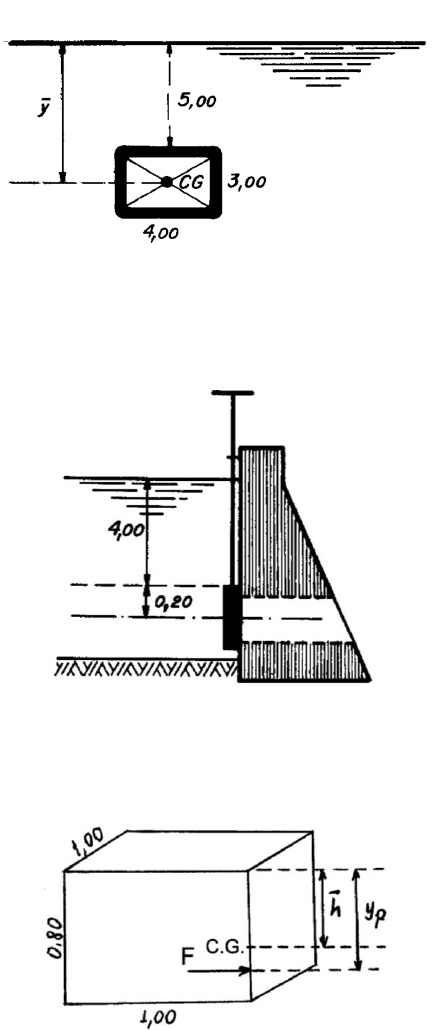 1 PONTIFÍCIA UNIVERSIDADE CATÓLICA DE GOIÁS PROFª MS.: JORDANA MOURA CAETANO 4ª LISTA DE EXERCÍCIOS ESTÁTICA DOS FLUIDOS – PARTE 2 1. Determinar a força resultante exercida pela água em uma comporta vertical mostrada na figura abaixo, de 3 x 4 m, cujo topo se encontra a 5 m de profundidade. Determinar, também, a posição do centro de pressão. Dado: = 10 x 10 3 N/m 3 (água). 2. Numa barragem de concreto está instalada uma comporta circular de ferro fundido com 0,20 m de raio, à profundidade indicada (figura). Determinar a força que atua na comporta e a posição do centro de pressão. Dado: = 10 x 103 N/m 3 (água). 3. Uma caixa d´água de 800 litros mede 1,00 x 1,00 x 0,80 m. Determinar a força que atua em uma de suas paredes laterais e o seu ponto de aplicação. Dado: = 10 x 10 3 N/m 3 (água). 2 4. Determinar a força, devida à pressão da água, na comporta retangular da figura, e o seu ponto de aplicação sendo o peso específico do fluido de 10.000 N/m³. 5. A superfície plana AB da figura abaixo é retangular, com 1,8 m de largura e 3,0 m de comprimento, normalmente à figura. Estando uma face sob óleo, como aí se mostra, calcular: a) a força resultante sobre a comporta; b) a localização do centro de pressão. Considere: = 10 x 10³ N/m3 (água). 6. Calcular a mínima força Fr, normal à comporta retangular de 4 x 6 m, que deve ser aplicada na base da comporta esquematizada para mantê-la fechada. Considere: = 10 x 102 kgf/m3. 3 7. A comporta AB da figura tem 1,5 m de largura e pode girar em torno de A. O tanque à esquerda contém água ( = 10.000 N/m³) e o da direita, óleo ( = 7.500 N/m³). Qual é a força necessária em B para manter a comporta vertical? 8. Determinar a força R que deverá ser aplicada no ponto A da comporta da figura para que permaneça em equilíbrio, sabendo-se que ela pode girar em torno do ponto O. Dados: p01 = 100 kPa γ1 = 10.000 N/m³ p02 = 50 kPa γ2 = 8.000 N/m³ Comporta retangular com h = 5 m e b = 2 m. 9. Calcule a força resultante na face em forma de quarto de círculo do tanque da figura abaixo. A largura do tanque é de 7 m e o raio do quarto de círculo é de 1 m. Determine também o ponto de ação das componentes. Dado: = 10 x 103 N/m 3 (água). 4 10. Calcular a força resultante que age sobre a comporta cilíndrica da figura de 3,28 m de comprimento. Dado: = 10 x 103 N/m3 (água). RESPOSTAS: 1) 780.000 N; 6,62 m 2) 5278 N; 4,20 m 3) 3200 N; 0,533 m 4) 99.356,96 N; 3,12 m 5) a) 104.625,51 N b) 2,735 m 6) 77.569,22 kgf 7) 50.000 N 8) 293.333,33 N 9) 431.582,04 N; YcH = 4,52 m; YcV = 0,51 m 10) 117.316 N 5