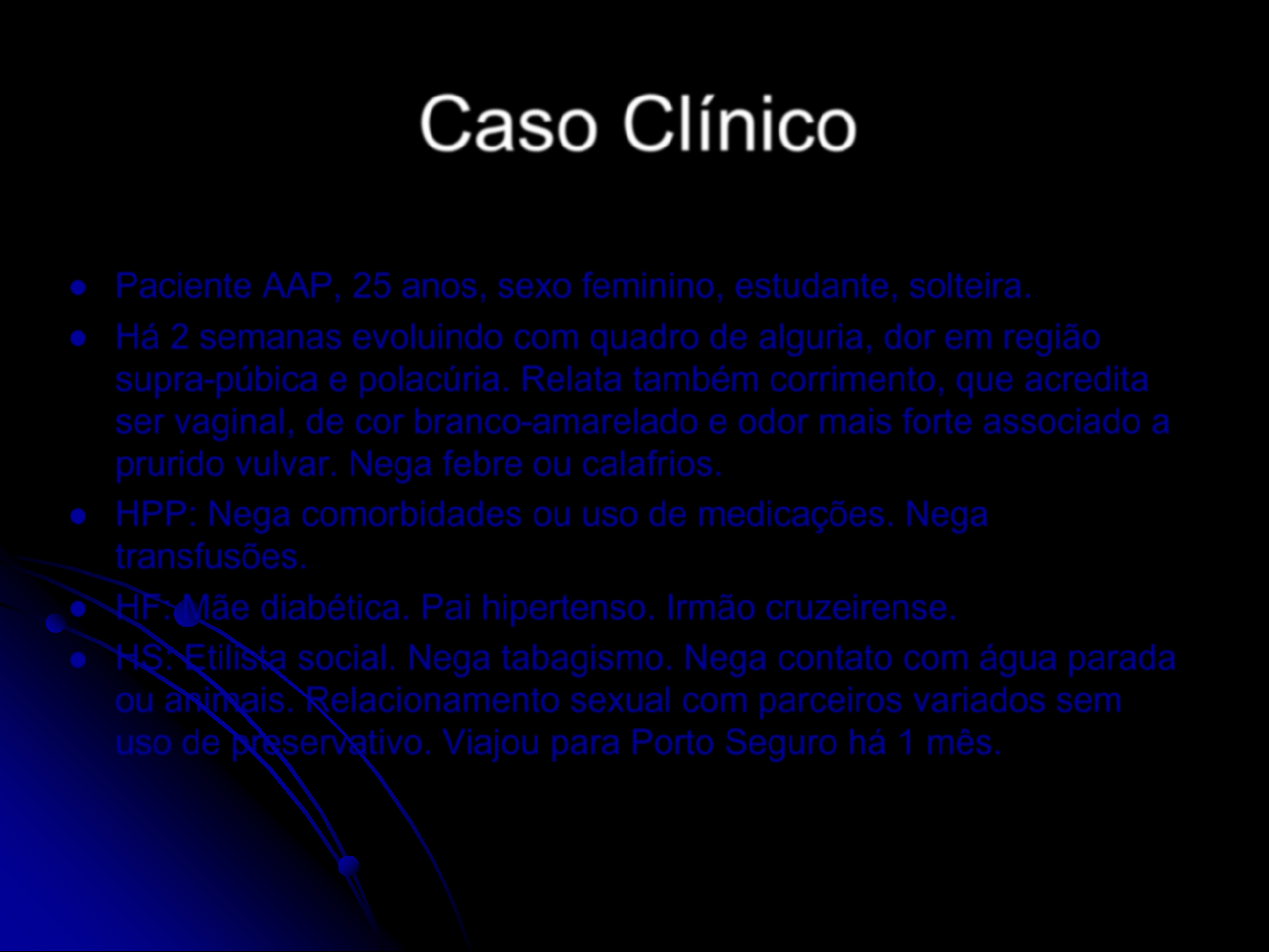 Caso Clínico Paciente AAP, 25 anos, sexo feminino, estudante, solteira. Há 2 semanas evoluindo com quadro de alguria, dor em região supra-púbica e polacúria. Relata também corrimento, que acredita ser vaginal, de cor branco-amarelado e odor mais forte associado a prurido vulvar. Nega febre ou calafrios. HPP: Nega comorbidades ou uso de medicações. Nega transfusões. HF: Mãe diabética. Pai hipertenso. Irmão cruzeirense. HS: Etilista social. Nega tabagismo. Nega contato com água parada ou animais. Relacionamento sexual com parceiros variados sem uso de preservativo. Viajou para Porto Seguro há 1 mês. Tricomoníase Prof. Dayrell Andrade Parasitologia – Classificação Filo: Sarcomastigophora Classe: Zoomastigophorea Ordem: Trichomonadida Família: Trichomonadidae Espécies: Trichomonas vaginalis Trichomonas tenax Pentatrichomonas hominis Trichomitus fecalis Trichomonas vaginalis Morfologia 1. Célula polimorfa 2. Capacidade de formar pseudópodes 3. Só possui forma trofozoíta 4. Possui 4 flagelos anteriores Biologia Local da infecção: trato geniturinário Reprodução: divisão binária longitudinal Fisiologia: Protozoário anaróbio facultativo Transmissão: 1. DST 2. Roupas íntimas, assentos de vasos sanitários, artigos de toalete, água de piscina, instrumentos ginecológicos Sinais e Sintomas Mulher: 1. Assintomáticos 2. Período de incubação: 3-20 dias 3. Vaginite 4. Corrimento, prurido e irritação vulvovaginal, dispaurenia, algúria, polaciúria 5. Piora no período pós menstrual / gravidez / uso de ACO Homem Assintomáticos Uretrite Prurido uretral / Ardência miccional / hiperemia do meato uretral Prostatite / balanopostite / cistite / epididimite Imunidade Presença de Ac locais e sistêmicos Sem comprovação de imunidade adquirida Imunoglobulinas PNM e monócitos – condições aeróbicas Diagnóstico Clínico Parasitológico: 1. Coleta da amostra 2. Preservação da amostra 3. Exame direto a fresco 4. Exame de cultura 5. Imunológico: aglutinação, imunofluorescência, ELISA Epidemiologia DST não viral mais freqüente 1/3 de todas vaginites Ampla distribuição geográfica Transmissão: principalmente sexual Prevalência: mulher – 20 a 30 anos homem - >30 anos Desinfecção: hexaclorofeno, betionol, diclorofeno, calor >44º C Profilaxia 1. Uso de preservativos 2. Evitar uso de roupas íntimas de outras pessoas e de objetos de higiene pessoal 3. Busca ativa em mulheres sexualmente ativas 4. Tratamento precoce dos doentes Tratamento Metronidazol Tinidazol Secnidazol Vacinoterapia: Lactobacillus acidophilus Balantidiose Balantidium coli Formas: cisto / trofozoíto Hábitat: intestino grosso / não penetra em mucosas intactas Reprodução: assexuada: divisão binária sexuada: conjugação Transmissão: ingestão de cistos Patogenia: comensal / Hialuronidase aumenta lesões existentes Sintomas: diarréia, meteorismo, dor abdominal, anorexia, adinamia Diagnóstico: clínica, EPF Distribuição: Mundial / relação com suínos Profilaxia e tratamento 1. Higiene pessoal 2. Engenharia sanitária 3. Melhores condições de criação de suínos 4. Tratamento precoce dos doentes # TTO: dieta láctea / metronidazol Caso Clínico Tricomoníase Classificação Trichomonas vaginalis Número do slide 5 Biologia Sinais e Sintomas Número do slide 8 Homem Imunidade Diagnóstico Epidemiologia Profilaxia Tratamento Balantidiose Número do slide 16 Número do slide 17 Profilaxia e tratamento