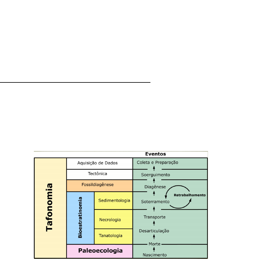 Tafonomia e processos de fossilização Segundo Efremov, Tafonomia é o estudo das condições e processos que propiciam a preservação de restos de organismos pré-históricos ou dos vestígios deixados por esses organismos. Esse ramo estuda as “leis” que governam a transição dos restos orgânicos da biosfera para a litosfera. Já Roger e outros cientistas a consideram como uma disciplina voltada a tudo que se relaciona com a formação de jazigos fossilíferos. Holz & Siomões afirmam que a Tafonomia estuda TODOS os aspectos da “vida de um fóssil”. * refere-se ao estudo dos processos de preservação e como eles afetam a informação no registro fossilífero. Pode-se dividir a história da preservação de um organismo em duas fases: uma relativamente curta, que vai da morte desse organismo até o seu sepultamento em sedimentos (Bioestratinomia); a outra é bem mais longa, tendo início com a ultimação de seu sepultamento e se estende até a data da coleta dos seus restos ou vestígios deixados pelo mesmo (Fossildiagenese). Como se baseiam os estudos tafonômicos? Actuopaleontologia: foi desenvolvido pela escola alemã de paleontologia, e iniciado por Rudolf Richter. O estudo da vida e da morte de organismos atuais em seus habitas, incluindo os processos post mortem e o estudo de fácies sedimentar. Objetivando, assim, extrapolar as observações recentes para os registros fossilíferos Bioestratinomia, termo cunhado por Weigelt, ocupa-se com as causas e tipos de morte dos organismos e com os problemas ligados à decomposição (necrólise), transporte, sepultamento. Possui uma fase relativamente curta, vai da morte do animal até seu sepultamento em sedimentos. Fossildiagênese (diagênese dos fósseis), termo cunhado por Muller e comumente referido como “fossilização”, são processos fisico-quimicos que propiciam a preservação dos restos orgânicos e dos vestígios (icnofósseis). Possui uma fase bem mais longa, que se inicia com o sepultamento do organismo e se estende até sua coleta ou degração (erosão). Nem sempre a delimitação e a ordem de sequencias das subdivisões da Tafonomia são respeitadas na natureza. A diagênese pode ocorrer durante o sepultamento e até antes dele; a necrólise pode dar-se após o sepultamento. Bioestrationomia Engloba a história sedimentar dos restos esqueléticos até o soterramento, incluindo causa de morte de um determinado organismo, sua decomposição, transporte e soterramento. Tanatologia: é o nome que recebe uma modalidade relacionada com os efeitos que provoca a morte no organismo. Estudo da morte. Tipos de morte: Basicamente são conhecidos dois tipos básicos de morte na natureza (população): a seletiva e a não-seletiva (catastrófica). A morte seletiva afeta determinadas faixas de idade da população e é causada por fatores como envelhecimento, doença e predação. Já a morte não-seletiva ou catastrófica ocorre quando um evento de grande magnitude (enchentes descomunais, tempestades, secas, marés vermelhas, erupções vulcânicas) atinge grande parte da população indistintamente. As principais causas de morte do indivíduo podem ser: doença (observar patologias nos ossos), predação (observar marcas de dentes) e acidentes (quedas em fendas, em poços de piche ou outras armadilhas naturais, além de enchentes gigantescas e secas prolongadas). Conceitos: Tanatocenose: assembleia de organismos mortos. Tafocenose: assembleia de organismos mortos e definitivamente soterrados pelo sedimento tafocenose = tanatocenose após o soterramento final Orictocenose: consiste na associação de todos os elementos fósseis presentes numa dada jazida fossilífera, num afloramento. Tafofácies: fácies sedimentar que abriga determinada orictocenose (mais estreito vínculo da paleontologia com a geo sedimentar). Necrologia: decomposição dos tecidos moles após a morte de um organismo trata-se de processos químicos que tem sua origem tanto nas bactérias exógenas como nas endógenas (bactérias presentes no corpo do animal, em especial no intestino). Existem umas exceções, como em casos dos restos serem soterrados em locais muito frios e corpo preserva-se por inteiro ou quando são encontrados em ambientes muito quentes e secos, onde os restos acabam se transformando em múmias. A temperatura influi na velocidade da decomposição dos tecidos (Calor -> acelera o processo; Frio-> inibe o processo). A velocidade de decaimento (apodrecimento, deterioração) dos tecidos moles de um organismo determina o tempo que ele permanecerá articulado após a morte. Após a morte de um animal, o processo de necrólise termina em um espaço curto de tempo podendo ser dias ou semanas, e deixa o esqueleto mineralizado exposto a ação do tempo e dos agentes exógenos. Porém, se o soterramento do organismo ocorre antes da necrólise total dos tecidos moles, será preservado praticamente o esqueleto inteiro e articulado, ou seja, com todas ou a maioria de suas articulações naturais intactas. A relação entre a necrólise e a desarticulação tem a ver com o fato de que os ossos só se mantem articulados pela existência dos tecidos moles (músculos, tendões e cartilagem) que os unem. Quando os tecidos moles são decompostos, os ossos ficam soltos e a partir daí o processo de desarticulação, que consiste na separação dos elementos de um esqueleto, entra em ação. Essa etapa da Tafonomia está relacionada à alguns fatores como o tempo de exposição a que o organismo fica submetido; a ação dos fatores do ciclo exógeno (água, vento e gelo), podendo o organismo sofrer transporte; a intensidade do transporte; a variação do padrão de desarticulação, conforme a anatomia básica do animal; influencia de fatores bióticos e abióticos; a velocidade da decomposição ;o tempo de exposição dos resto sé um fator determinante para a preservação do organismo, sendo inversamente proporcional ao grau de articulação da 