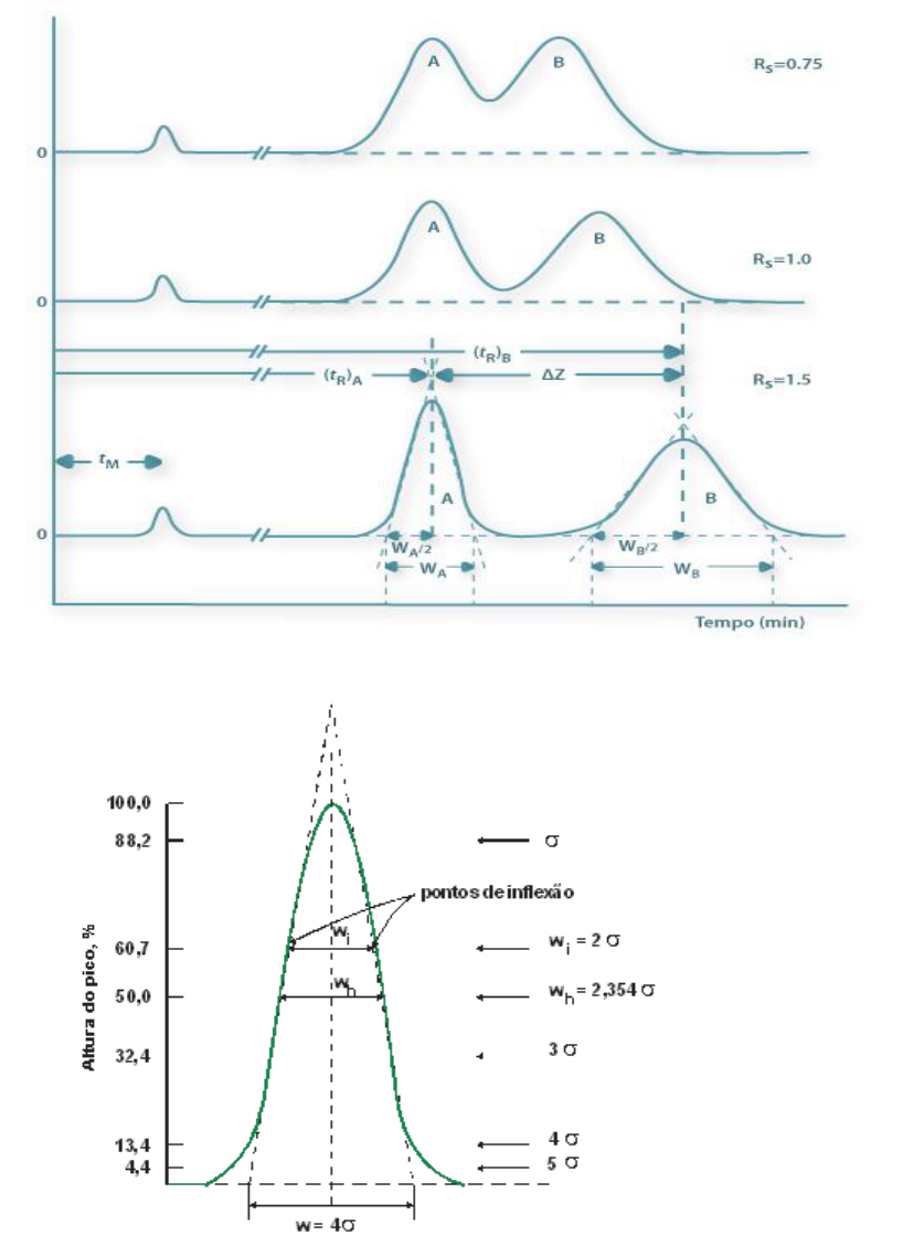 Exercícios 1) Discuta estes cromatogramas. A que se referem? Que efeitos são considerados? Como se pode melhorar a resolução de uma sistema cromatográfico? 2) Quais os parâmetros que são definidos a partir da figura abaixo? 3) Discuta cada um destes efeitos, em cromatografia tanto para colunas empacotadas quanto para capilares. 4) O que representa o gráfico a seguir? 5) Discuta os cromatogramas a seguir. 6) No cromatograma a seguir, porque o pico referente ao nitrogênio apresenta formato “achatado”? Condições de analise: Amostra: gases de refinaria Coluna:Carboxen-1000 60-80 mesh; 15’ x 1/8” T COL : 35 o C a 225 o C / 20 o C. min -1 Gás de Arraste: He @ 30 ml.min -1 Detector: TCD 7) No cromatograma a seguir, porque os últimos picos tem largura da base maior que os primeiros? Condições de analise: Coluna: 4 % Carbowax 20M s/ Carbopack B + 0,8% KOH T COL : 200 o C (isotérmico); Gás de Arraste: N 2 @ 20 mL.min -1 Detector: FID; Amostra: 0,01 mL da mistura de aminas. 8) Porque o pico do solvente aparece com formato largo e achatado? Coluna: CP-Sil 5 (25 m x 0,32 mm x 0,12 mm) TCOL:195 oC (6,5 min) / 195oC a 275oC (10oC min-1) Gás de Arraste: He @ 35 cm min-1 Detector: FID Amostra: 2mL de solução dos pesticidas “on-column” 9) No cromatograma a seguir, justifique a ordem de eluição Coluna: CP-Sil 43CB (10 m x 0,10 mm x 0,2 mm) TCOL:110oC (isotérmico) Gás de Arraste: N2 @ 16 cm min-1 ; Detector: FID Amostra: 0,1mL de solução 1-2% das piridinas em 3-metilpiridina 10) Justifique a diferença na separação dos compostos, nas duas diferentes fases estacionárias. Considere que todos os demais parâmetros se mantem constantes. 1 - piridina 2 - 2-metilpiridina 3 - 2,6-dimetilpiridina 4 - 2-etilpiridina 5 - 3-metilpiridina 6 - 4-metilpiridina 11) Qual a função de uma fase estacionária quiral? Amostra: Óleo essencial artificial de limão: separação de terpenos primários Coluna: Rt-ßDEXsm (30 m x 0.32 mm x 0.25 µm) TCOL: 1 min a 40°C / 2°C min -1 / 3 min a 200°C; Detector: FID Gás de Arraste: H2 80 cm min -1 12) Porque a essência artificial possui os dois isômeros R e S? Coluna: Rt-ßDEXse (30 m x 0.32 mm x 0.25 µm) – GC/MS TCOL: 1 min a 40°C / 4°C min -1 / 200°C Gás de Arraste: He 80 cm.min-1 13) Qual a estrutura quimica dos isômeros R e S da metanfetamina e da amfetamina. Coluna: Rt-ßDEXcst (30 m x 0.25 mm x 0.25 µm) GC/MS TCOL: 1 min a 120°C / 1,5°C min -1 / 3 min A 175°C Gás de Arraste: He @ 25 cm.min-1 14) Qual a diferença entre os dois cromatogramas? A que se deve? 15) Qual a diferença entre os dois cromatogramas? 1, 2, 3 - Hidrocarbonetos aromáticos 4, 5, 6 - Hidrocarbonetos clorados 1 tetracloro-m-xileno 2 α - BHC 3 Lindano 4 Heptachlor 5 Endosulfan 6 Dieldrin 7 Endrin 8 DDD 9 DDT 10 Metoxychlor 10 decaclorobifenila