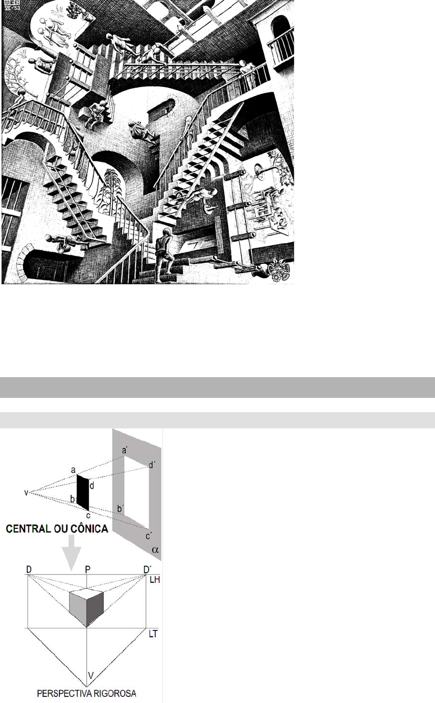 Figura 37. Relatividade (litografia) | 1953. M. C. Escher (1898 – 1970) A característica fundamental de esta litografia é a sua perspectiva ambígua: A sala pode rodar à volta do centro e pode conter até três linhas de horizonte. As figuras deambulam: umas sobem e outras descem numa determinada direcção sem parecer ser influenciadas pela força da gravidade. CLASSIFICAÇÃO DAS PERSPECTIVAS TIPOS DE PERSPECTIVAS Figura 38. O Campo Especifico da GEOMETRIA DESCRITIVA. A figura indica os dois tipos fundamentais de projecções: a Central ou Cónica e a Paralelo ou Cilíndrica. O primeiro caso identifica a perspectiva rigorosa, com os pontos de fuga. A projecção Central ou Cónica pode ser Ortogonal ou Oblíqua. A Projecção Ortogonal pode ser executada através do Método de Monge, sobre dois planos, ou utilizando a perspectiva técnica, designada de Axonométrica. Esta designação deve-se aos três eixos de representação que determinam o objecto. A perspectiva Axonométrica pode ser representada através de três designações estabelecidas internacionalmente: Perspectiva Axonométrica Trimétrica; Perspectiva Axonométrica Dimétrica; Perspectiva Axonométrica Isométrica. No caso da projecção Oblíqua, ela é, representada através da Perspectiva Cavaleira, salvo excepção. Com este capítulo entra-se definitivamente na perspectiva. Familiarizados com a linguagem básica, aplicada à perspectiva, vou entrar na sua classificação. A figura 38 é bastante elucidativa quanto à temática das projecções. Sob o ponto de vista do rigor, só as projecções ortogonais permitem definir correctamente a forma que se pretende dar a representar. Contudo, no campo artístico, a ilusão da realidade, nunca poderia ser simulada por este processo demasiadamente objectivo. A representação que melhor sugere esta realidade artística é a fotografia. Abordado que foi o método da dupla projecção ortogonal e embora determinasse com exactidão a forma e dimensões do objecto a representar, verificou-se que seria de leitura difícil, principalmente para aqueles que não estão familiarizados com o desenho de perspectivas técnicas. Necessita-se portanto, de exemplos mais exaustivos. A necessidade de rapidamente identificar uma qualquer forma projectada, que se pretende dar a representar, nunca poderia apenas recorrer ao método da dupla projecção ortogonal. Tanto nos campos artístico como técnico, é necessário o recurso à representação das formas através da linguagem da perspectiva. Referindo novamente, não será a fotografia, o processo mecânico, que melhor sugere a realidade? A perspectiva assemelha-se à realidade fotográfica, embora esta tenha apenas sido verdadeiramente descoberta no passado século XIX. Por outro lado, enquanto que o método das projecções ortogonais se baseia na projecção de uma forma em dois planos, os métodos utilizados em perspectiva rigorosa, quer seja artística (linear) ou técnica (axonométrica e cavaleira), utilizam a projecção num só plano. Dado que o objecto desta publicação, é a perspectiva artística, as perspectivas técnicas serão abordadas sumariamente. Talvez, por culpa da minha formação artística, manifesto uma certa insensibilidade aos aspectos mais técnicos. Portanto, em qualquer abordagem anteriormente feita, o leitor observou o tratamento sumário das projecções ortogonais. O mesmo irá agora acontecer com as perspectivas axonométricas e cavaleira. Ou seja, com todas as projecções paralelas ou cilíndricas. Os próximos capítulos irão abordar exclusivamente os vários métodos utilizados na perspectiva rigorosa (central ou cónica). E neste campo, da perspectiva cónica, também designada de perspectiva linear, será exaustivamente estudada através de inúmeros exemplos de construção de formas, sombras e reflexos. A publicação terminará com a abordagem ao método de perspectiva, utilizado no campo artístico. Embora seja considerada uma perspectiva rigorosa, muitas vezes ultrapassa os requisitos do rigor geométrico, para permitir composições bem mais criativas e expressivas. Figura 39. Basicamente existem dois tipos de projecções: A projecção central ou cónica e a projecção paralela ou cilíndrica. A primeira, conforme o esquema da figura 39 indica, é obtida pelos raios visuais que partem de um único ponto de vista [V]. No caso do quadrado [a,b,c,d], os raios visuais tangentes aos seus vértices, que partem do ponto [V], estabelecem a sua projecção através dos pontos [a’], [b’], [c’] e [d’] no plano [α]. Este tipo de projecção é quase exclusivamente aplicada ao campo artístico. Embora raramente, também é utilizada nos campos da arquitectura e da engenharia. As suas características impedem uma leitura rigorosa, pelo que é evitada no campo técnico. A projecção paralela ou cilíndrica é a que permite uma leitura rigorosa da forma que se pretende dar a representar. Esta projecção não é utilizada no campo artístico, já que as formas não diminuem proporcionalmente, conforme o seu afastamento. Observe-se novamente a figura 39, mas agora a segunda imagem. Neste caso, não existe um ponto de onde saem os raios visuais. Eles são paralelos. Este aspecto é extremamente importante para o técnico, pois pretende ler uma determinada forma com rigor, através da sua perspectiva. É evidente que o seu aspecto é deformando aos olhos do artista e não só. FAMÍLIA DAS PERSPECTIVAS Figura 40. Os oito tipos de perspectiva. A utilização de qualquer tipo de perspectiva, referenciada na figura 38, depende da finalidade pretendida. As perspectivas centrais ou cónicas são empregues no trabalho artístico e no trabalho arquitectónico. A perspectiva rigorosa normal cónica é determinada por um ou dois pontos de fuga (paralela e oblíqua). É o campo específico do mundo artístico, por excelência. Refira-se, no entanto, que a sua impossibilidade prática, de realização n
