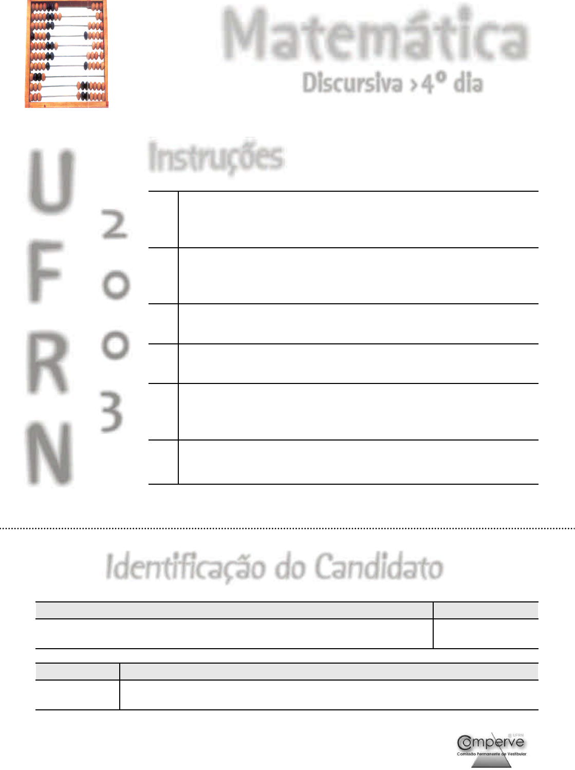 -- 1. Só se identi f ique na parte inferior desta capa. Sua prova será anulada se contiver qualquer marca identi f icadora fora desse local. 2. Este caderno contém 05 questões. Se estiver incompleto ou com defeito que prejudique a leitura, peça imediatamente ao f iscal que o substitua. 3. Escreva as respostas e os rascunhos com a caneta entregue pelo f iscal. 4. Para fazer os rascunhos, use o verso da capa e qualquer página em branco desta prova. 5. Você será aval iado exclusivamente por aqui lo que escrever dentro do espaço destinado a cada resposta, não podendo, portanto, ultrapassar o espaço del imitado. 6. Escreva de modo legível. Dúvida gerada por graf ia, sinal ou rasura impl icará redução de pontos durante a correção. Nome (em letra de forma) Nº da Inscrição . . Nº da sala Assinatura . .. U F R N 2 0 0 3 Instruções Identificação do Candidato Discursiva > 4 diaº Matemática UFRN î 2003 î Matemática QQuueessttããoo 11 A sorveteria Sabor da Fruta vende o sorvete simples por R$ 2,00 e o sorvete com cobertura por R$ 2,40. No dia das crianças, foram vendidos 720 sorvetes. AA)) Determine qual seria o apurado nesse dia, se fossem vendidos 400 sorvetes com cobertura e 320 sorvetes simples. BB)) Se o apurado fosse R$ 1.640,00, determine a quantidade de sorvetes - de cada tipo - vendida nesse dia. RREESSPPOOSSTTAA UFRN î 2003 î Matemática QQuueessttããoo 22 O Tangran é um quebra-cabeça de origem chinesa, composto por sete peças, que, juntas, podem formar um quadrado, conforme a figura abaixo. Os Polígonos P1, P2, P3, P5, e P7 são triângulos retângulos isósceles. P4 é um quadrado, e P6 é um paralelogramo. Utilizando-se de algumas dessas propriedades, responda às solicitações propostas. AA)) Verifique que as medidas dos ângulos internos do paralelogramo P6 são 45º e 135º. BB)) Verifique que os triângulos P3 e P5 são congruentes. CC)) Verifique que a área do quadrado P4 é igual à área do paralelogramo P6. RREESSPPOOSSTTAA P1 P2 P4 P5 P6 P7 P3 UFRN î 2003 î Matemática QQuueessttããoo 33 Um quadrado mágico é um quadriculado com n2 quadrados menores que contêm números de forma que a soma desses números em cada linha, em cada coluna e nas duas diagonais é a mesma. Para responder às solicitações propostas, considere o número complexo i = 1- e o quadrado abaixo. i i2 i3 i4 i5 i6 i7 i8 i9 i10 i11 i12 i13 i14 i15 i16 AA)) Calcule i2, i3, i4 , ..., i16 . BB)) Verifique se o quadrado acima é mágico. CC)) Calcule a soma de todos os números que compõem o quadrado acima. RREESSPPOOSSTTAA UFRN î 2003 î Matemática QQuueessttããoo 44 Os cartões de crédito, em geral, possuem uma senha formada com seis dígitos escolhidos dentre os números 0, 1, 2, ..., 9. Dona Leocádia tem um cartão do Banco da Nação e, para formar sua senha, utilizou (o que não é recomendável) os números da data do seu aniversário, no caso 7/8/1932, usando o seguinte procedimento: os dois primeiros dígitos ela escolheu dentre as possíveis permutações dos números 7 e 8; e os quatro restantes, dentre as possíveis permutações dos números 1, 9, 3 e 2. AA)) Calcule quantas senhas possíveis podem ser criadas usando o procedimento de dona Leocádia. BB)) Calcule a probabil idade de dona Leocádia acertar sua senha numa primeira tentativa, caso ela esqueça do número, mas lembre do procedimento que usou para formar sua senha. CC)) Calcule a probabil idade de dona Leocádia, lembrando-se apenas dos dois primeiros dígitos e do último, acertar sua senha após duas tentativas sem êxito. RREESSPPOOSSTTAA UFRN î 2003 î Matemática QQuueessttããoo 55 Considere as funções f(x) = 2 x - 1 e g (x)= -x2 + 4 definidas para todo número real x e h(x) = f(x)g(x ). AA)) Calcule h(-1) = f(-1)g(-1) e h(1) = f(1)g(1). BB)) Determine o conjunto dos números reais x tais que h(x)<0. RREESSPPOOSSTTAA