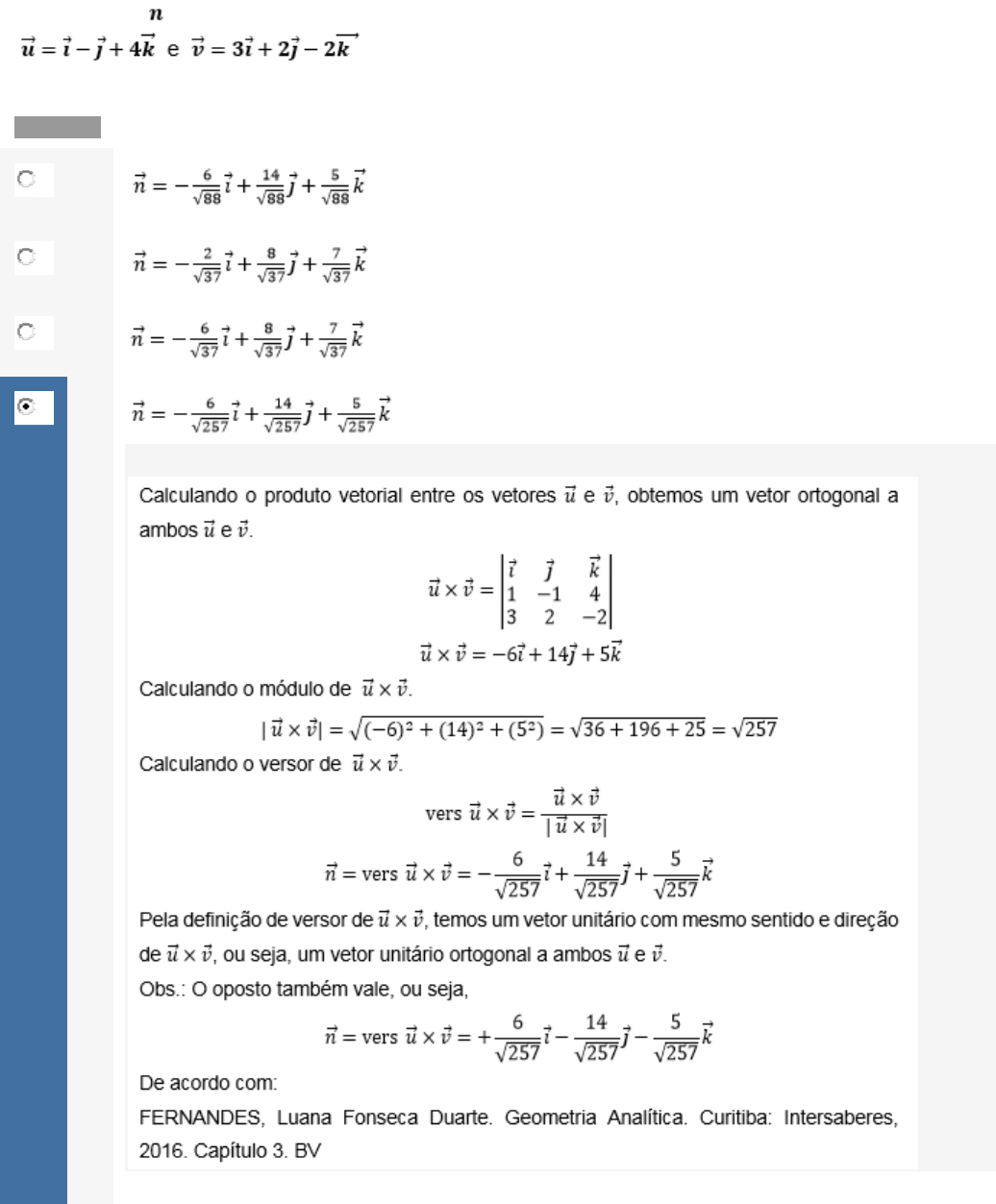Questão 1/10 - Geometria Analítica Na geometria analítica estudamos os produtos escalar, vetorial e misto e é muito importante saber a definição e interpretação geométrica de cada um deles. E, algo que não deve ser esquecido é que os produtos escalar e misto resulta num número e o produto vetorial resulta num vetor. Considere um vetorunitário que seja ortogonal a ambos vetores . É correto afirmar: Alternativas: Nota: 10.0 A B C D Você acertou! E Questão 2/10 - Geometria Analítica Nos estudos sobre o plano, temos que qualquer plano pode ser representado por uma equação, e uma das formas para determinar a equação desse plano é conhecendo dois pontos desse plano e um vetor paralelo ao plano. Após, admitindo um ponto genérico do plano, é possível escrever mais dois vetores no plano obtendo assim três vetores coplanares. Os pontos e o vetor pertencem ao plano . Sendo o vetor normal ao plano , é correto afirmar: Alternativas: Nota: 10.0 A B C D Você acertou! E Questão 3/10 - Geometria Analítica O estudo das retas na geometria analítica oferece algumas formas de escrever suas equações, uma delas é a simétrica. E quaisquer que sejam as equações escolhidas para representar a reta, é sempre necessário conhecer um vetor diretor e um ponto pelo qual passa a reta. Considere a reta que passa pelo ponto e é paralela ao vetor . É correto afirmar que a equação simétrica da reta é: Alternativas: Nota: 10.0 A B Você acertou! C D E Questão 4/10 - Geometria Analítica Ângulo é um assunto estudado pela geometria no geral e na geometria analítica não é diferente, ou seja, na geometria analítica estudamos ângulos entre dois vetores. Além de ângulo entre vetores, estudamos também ângulos entre duas retas, entre dois planos e entre plano e reta. Em todos os casos podemos usar o produto interno para calcular o ângulo entre dois vetores ou calcular algo que se refere ao ângulo entre dois vetores. Sabendo que o ângulo entre os vetores , assinale a alternativa correta: Alternativas: Nota: 10.0 A Você acertou! B C D E Questão 5/10 - Geometria Analítica O estudo dos vetores gira em torno das operações com vetores, módulos de vetores, vetores ortogonais e paralelos e ângulo entre vetores. Sendo os vetores é correto afirmar: Alternativas: Nota: 10.0 A B Você acertou! C D E Questão 6/10 - Geometria Analítica A soma dos módulos de dois vetores resulta no módulo de um terceiro vetor, essa soma pode ser feita geometricamente formando um triângulo com os três vetores, tal forma conhecida como regra do paralelogramo. Ou então, usando o produto interno, ou seja, o módulo de um vetor é a raiz quadrada do produto interno dele com ele mesmo. Sabendo que o ângulo formado entre os vetores e que , assinale a alternativa correta: Alternativas: Nota: 10.0 A Você acertou! B C D E Questão 7/10 - Geometria Analítica Uma das cônicas que estudamos na geometria analítica é a hipérbole. É indispensável que o aluno saiba o que são distância focal , eixo real e eixo imaginário . Dessa forma, os pontos e são os focos e os ponto e são os vértices de uma hipérbole. Assinale a alternativa que corresponde com a equação da referida hipérbole: Alternativas: Nota: 0.0 A B C D E Questão 8/10 - Geometria Analítica A interpretação geométrica dos produtos escalar, vetorial e misto são, em alguns casos, as únicas ferramentas para resolver alguns problemas. Considere o triângulo cujos vértices são os pontos , e área . Sabendo que que existem dois valores reais para , é correto afirmar: Alternativas: Nota: 10.0 A B Você acertou! C D E Questão 9/10 - Geometria Analítica Estudamos na geometria analítica a distâncias entre os elementos, desde que pelo menos um deles seja o ponto, ou seja, estudamos a distância entre dois pontos, entre um ponto e uma reta e um ponto e um plano. Nos casos em é necessário calcular a distância entre um reta e um plano, escolhemos um ponto da reta e calculamos a distância até o plano ou vice-versa. Dados a reta e o plano . Sabendo que é a distância entre a reta e o plano , é correto afirmar: Alternativas: Nota: 10.0 A B C D E Você acertou! Questão 10/10 - Geometria Analítica Módulo de um vetor é o seu comprimento, quando somamos dois vetores na forma geometria, ou seja, considerando somente seus módulos, o resultado é o comprimento de um terceiro vetor que junto aos outros dois formam um triângulo. Considere dois vetores ortogonais cujos módulos são é correto afirma que é igual a: Alternativas: Nota: 10.0 A 9 B 8 C 7 D 6 E 5 Você acertou!