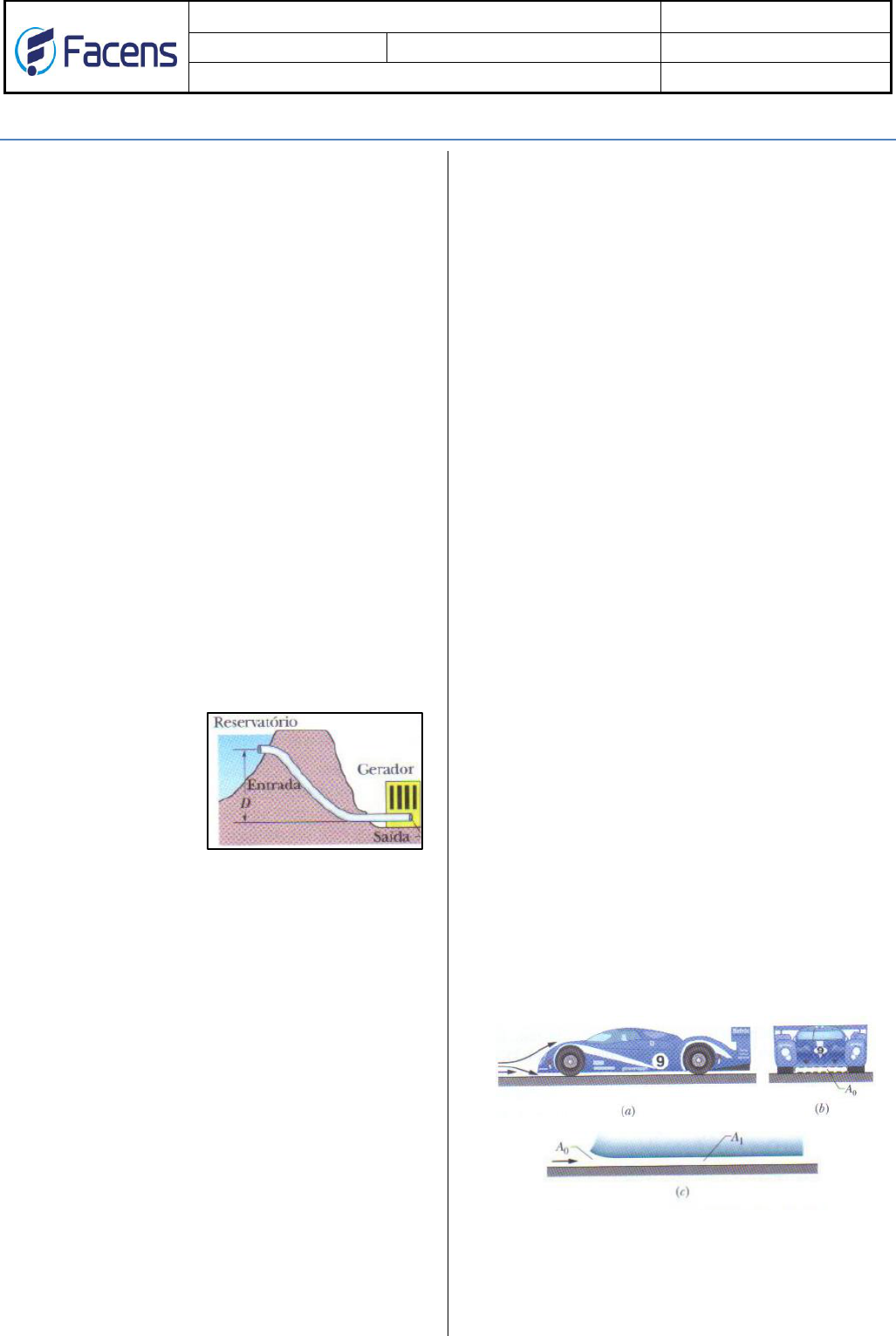 Aluno(a): Matrícula: Disciplina: Física II Turma: Módulo I Prof. Dr. Cléber Dantas NÃO precisa entregar! 3ª Lista de Exercícios: Fluidodinâmica 1 - Uma piscina tem o formato de um paralelepípedo reto (ortoedro) cujas dimensões são 20,0 m x 9,0 m e 2,0 m. Suponha que às 6h00 de um domingo ela esteja vazia e comece a ser enchida com o auxílio de uma mangueira que conduz água à 4,0 m/s e possui área de seção transversal igual a 25 cm2. Considerando que a vazão seja mantida constante, à que horas a piscina estará completamente cheia? 2 - A mangueira de um jardim tem diâmetro interno igual a dois centímetros e está ligada a um irrigador que consiste em um recipiente com 20 orifícios, cada um com diâmetro de um milímetro. Se a velocidade da água na mangueira é de 0,9 m/s, qual sua velocidade ao sair dos orifícios do irrigador? 3 - A água se move com velocidade de 5,0 m/s em um cano com seção reta de 4,0 cm2. Ao longo de uma descida de 10 m, a área de seção do cano aumenta para 8,0 cm2. (a) Qual é a velocidade da água depois da descida? (b) Se a pressão antes da descida é 1,5.105 Pa, qual é a pressão depois da descida? 4 - Na figura ao lado é mostrado um esquema simplificado de uma usina hidrelétrica. Considere que a entrada da tubulação tenha área de seção transversal de 0,740 m2 e a velocidade da água seja de 40,0 cm/s. Na saída, a uma distância D=180 metros abaixo da entrada, a velocidade da água é 9,50 m/s. (a) Calcule o diâmetro da saída da tubulação. (b) Qual é a diferença de pressão entre a saída e a entrada? 5 - “Assim como aviões e carros são testados em túneis de vento, torpedos geralmente são testados com água escoando em tubos horizontais”. Considere um tubo circular com área de seção reta igual a 32,0.10-3 m2 por onde a água escoa a 1,89 m/s. Tal tubo, cujo área de seção é constante, será mantido na horizontal e utilizado para testar um torpedo pelo qual a água deve passar a 2,50 m/s. Sabendo que o torpedo é mantido alinhado com o eixo maior do tubo (i.e., na direção de escoamento da água), determine (a) o raio do torpedo e (b) a diferença de pressão na água entre a região livre do tubo e a região ao redor do torpedo. 6 - Uma mangueira de 2,00 cm de diâmetro é usada para encher um balde de 20,0 litros. (a) Se ela leva um minuto para enchê-lo completamente, determine a velocidade que a água se desloca através da mangueira. (b) Se a mangueira tiver um bico de cinco milímetros de raio, encontre a velocidade com que a água passa pelo bico. 7 - Muitos modelos de carros de corrida utilizam a sustentação aerodinâmica negativa (ou, downforce) para aumentar o atrito dos pneus com a pista e poder fazer as curvas mais depressa sem derrapar. Parte da sustentação negativa se deve ao efeito solo, que é uma força associada ao fluxo de ar por baixo do carro. Quando o carro de corrida da figura abaixo se desloca a 27,25 m/s, o ar é forçado a passar por cima e por baixo do carro (Fig. A). O ar que passa por baixo do carro entra por uma abertura na frente do carro, cuja seção reta é A0=0,0330 m2 (Fig. B) e passa pelo espaço entre o fundo do carro e a pista, cuja seção reta é A1=0,0310 m2. Para simplificar o problema, trate o fluxo de ar como o de um fluido ideal em um cano estacionário horizontal, cuja seção reta diminui de A0 para A1 (Fig. C). Considere ainda que a densidade do ar seja de 1,21 kg/m3 e que, devido ao movimento relativo, a pressão que a atmosfera exerce sobre o carro seja p0=100,85 kPa. (a) Calcule a velocidade “v1” que o ar passa por A1, isto é, por baixo do carro. (b) Se, no momento em que passa por A0, o ar está à pressão atmosférica “p0”, qual é a pressão “p1” quando o ar passa por A1? (c) Considerando que as superfícies superior e inferior do carro possuam área de seção reta horizontal Ah=4,86 m2, determine o módulo e o sentido da força resultante vertical “𝜮Fv” que age sobre o carro devido à diferença de pressão acima e abaixo dele. Física II – Engenharias Prof. Dr. Cléber Dantas Respostas 1 - 16h00 2 - 18,0 m/s 3 - (a) 2,5 m/s; (b) 2,6.105 Pa 4 - (a) 19,9 cm; (b) 1,72 Mpa 5 - (a) 49,9 mm; (b) 1,34 kPa 6 - (a) 1,06 m/s; (b) 4,24 m/s 7 - (a) 29,01 m/s, (b) 100,79 kPa; (c) 292 N (↓) Referências HALLIDAY, D., RESNICK, R. e. WALKER, J.; FUNDAMENTOS DE FÍSICA – Gravitação, Ondas e Termodinâmica, Vol. 2, 8ª ed., Ed. LTC. Rio de Janeiro, 2009. SERWAY, R. A. e JEWETT Jr., J. W; PRINCÍPIOS DE FÍSICA – Movimento Ondulatório e Termodinâmica, Vol. 2, 3ª ed., Ed. Cengage Learning. São Paulo, 2011.