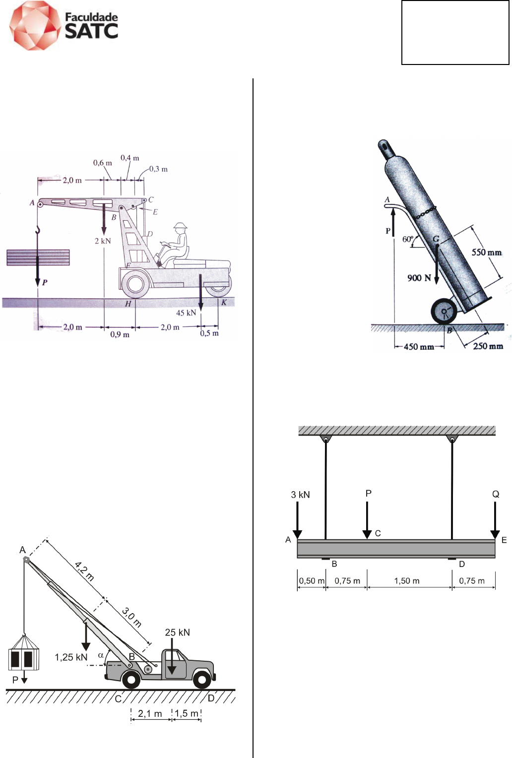 CURSO DE ENGENHARIA MECÂNICA DISCIPLINA: ESTÁTICA Profº José Luiz Salvador Acadêmico:______________________________________ Lista 09 01. Uma carga de madeira de peso P = 20 kN esta sendo erguida por um guindaste. O peso da lança ABC e o peso combinado do veículo e do motorista estão indicados na figura. Determine a reação em cada uma das duas rodas: (a) dianteira H e (b) traseiras K. 02. Na mesma situação do exercício anterior, calcule: (a) a tração na haste CD e (b) a reação no pino B. 03. Determine a maior carga que pode ser erguida pelo guindaste do Prob. 01 sem que ele tombe, sabendo que a maior força que pode ser exercida pelo cilindro hidráulico D é de 96 kN e que a maior tração permitida no cabo AEF é 40 kN. 04. No guindaste montado no caminhão, determine o menor ângulo α para que o caminhão não tombe quando a carga P de 15 kN for levantada. 05. Um carrinho de mão é utilizado para transportar um cilindro de ar comprimido. Sabendo que o peso total do carrinho e do cilindro é de 900 N, determine: (a) a força vertical P que deve ser aplicada ao braço do carrinho para manter o sistema na posição ilustrada e (b) a reação correspondente em cada uma das rodas. 06. Três cargas são aplicadas a uma viga leve suspensa por cabos presos em B e D. Desprezando o peso da viga, determine o intervalo de valores de Q para os quais nenhum dos dois cabos fica frouxo quando P = 0. 07. Nas condições do exercício anterior, determine o intervalo de valores de Q para os quais o carregamento é seguro, com P = 1 kN. RESPOSTAS 01. a) 54,92 kN ↑ b) 12,08 kN ↑ 02. a) 64,6 kN b) 106,6 kN ↑ 03. 30 kN 04. α = 62º 05. a) 117 N ↑ b) 392 N ↑ 06. 0,5 kN ≤ Q ≤ 11 kN 07. 0,25 kN ≤ Q ≤ 13 kN