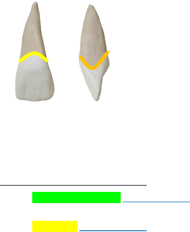 LINHA DE COLO ANATÔMICO ou LINHA COROA RAÍZ Linha que divide o dente em duas porções distintas a coroa e a raiz. Apresenta-se côncava nas faces livre e convexa nas faces proximais num sentido inciso/ocluso-cervical. Características comuns a todos os dentes CONVERGÊNCIA DAS FACES PROXIMAIS Em uma vista vestibular / lingual as faces proximais convergem para cervical, ou seja, O ou I > C. Em uma vista oclusal as faces proximais convergem para lingual, ou seja, V>L. Exceção: 1° molar superior e 2° pré-molar inferior quando este apresentar 3 cúspides, ou seja, nesses casos a L>V. CONVERGÊNCIAS DAS FACES LIVRES Em uma vista oclusal, as faces livres convergem para distal, ou seja, M> D. Em uma vista proximal, as faces livres convergem para incisal/oclusal, ou seja, C > I ou O. ÂNGULO FORMADO ENTRE A COROA E A RAÍZ As faces mesiais são maiores (VL e OC), mais planas e mais obtusas que as distais.