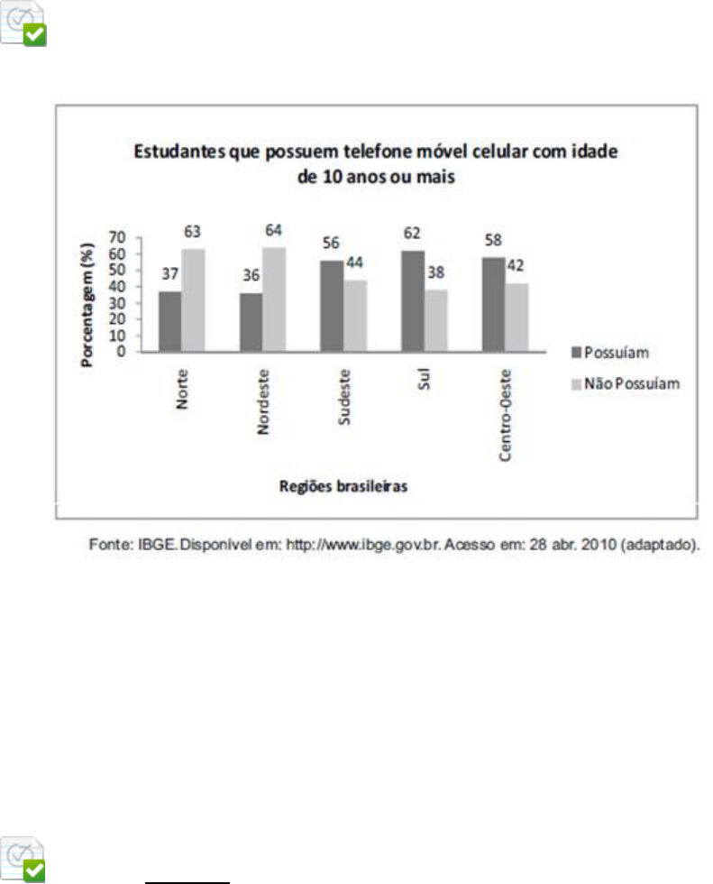 • Pergunta 1 1 em 1 pontos Os dados do gráfico formam dados coletados por meio da pesquisa nacional por amostra de domicílios. Supondo-se que, no sudeste, 14 900 estudantes foram entrevistados nessa pesquisa, quantos deles possuíam telefone móvel celular? Resposta Selecionada: d. 8 344 • Pergunta 2 1 em 1 pontos Com base no gráfico, considere as afirmativas e assinale a alternativa incorreta: Gráfico – MAPA DA VIOLÊNCIA POLÍTICA NA AMÉRICA DO SUL (FEV. 2005- MAR.2006) FONTE: COUTINHO, M. “Movimentos de mudança política na América do Sul contemporânea”. Revista Sociologia e Política. n.27 Curitiba nov. 2006 Resposta Selecionada: d. O índice de violência é irrelevante comparado aos dos regimes militares durante os anos 1970. • Pergunta 3 1 em 1 pontos Na avaliação da eficiência de usinas quanto à produção e aos impactos ambientais, utilizam-se vários critérios, tais como: razão entre produção efetiva anual de energia elétrica e potência instalada ou razão entre potência instalada e área inundada pelo reservatório. No quadro seguinte, esses parâmetros são aplicados às duas maiores hidrelétricas do mundo: Itaipu, no Brasil, e Três Gargantas, na China. Com base nessas informações, avalie as afirmativas que se seguem: I - A energia elétrica gerada anualmente e a capacidade nominal máxima de geração da hidrelétrica de Itaipu são maiores que as da hidrelétrica de Três Gargantas. II - Itaipu é mais eficiente que Três Gargantas no uso da potência instalada na produção de energia elétrica. III - A razão entre potência instalada e área inundada pelo reservatório é mais favorável na hidrelétrica Três Gargantas do que em Itaipu. É correto apenas o que se afirma em: Resposta Selecionada: e. II e III • Pergunta 4 1 em 1 pontos O Índice de Desenvolvimento Humano (IDH) é uma medida comparativa de pobreza, alfabetização e esperança de vida para os diversos países do mundo. Seu cálculo resulta em valor que vai de 0 (zero) a 1 (um), sendo que, quanto mais próximo da unidade, mais desenvolvido é considerado o país. A escolaridade inclui a alfabetização dos adultos e a educação primária, secundária e terciária da população em geral. O PIB per capita entra no cálculo do IDH como um substituto de uma medida do padrão de vida ou de distribuição de renda. O gráfico abaixo mostra a evolução do IDH de 1975 a 2004 para várias regiões do planeta. Com base nos dados apresentados no gráfico, pode-se concluir que: Resposta Selecionada: d. O leste da Ásia é mais desenvolvido que o sul do continente. • Pergunta 5 1 em 1 pontos (FGV-SP) A partir de levantamentos demográficos, o órgão da ONU que estuda a população elaborou as pirâmides etárias que representam modelos de estrutura demográfica dos continentes. Observe as pirâmides I, II e III; referentes ao ano de 2010, apresentadas a seguir. (http://esa.un.org/wpp/population-pyramids/population- pyramids_percentage.htm) Considerando a dinâmica demográfica predominante em cada continente, pode-se afirmar que a pirâmide: Resposta Selecionada: d. III é característica da África, onde a transição demográfica encontra-se nas fases iniciais. • Pergunta 6 1 em 1 pontos Observe os gráficos, que são referentes ao perfil da população carcerária da cidade do Rio de Janeiro com base no Censo Demográfico de 2000: Gráfico A - Origem da população carcerária do município do Rio de Janeiro (em %): Gráfico B - Comparação entre as faixas etárias da população total do município e da sua população carcerária (em %): Indique a alternativa que melhor compreende os dados apresentados em ambos os gráficos: Resposta Selecionada: c. Percebe-se que a maior parte da população carcerária do município do Rio de Janeiro está na faixa de 20 a 39 anos, período dos mais importantes para a qualificação e a atuação da mão de obra produtiva em determinado ambiente. • Pergunta 7 1 em 1 pontos A classificação de um país no quadro de medalhas nos Jogos Olímpicos depende do número de medalhas de ouro que obteve na competição, tendo como critérios de desempate o número de medalhas de prata seguido do número de medalhas de bronze conquistados. Nas Olimpíadas de 2012, o Brasil foi o vigésimo segundo colocado no quadro de medalhas, tendo obtido 3 medalhas de ouro, 5 de prata e 9 de bronze. Parte desse quadro de medalhas é reproduzido a seguir: Se o Brasil tivesse obtido mais 4 medalhas de ouro, 4 de prata e 10 de bronze, sem alteração no número de medalhas dos demais países mostrados no quadro, qual teria sido a classificação brasileira no quadro de medalhas das Olimpíadas de 2004? Resposta Selecionada: b. 12º • Pergunta 8 1 em 1 pontos Leia o texto a seguir. Aquecimento global “Emitimos cerca de 9 bilhões de toneladas de monóxido de carbono (CO2) por ano, sendo que menos da metade dessa quantidade permanece na atmosfera. O CO2 é um dos causadores do efeito estufa, juntamente com o metano (CH4) e os clorofluorcarbonos (CFC). Medindo a concentração de carbono em rochas, os cientistas determinaram um aumento súbito na concentração de carbono na atmosfera entre as eras paleocena e eocena. Esse evento, seguido de uma queda lenta na concentração de carbono, foi denominado Evento Termal Máximo do Paleoceno-Eoceno (PETM) e estendeu-se por cerca de 150 mil anos, até que todo o carbono em excesso fosse reabsorvido (figura 1). Figura 1: Acredita-se que o PETM foi desencadeado por um aumento da temperatura global, que teria causado o derretimento dos depósitos de hidrato de metano, liberando metano na atmosfera. Uma molécula de metano contribui cerca de 20 vezes mais para o aquecimento da atmosfera do que uma molécula de CO2. Com o tempo, o metano passa por um processo de oxidação, produzindo CO2, o que continua provocando elevação na temperatura. O PETM teve como consequência um aumento da acidez dos mares, provocando a exti