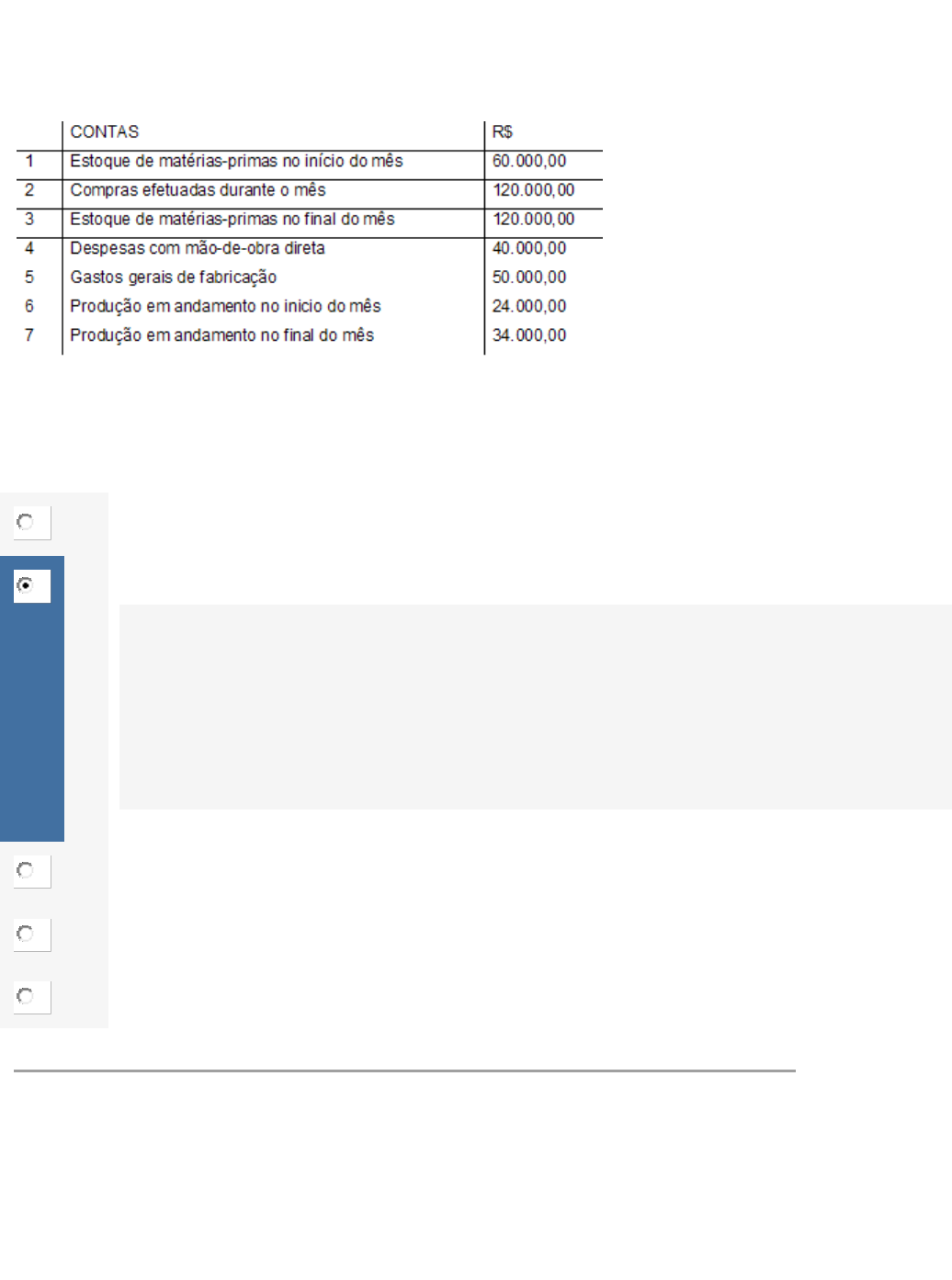 Questão 1/5 - Gestão de Custos e Formação de Preços Num determinado mês, a escrituração contábil de uma empresa industrial registrou os seguintes dados: O Custo da Produção Acabada (CPA) foi, portanto, de R$: Nota: 20.0 A 60.000,00 B 140.000,00 Você acertou! Primeiro deve-se calcular a matéria-prima consumida na produção: (EI+CO-EF), (60.000,00+120.000,00-120.000,00)= 60.000,00 de MP utilizado no período. Agora calculamos o custo de produção (CP = MD + MOD + CIF) = (60.000+40.000+50.000) = Custo dos produtos fabricados no período = 150.000,00. E então, calculamos o custo de produção Acabada (CPA = EIPP + CP - EFP) = 24.000+15.000-34.000 = Custo da Produção Acabada (CPA) = 140.000 Aula 3, tema 5, e livro base da disciplina, pág. 87. C 150.000,00 D 174.000,00 E 180.000,00 Questão 2/5 - Contabilidade Financeira Lançamento é a técnica pelo qual se processa a contabilização dos fatos administrativos de uma empresa. A empresa Vende Tudo Ltda, liquidou uma obrigação de curto prazo. Analise as alternativas abaixo e marque aquela que demonstra o correto resultado dessa liquidação. Nota: 20.0 A Aumento do Ativo e diminuição do Passivo. B Aumento do Passivo e diminuição do Ativo; C Diminuição do Ativo e do Passivo. Você acertou! O lançamento da operação resultará a diminuição do ativo e do passivo, pois o lançamento seria: Duplicatas a Pagar (hipoteticamente) a Caixa (hipoteticamente) Debitando a conta do Passivo – diminuirá seu saldo Creditando a conta do Ativo – diminuirá seu saldo (veja cap. 4). D Diminuição do Ativo, do Passivo e aumento do Patrimônio Líquido. Questão 3/5 - Contabilidade Financeira O razonete é uma expressão simplificada do livro-razão e, também, uma simplificação do gráfico que representa o balanço patrimonial. Essa ferramenta deve ser utilizada tanto para as contas patrimoniais como para as contas de resultados. Com base nestas informações, pode-se afirmar que o saldo de uma conta do ativo é obtido de que forma. Nota: 20.0 A Pela diferença entre os valores debitados e creditados. Você acertou! Cada conta deve ter um razonete próprio para controlar seu saldo contábil, que é a diferença entre o débito e o crédito veja cap. 4). B Pelo valor do lançamento inicial. C Pelo conjunto dos valores debitados. D Pela soma dos valores creditados. Questão 4/5 - Gestão de Custos e Formação de Preços Em nossos estudos, vimos que há varios métodos de controle para valoração dos estoques, sendo que apenas dois destes métodos são aceitos pela legislação do imposto de renda no Brasil. Indique qual das alternativas apresenta os dois métodos que são aceitos pelo fisco no Brasil. Nota: 20.0 A UEPS e Custo Médio B UEPS e Custo específico C UEPS e Método do Varejo D PEPS e Custo Médio Você acertou! O pronunciamento CPC(R1), e a legislação do imposto de Renda, para controle e apuração do estoque no Brasil, apenas admite fiscalmente o método do PEPS ou Custo Médio Ponderada. Nos materiais é exposto com clareza que o método UEPS não é aceito pelo Fisco no Brasil. Aula 3, Temas 1 a 4. E PEPS e UEPS Questão 5/5 - Contabilidade Financeira Lançamento é a técnica pela qual se processa a contabilização dos fatos administrativos de uma empresa. A empresa Vende Tudo Ltda, efetuou um débito de R$ 1.000,00 em uma conta do ativo, simultaneamente, registrou o crédito de igual valor em uma conta do patrimônio líquido. Analise as alternativas abaixo e marque aquela que representa essa movimentação. Nota: 20.0 A Financiamento em longo prazo; B Aumento de Capital Social com integralização em moeda corrente. Você acertou! A única opção que consta uma conta do patrimônio líquido é: aumento de capital social com integralização em moeda corrente (veja cap. 4). C Venda de um imóvel. D Operação de leasing, na compra de um veículo. Conheça o novo AVA