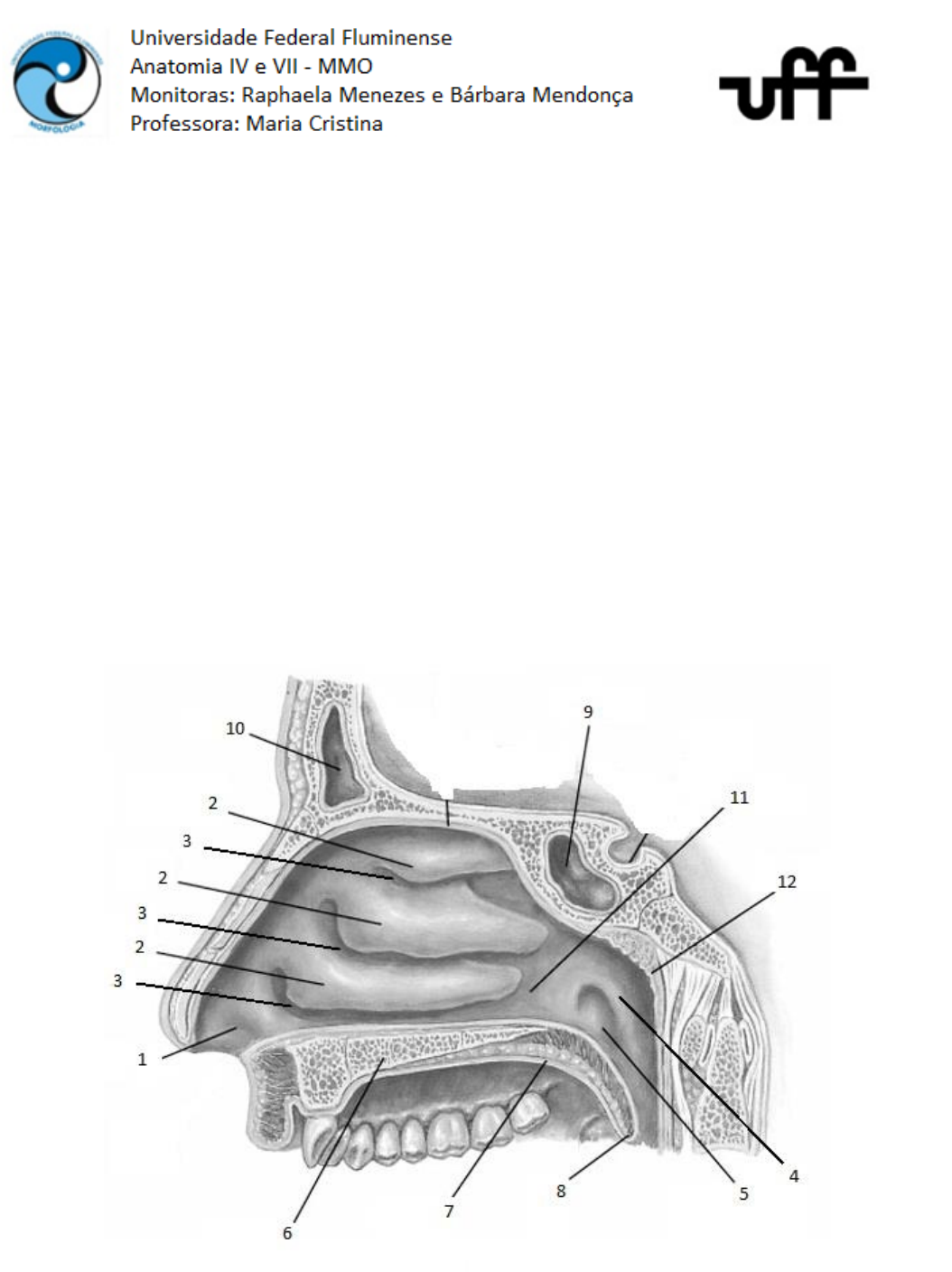 Estudo Dirigido II – Sistema Respiratório 1) Quais ossos compõem a cavidade nasal? 2) O óstio faríngeo da tuba auditiva possui uma função importante. Diga qual é. 3) Por quais estruturas o nariz externo é formado? 4) Qual estrutura é semelhante ao aparelho respiratório e ao aparelho digestório? 5) O que é a tonsila faríngea? Qual a sua função? 6) Qual o caminho percorrido pelo ar quando inspirado através das narinas? 7) Sobre as conchas nasais, cite quais são as suas funções, juntamente com os meatos nasais. 8) Dê nome às estruturas assinaladas de 1 a 12: 9) Qual a função do arcabouço ósseo torácico? 10) Relacione: a) Costelas verdadeiras ( ) costelas 11 e 12 b) Costelas falsas ( ) costelas 1 – 7 c) Costelas flutuantes ( ) costelas 8 – 10 11) Complete Os músculos da parede ___________ preenchem os espaços entre as costelas ou se inserem no _________ ou nas __________,para depois se inserirem nas costelas ou nas _______________ costais. Funcionalmente, os ____________ da parede torácica mantem os espaços __________ rígidos, impedindo que tais espaços fiquem inchados na expiração ou sejam sugados para dentro na inspiração. 12) A pleura parietal possui três faces. Quais são elas e com o que se relacionam? 13) Identifique na imagem abaixo as seguintes estruturas: a) Impressão cardíaca b) Impressão da veia cava superior c) Nos hilos pulmonares: a veia, a artéria e o brônquio d) Fissura oblíqua e) Fissura horizontal f) Ápice g) Lobo superior h) Lobo médio i) Lobo inferior j) Língula
