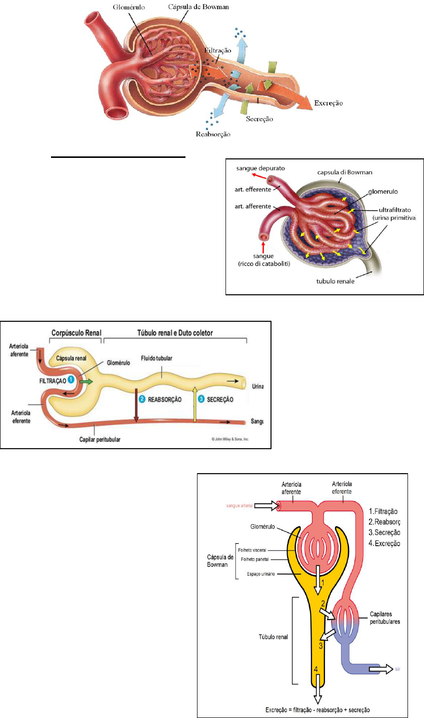 Resumo de Fisiologia - Guyton Greyce Azevedo – 2017.2 Formação da Urina: 1. Filtração glomerular (Filtra impurezas do organismo.) 2. Reabsorção tubular (Reabsorção de substâncias dos túbulos renais para o sangue) 3. Excreção tubular (Secreção de substâncias do sangue para os túbulos renais. Filtração glomerular Formação da urina ocorre quando grande quantidade de líquido praticamente sem proteínas é filtrado dos capilares glomerulares para o interior da cápsula de Bowman. A maior parte de substâncias do plasma exceto as proteínas é livremente filtrada de modo que a concentração filtrada na cápsula de Bowman seja a mesma do plasma. Na medida em que o líquido filtrado sai da capsula de bowman e flui pelos túbulos sua composição é modificada pela reabsorção de agua e solutos específicos de volta para os capilares peritubulares ou então pela secreção de outras substâncias dos capilares peritubulares para os túbulos. No processo de formação da urina a reabsorção tubular é mais importante do que a excreção, em termos quantitativos. A secreção tem papel fundamental qualitativo para determinar as quantidades de alguns íons como Potássio e Hidrogênio. A maioria das substâncias que devem ser depuradas no sangue principalmente como ureia, creatinina e ácido úrico são pouco reabsorvidos, e portanto, excretados em grande quantidade na urina. Algumas substâncias estranhas e fármacos também são pouco reabsorvidos, mas, além disso, são secretados do sangue para os túbulos, fazendo com quem suas intensidades de excreção sejam altas. Eletrólitos como Na+, Cl-, HCO3- (Sódio, Cloreto e Bicarbonato) são bastante reabsorvidos e por isso, pequena quantidade aparecerá na urina. Glicose e aminoácidos também são completamente reabsorvidos dos túbulos para o sangue, não aparecendo na urina, em condições normais. Para a maioria das substancias a intensidade de filtração e reabsorção são intensamente altas em relação as de excreção. Qualquer que seja o processo, ele deve ser regulado pelas intensidades corpóreas do indivíduo. Ex.: Quando ocorre excesso de sódio no corpo a intensidade com que o sódio é filtrado aumenta, e uma pequena fração é reabsorvida, resultando em excreção urinária aumentada de sódio, para que se mantenha o equilíbrio corporal do sódio. Processo de formação da urina Volume plasmático corporal = 3L Taxa de filtração glomerular (TFG) = 180L/dia Quantidade de urina = 1,5L por dia Vantagens da alta FG: 1. Néfrons e sistema renal evoluíram de tal forma que adquiriram capacidade vantajosa de fazer alta filtração glomerular, o que permite aos rins fazerem rápida eliminação de produtos indesejados, que dependem principalmente da filtração glomerular para sua excreção. 2. Os túbulos dos néfrons se desenvolveram de tal forma a garantir que a maioria dos produtos indesejáveis seja pouco reabsorvida e assim dependa da elevada FG para sua remoção efetiva do corpo 3. Permitir que todos os líquidos corporais sejam filtrados e processados pelos rins muitas vezes ao longo do dia. 4. Todo o plasma pode ser filtrado e processado 60x ao dia. 5. Alta FG permite aos rins controlar de maneira rápida e precisa o volume e composição dos líquidos corporais além de eliminar de maneira mais efetiva impurezas/ drogas/ substâncias impuras do organismo. Composição do FG: Tudo começa com a filtração de grande quantidade de líquidos por meio dos capilares glomerulares para cápsula de Bowman. Como a maioria dos capilares glomerulares são impermeáveis as proteínas, o líquido filtrado (filtrado glomerular) é fundamentalmente desprovido de proteínas e elementos celulares sanguíneos, como as hemácias Composição do líquido filtrado são semelhantes as concentrações do plasma: água e eletrólitos, cálcio e ácidos graxos* (substâncias de baixo peso molecular, que não são filtrados por estarem parcialmente ligados as proteínas plasmáticas.), desprovidos de proteínas e células. Dinâmica da filtração Determinada pelo balanço entre as forças hidrostáticas e coloidosmoticas (ou oncóticas) atuando através da membrana capilar. Membrana capilar glomerular: Possui 3 camadas principais: 1. Endotélio capilar 2. Membrana basal 3. Camada de células epiteliais (que possuem podócitos sobre superfície externa da Membrana basal capilar. Camadas unidas formam uma barreira de filtração que apesar de 3 camadas, filtra diversas vezes mais água e soluto que membrana capilar normal. Mesmo com essa capacidade de filtração, a membrana capilar glomerular normalmente não filtra proteínas plasmáticas (células endoteliais são ricamente dotadas de cargas elétricas negativas que impedem a passagem das proteínas plasmáticas por repulsão eletrostática.) A alta intensidade de filtração pela MCG ocorre, em parte, devido a uma característica especial desse endotélio capilar ser perfurado por milhares de pequenos orifícios chamados de fenestrações. Membrana basal Reveste o endotélio É formada por colágeno e fibras pequenas de proteoglicanos com grandes espaços que serão responsáveis pela grande quantidade de água em solutos que podem ser filtrados. Evita de modo eficiente que proteínas plasmáticas sejam filtradas (em partes devido á grande quantidade de carga elétrica negativa associadas aos proteoglicanos.) Podócitos Última camada da MCG Células epiteliais que recobrem a superfície do glomérulo Descontínuos Tem longas modificações da membrana plasmática, semelhante a pés, que revestem a superfície externa dos capilares. Separados por lacunas chamadas de fendas de filtração (onde filtrado glomerular irá se deslocar) Contêm cargas elétricas negativas Criam ainda mais dificuldade para filtração das proteínas plasmáticas Todas as camadas da parede capilar glomerular formam barreiras para filtração das proteínas do plasma (seletividade), sendo essas 