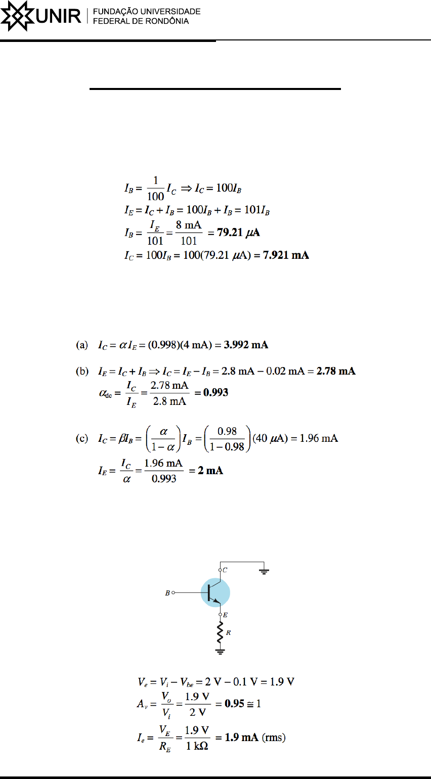 Lista 3 Sala Eletrônica I – ELE30028 1 - Qual é a origem da corrente de fuga de um transistor? 2 - Se a corrente de emissor de um transistor é de 8 mA e IB é 1/100 de IC, determine os valores IC e IB. Resposta: 3 – a) Dado aCA de 0,998, determine IC se IE = 4 mA. b) Determine aCC se IE = 2,8 mA e IB = 20 µA. c) Determine IE se IB = 40 µA aCC é 0,98. Resposta: 4 - Uma tensão de entrada de 2 V rms (medida da base para o terra) é aplicada ao circuito da Figura. Presumindo-se que a tensão de emissor siga exatamente a tensão de base e que Vbe(rms) = 0,1 V, calcule a amplificação de tensão do circuito (Av = Vo/Vi) e a corrente de emissor para RE = 1KW Resposta: 5 – Para a configuração de polarização fixa da Figura 4.118, determine: a) IBQ b) ICQ c) VCEQ d) VC e) VB f) VE Resposta: 6 – Dada a informação mostrada na Figura, determine: a)IC b)VCC c)b d)RB Resposta: 7 - Dada a informação fornecida na Figura, determine: a) b b) VCC c) RB Resposta: 8 - Determine os parâmetros a seguir para a configuração com divisor de tensão da Figura, utilizando o método aproximado, se a condição estabelecida pela Equação a seguir for satisfeita. a) IC b) VCE c) IB d) VE e) VB Resposta: 9 - Para a configuração com realimentação de coletor da Figura, determine: a) IB b) IC c) VC Resposta: 10 - Para o circuito da Figura, determine: a) IB b) IC c) VCE d) VC Resposta: