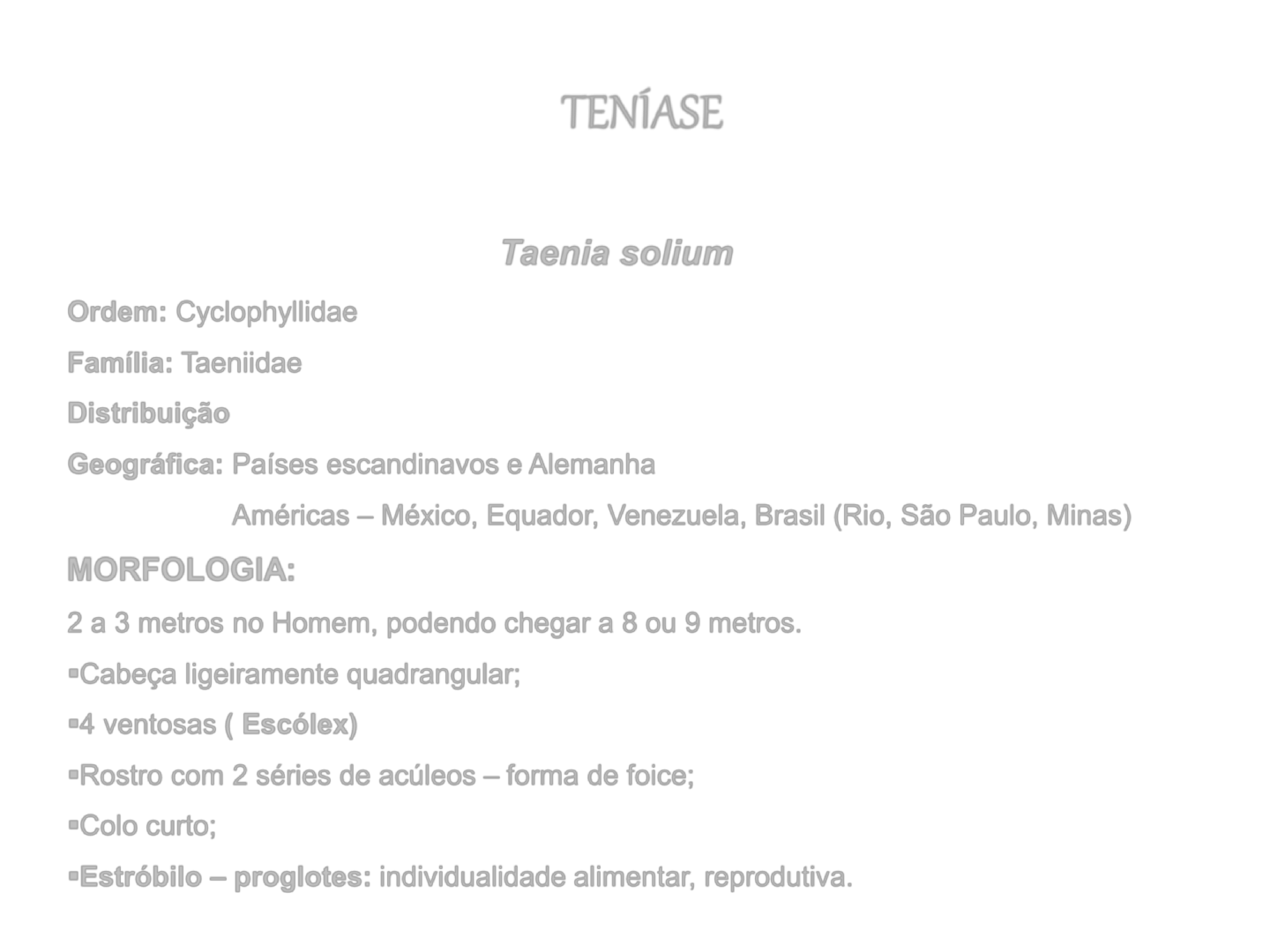 TENÍASE Taenia solium Ordem: Cyclophyllidae Família: Taeniidae Distribuição Geográfica: Países escandinavos e Alemanha Américas – México, Equador, Venezuela, Brasil (Rio, São Paulo, Minas) MORFOLOGIA: 2 a 3 metros no Homem, podendo chegar a 8 ou 9 metros. Cabeça ligeiramente quadrangular; 4 ventosas ( Escólex) Rostro com 2 séries de acúleos – forma de foice; Colo curto; Estróbilo – proglotes: individualidade alimentar, reprodutiva. TENÍASE Colo Escólex Estróbilo: è o corpo do helminto, formado pela união de proglotes Colo: atividade reprodutora, origem das proglotes Escólex: órgão adaptado para fixação Rostelo T. solium TENÍASE Proglotes – jovens (mais largos que longos) – não apresentam órgãos sexuais desenvolvidos – maduros (tão longos quanto largos) – 1 metro, órgãos sexuais desenvolvidos – grávidos (mais longos que largos) – finais (útero completamente cheio de ovos) Taenia solium – proglotes saem junto com as fezes ou após a defecação, em número de 3 a 6 – pode passar desapercebida pois anéis saem junto com as fezes. Taenia saginata – proglotes saem ativamente – no intervalo das defecações. Ovos: esféricos, com casca protetora chamada de embrióforo. Ovo embrionado (oncosfera ou embrião) CISTICERCO: Larva da Taenia, cosntituido de escólex com quatro ventosas, rostelo e colo C.cellulosae: larva da T solium C. bovis: larva da T.saginata ( não tem rostelo) TENÍASE HABITAT: Intestino delgado do Homem. Hospedeiro-intermediário T. solium – suíno(normal); outros (macaco, cão e o próprio Homem; T. saginata – bovinos Teníase: Alteração provocada pela presença da forma adulta da Taenia no intestino do homem Cisticercose: Alteração provocada pela presença das larvas nos tecidos de seus hospedeiros intermediários CICLO BIOLÓGICO: Proglotes com ovos (30 a 40 mil até 80 mil) Ovos com embrião ou oncosfera (3 pares de acúleos) ingerido pelo H.I No estômago do suino, a oncosfera resiste ao suco gástrico graças a sua casca estriada. ação da pepsina Casca fragmenta-se no suco intestinal. Ação de sais biliares Oncosfera migra até os capilares Cysticercus cellulosae (sobrevive cerca de 2 anos) Ingestão de carne mal passada ou mal cozido Instala-se nos músculos sublinguais do suino, músculo diafragmático, cérebro 2 a 3 meses Tênia TENÍASE Permanecem viáveis por até um ano. Dessecação mata os ovos Fixação do Cysticercus no intestino TENÍASE OBS: • Homem parasitado elimina proglotes grávidas cheias de ovos no meio externo, onde rompem-se • As proglotes podem também, romper-se dentro do intestino e os ovos serem eliminados nas fezes. •Oncosferas: desenvolvem-se em para cisticercos em qualquer tecido mole(pele, músculo, cérebro, olho...) TENÍASE TRANSMISSÃO DA CISTICERCOSE: Ingestão acidental de ovos viáveis de T.solium Auto-infecção externa – ovos de T.solium levados à boca a partir de maus hábitos de higiene; Auto-infecção interna – vômitos ou movimentos retro-peristálticos; Heteroinfecção – alimentos contaminados. Ingestão de ovos T.solium de outro paciente TRANSMISSÃO DA TENÍASE: Ingestão de carne( crua ou mal cozida) infectada com cisticerco ID homem Tênia PATOGENIA E SINTOMATOLOGIA: Teníase – tonturas, apetite excessivo, náuseas, vômitos, alargamento do abdômen, dores abdominais (mais ou menos intensas) e perda de peso. Cisticercose – de cada 10.000 pessoas 100 com nerocisticercose. 30 com cisticercose ocular. TENÍASE SINTOMAS: A) Neurocisticercose: dores de cabeça com vômitos; ataques epileptiformes – muito freqüentes; delírio; prostração; alucinações. Cisticerco maduro em 6 meses morre inflamação ( manifestação clínica) e calcificação B) Ocular: perda total ou parcial da visão; às vezes, até perda do olho; pode produzir catarata. C) Muscular: dor, nas pernas, nuca, região lombar, etc (depende da localização), fadiga e cãibras. TENÍASE DIAGNÓSTICO: Parasitológico (Teníase) Pesquisa de proglotes e mais raramente de ovos nas fezes. Clínico: tomografia TENÍASE Carne de porco com Cysticercus cellulosae TENÍASE Alguns Cysticercus isolados da carne TENÍASE Escólex de Taenia solium corado pelo carmim TENÍASE Proglote de Taenia solium corado pelo carmim TENÍASE Proglote de Taenia saginata corado pelo carmim TENÍASE Proglotes de uma única Taenia TENÍASE Ovo de Taenia sp