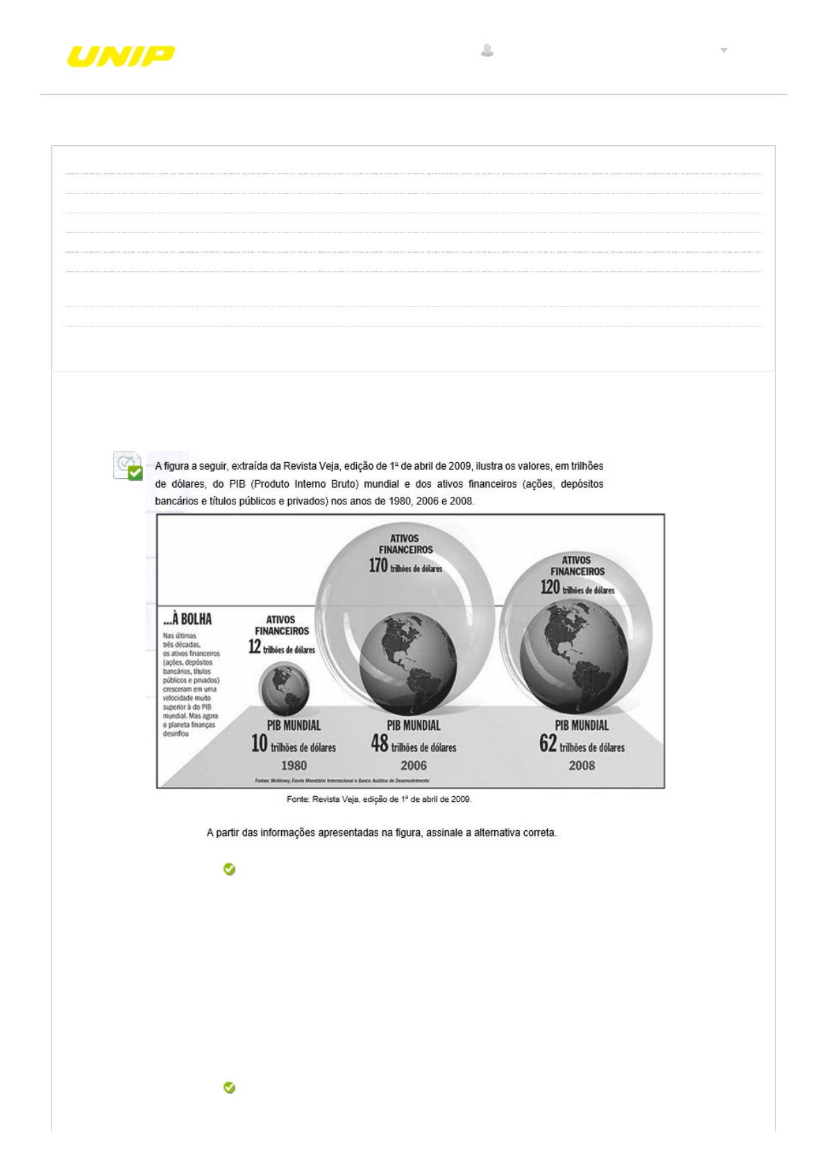 10/04/2018 Revisar envio do teste: QUESTIONÁRIO UNIDADE I – 6668-10... https://ava.ead.unip.br/webapps/assessment/review/review.jsp?attempt_id=_2617698_1&course_id=_11992_1&content_id=_191640_1&return_content=1&step= Revisar envio do teste: QUESTIONÁRIO UNIDADE IEstudos Disciplinares V 6668-10_SEI_AD_0417_R_20181 CONTEÚDO Usuário emmanuelle.lieczkovski @unipinterativa.edu.br Curso Estudos Disciplinares V Teste QUESTIONÁRIO UNIDADE I Iniciado 10/04/18 09:00 Enviado 10/04/18 09:13 Status Completada Resultado da tentativa 5 em 5 pontos Tempo decorrido 13 minutos Resultados exibidos Todas as respostas, Respostas enviadas, Respostas corretas, Comentários, Perguntas respondidas incorretamente Pergunta 1 Resposta Selecionada: d. Respostas: a. b. c. d. De 2006 a 2008, o PIB mundial cresceu, aproximadamente, 30%; enquanto os ativos �nanceiros decresceram, aproximadamente, 30%. Considerando apenas os anos de 1980 e de 2008, veri�ca-se que os ativos �nanceiros cresceram à taxa de 100%, ou seja, aumentaram de 12 trilhões de dólares para 120 trilhões de dólares. Considerando apenas os anos de 1980 e de 2008, veri�ca-se que os ativos �nanceiros cresceram à taxa de 10%, ou seja, aumentaram de 12 trilhões de dólares para 120 trilhões de dólares. De 1980 a 2006, o PIB mundial e os ativos �nanceiros cresceram em igual razão, conforme mostrado pela razão dos globos terrestres e pelas respectivas bolhas. De 2006 a 2008, o PIB mundial cresceu, aproximadamente, 30%; enquanto os ativos �nanceiros decresceram, aproximadamente, 30%. CONTEÚDOS ACADÊMICOS BIBLIOTECAS MURAL DO ALUNO TUTORIAISUNIP EAD 0,5 em 0,5 pontos emmanuelle.lieczkovski @unipinterativ... 2 10/04/2018 Revisar envio do teste: QUESTIONÁRIO UNIDADE I – 6668-10... https://ava.ead.unip.br/webapps/assessment/review/review.jsp?attempt_id=_2617698_1&course_id=_11992_1&content_id=_191640_1&return_content=1&step= e. Feedback da resposta: Se os ativos �nanceiros decrescerem de 2008 a 2009 na mesma taxa em que decresceram de 2006 a 2008, o valor dos ativos �nanceiros em 2009 seria de 70 trilhões de dólares. . Pergunta 2 (Enade 2006) A legislação de trânsito brasileira considera que o condutor de um veículo está dirigindo alcoolizado quando o teor alcoólico de seu sangue excede 0,6 gramas de álcool por litro de sangue. O grá�co mostra o processo de absorção e eliminação do álcool quando um indivíduo bebe, em um curto espaço de tempo, de 1 a 4 latas de cerveja. 0,5 em 0,5 pontos 10/04/2018 Revisar envio do teste: QUESTIONÁRIO UNIDADE I – 6668-10... https://ava.ead.unip.br/webapps/assessment/review/review.jsp?attempt_id=_2617698_1&course_id=_11992_1&content_id=_191640_1&return_content=1&step= Resposta Selecionada: d. Respostas: a. b. c. d. e. Feedback da resposta: Considere as a�rmativas a seguir: I - O álcool é absorvido pelo organismo muito mais lentamente do que é eliminado. II - Uma pessoa que vá dirigir imediatamente após a ingestão da bebida pode consumir, no máximo, duas latas de cerveja. III - Se uma pessoa toma rapidamente quatro latas de cerveja, o álcool contido na bebida só é completamente eliminado após se passarem cerca de 7 horas da ingestão. Está(ão) correta(s) a(s) a�rmativa(s): II e III, apenas. II, apenas. I e II, apenas. I e III, apenas. II e III, apenas. I, II e III. Resposta: D Comentário: AFIRMATIVA I INCORRETA. A velocidade de absorção é maior que a velocidade de eliminação. Ver no grá�co que o tempo para atingir o pico de concentração de álcool é menor que o tempo para sair do pico e chegar ao nível zero de álcool no sangue. AFIRMATIVA II CORRETA. Se o máximo permitido era de 0,6 g/l, com 2 latas, esse limite ainda não é excedido (chega a 0,44 g/l). Com 3 latas, esse limite é excedido (chega a 0,7 g/l). AFIRMATIVA III CORRETA. Para 4 latas, o tempo necessário par a eliminação do álcool é de 7 horas. Pergunta 3 (Enade 2006) A tabela mostra como se distribui o tipo de ocupação dos jovens de 16 a 24 anos que trabalham em 5 regiões metropolitanas e no Distrito Federal. 0,5 em 0,5 pontos 10/04/2018 Revisar envio do teste: QUESTIONÁRIO UNIDADE I – 6668-10... https://ava.ead.unip.br/webapps/assessment/review/review.jsp?attempt_id=_2617698_1&course_id=_11992_1&content_id=_191640_1&return_content=1&step= Resposta Selecionada: c. Respostas: a. b. c. d. e. Feedback da resposta: Das regiões estudadas, aquela que apresenta o maior percentual de jovens sem carteira assinada, dentre os jovens que são assalariados do setor privado, é: Recife. Belo Horizonte. Distrito Federal. Recife. Salvador. São Paulo. Resposta: C Pergunta 4 (Enade 2007) Os países em desenvolvimento fazem grandes esforços para promover a inclusão digital, ou seja, o acesso, por parte de seus cidadãos, às tecnologias da era da informação. Um dos indicadores empregados é o número de hosts, isto é, o número de computadores que estão conectados à internet. A tabela e o grá�co mostram a evolução do número de hosts nos três países que lideram o setor na América do Sul. 0,5 em 0,5 pontos 10/04/2018 Revisar envio do teste: QUESTIONÁRIO UNIDADE I – 6668-10... https://ava.ead.unip.br/webapps/assessment/review/review.jsp?attempt_id=_2617698_1&course_id=_11992_1&content_id=_191640_1&return_content=1&step= Resposta Selecionada: d. Respostas: a. b. c. d. e. Feedback da resposta: Dos três países, os que apresentaram, respectivamente, o maior e o menor crescimento percentual no número de hosts, no período 2003−2007, foram: Colômbia e Brasil. Brasil e Colômbia. Brasil e Argentina. Argentina e Brasil. Colômbia e Brasil. Colômbia e Argentina. Resposta: D Pergunta 5 (Enem 2008) O grá�co mostra a área desmatada da Amazônia, em km2, a cada ano, de 1988 a 2008. 0,5 em 0,5 pontos 10/04/2018 Revisar envio do teste: QUESTIONÁRIO UNIDADE I – 6668-10... https://ava.ead.unip.br/webapps/assessment/review/review.jsp?attempt_id=_2617698_1&course_id=_11992_1
