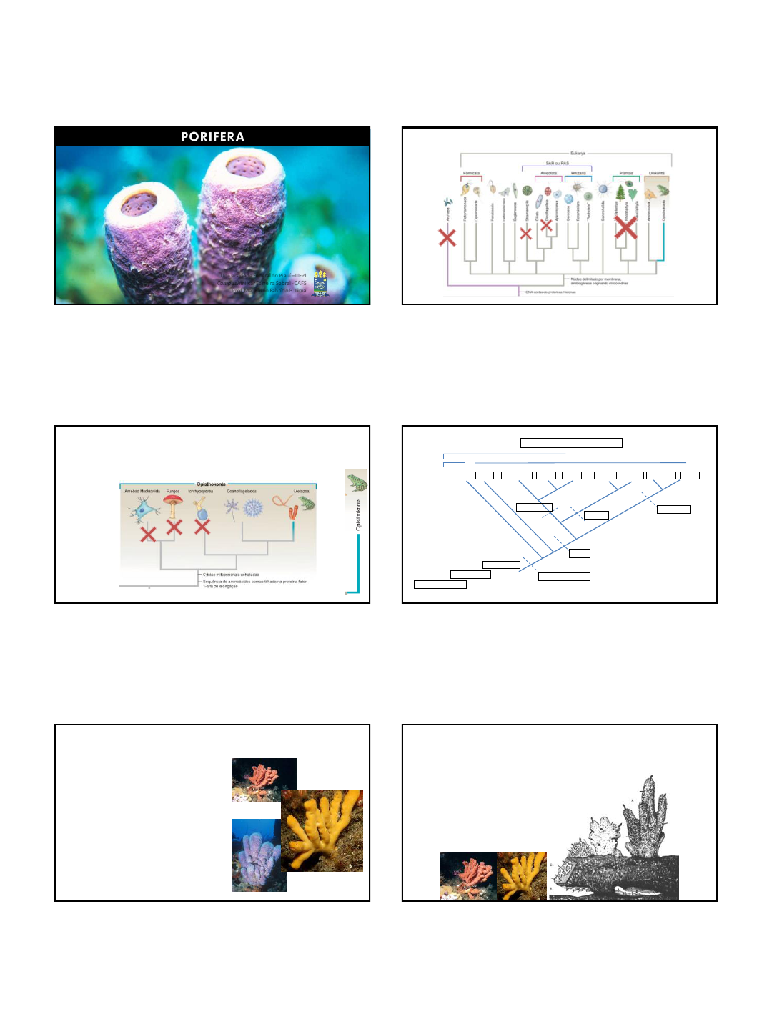 13/05/2014 1 Prof. Leonardo Carvalho Universidade Federal do Piauí Campus Amílcar Ferreira Sobral Curso de Licenciatura em Ciências Biológicas Universidade Federal do Piauí –UFPI CampusAmílcar Ferreira Sobral - CAFS Prof. Me. Élison Fabrício B. Lima Relembrando... Protozoários CLADO OPISTHOKONTA • Flagelo na região posterior do corpo; • Cristas mitocondriais achatadas Filogenia – Metazoa (principais grupos) Porifera Ancestral fungi-like (?) Chordata EumetazoaParazoa Mollusca Nematoda EchinodermataCnidaria Coanoflagelados (?) “Protozoa” (unicelulares) Metazoa (multicelulares) Annelida Bilateria Platyhelminthes Arthropoda Deuterostomia Ecdysozoa Lophotrochozoa • Porifera = portadores de poros • Cerca de 7 mil espécies; • Animais com variadas cores; • Geralmente amorfas; • Maioria séssil e fixa; • Maioria marinha; • Cerca de 150 espécies dulcícolas; • Maioria de águas rasas; • Importância econômica Porifera (porus – poro; ferre - possuir) - Crescimento indeterminado e sem limite superior; - Maciças, eretas, ramificadas ou incrustantes; - Relação com águas calmas; - A coloração depende de pigmentos celulares ou de endossimbiontes Porifera (porus – poro; ferre - possuir) 13/05/2014 2 Porifera (porus – poro; ferre - possuir) • Início: são antozoários? • Algumas características: - Filtradores – sistema aquífero; - Nível celular de construção; - Células totipotentes; - Células flageladas características: coanócitos; - Camadas de células sem membrana basal; - Mesoílo (Meso-hilo) com células móveis e geralmente esqueleto - Espículas (?) • Simétricos (radial, cônica ou cilindricamente) ou assimétricos (maioria). Porifera (porus – poro; ferre - possuir) Locomoção e dinâmica dos tecidos • Células internas ameboides: constante movimento; • Endopinacócitos e coanócitos podem mover-se para remodelar o sistema aquífero: • Aperfeiçoa o fluxo de água, enquanto a esponja cresce; • Quando encontra mudanças nas correntes de água; Clathrina coriacea Locomoção e dinâmica dos tecidos • Isso tudo é possível pela: • Ausência de junções intercelulares; • Ausência de lâmina basal; • Hemidesmossomos nos tecidos. • Algumas espécies: movimentos de até 4 mm/dia; • Clathrina coriacea: contrai o corpo inteiro Clathrina coriacea “Invertebrata” Fonte: Halanynch, 2004. Porifera 13/05/2014 3 TIPOS CELULARES • Pinacócitos: revestimento externo • Coanócitos: revestimento interno, nutrição • Porócitos: óstio de Ascon e muitos Sycon e Leucon • Arqueócitos: Células ameboides totipotentes • Lofócitos: segretam fibras de colágeno • Espongiócitos: segregam colágeno - espongina • Espermatócitos: células reprodutivas • Miócitos: movimentos • Esclerócitos: secretam espículas mineralizadas TIPOS CELULARES ESQUELETO • Normalmente: endoesqueleto – espículas no meso-hilo; • Algumas espécies: Camada externa de colágeno • Oscarella e Halisarca: meso-hilo gelatinoso, suportado apenas por fibras de colágeno; Oscarella lobularis Halisarca ESQUELETO • Secreção: - Esponjas calcárias: esclerócitos extracelularmente; - Demospôngias: esclerócitos intracelularmente; - Hexactinelídeos: intrasinsicialmente ESQUELETO • Espículas: minerais (calcário ou sílica), espongina ou ambos; • Formatos variados; • Importância taxonômica; ESQUELETO • Megascleras: formam o vigamento do esqueleto principal; • Microscleras: podem suportar o forro da pinacoderme do sistema de canais ou, quando em alta densidade, fortalecer a parede do corpo; • Podem projetar-se a partir do meso-hilo por sobre a pinacoderme: proteção; • Alguns Desmospongiae secretam exoesqueleto basal de CaCO3 maciço, no qual o corpo se apóia, além de espículas silicosas no meso-hilo. 13/05/2014 4 ESQUELETO • Esponjas sem espículas: espongina orgânica; • Exemplos: Spongia e Hippospongia, dentre outras, são frequentemente pressíveis, elásticas e “esponjosas” – Esponjas de banho; • Chondrilla: elevada densidade de espongina - esqueleto firme, duro e “borrachudo”; Spongia Chondrilla ESQUELETO • Esponginae espículas ocorrem juntas na maioria das esponjas; • Em algumas Haliclona, a espongina solda as pontas das espículas para formar uma rede esqueletal; • Dysidea: incorporação de grãos de areia, substituindo espículas Haliclona Dysidea Estrutura • Variável em tamanho e dependência de um sistema aquífero Formas • Existem 3 desenhos anatômicos em esponjas: Asconoide Siconoide Leuconoide Não há relação evolutiva!! Mais eficiente Mais comum Átrio Ósculo Poro Ósculo Poro Coanócitos Ósculo Poro ASCONOIDE • Cilindro oco, preso ao substrato em sua base; • Superfície externa: pinacoderme; • Superfície interna: coanoderme (coanócitos); • Muitos poros (óstios) pequenos perfuram a parede do cilindro; • Abertura maior (ósculo) localizada na extremidade superior do corpo; 13/05/2014 5 ASCONOIDE • Sistema aqüífero: óstio átrio ósculo; • Movimentação dos coanócitos • Raramente maiores que 10 cm; Geralmente milímetros; • Corpos tubulares em forma de vaso. Leucosolenia - tubo único ou agrupamento ASCONOIDE Clathrina – rede de tubos • Crescimento limitado pelo desenho corporal; • Capacidade de bombeamento torna-se deficitária ASCONOIDE Quero crescer! Como resolvo esse problema? Já sei! Novos desenhos corporais! SICONOIDE • Aumento da superfície e diminuição do volume atrial; • Bolsas de invaginações e evaginações na parede do corpo; • Formas simpes e complexas (córtex); • Aparecimento de câmaras coanocíticas (ou coanocitárias, flageladas ou canais radiais) • Caminho siconoides simples: óstio prosópila câmaras coanocíticas apópila átrio ósculo SICONOIDE 13/05/2014 6 • Caminho siconoides complexos: canal inalante prosópila câmara coanocítica apópila átrio ósculo • Esponjas siconoides são qu