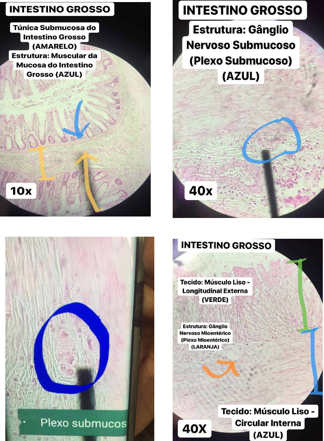 Qual é a principal diferença entre a histologia do intestino grosso e o intestino delgado? A) O intestino grosso possui vilosidades, enquanto o del...