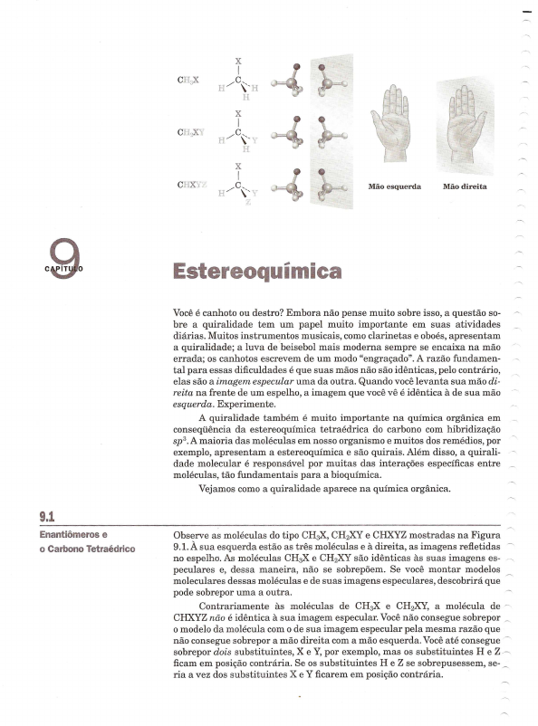 x I/c, H/ \'H H x I /C, H/ \'Y H Estereoquimica Voce e canhoto ou destro? Embora nao pense muito sobre is so, a questao so- bre a quiralidade tern urn papel muito import ante em suas atividades diarias. Muitos instrumentos musicais, como clarinetas e oboes, apresentam a quiralidade; a luva de beisebol mais moderna sempre se encaixa na mao errada; os canhotos escrevem de urn modo "engra~ado". A razao fundamen- tal para essas dificuldades e que suas maos nao SaDidenticas, pelo contrario, elas SaDa imagem especular uma da outra. Quando voce levanta sua mao di- reita na frente de urn espelho, a imagem que voce ve e identic a a de sua mao esquerda. Experimente. A quiralidade tamMm e muito import ante na quimica organic a em conseqiiencia da estereoquimica tetraedrica do carbono com hibridiza~ao sp3.Amaioria das moleculas em nosso organismo e muitos dos remedios, por exemplo, apresentam a estereoquimica e SaDquirais. Alem disso, a quirali- dade molecular e responsavel por muitas das intera~oes especificas entre moleculas, tao fundamentais para a bioquimica. Vejamos como a quiralidade aparece na quimica organica. Enantiomeros e o Carbono Tetraedrico Observe as mole cuIas do tipo CH3X, CH2XY e CHXYZ mostradas na Figura 9.1. A sua esquerda estao as tres moleculas e a direita, as imagens refietidas no espelho. As mole cuIas CH3X e CH2XY SaDidenticas as suas imagens es- peculares e, dessa maneira, nao se sobrepoem. Be voce montar modelos moleculares dessas moleculas e de suas imagens especulares, descobrira que pode sobrepor uma a outra. Contrariamente as moleculas de CH3X e CH2XY, a molecula de ~ CHXYZ naa e identic a a sua imagem especular. Voce nao consegue sobrepor ~ o modelo da molecula com 0 de sua imagem especular pela mesma razao que nao consegue sobrepor a mao dire ita com a mao esquerda. Voce ate consegue ~ sobrepor dais substituintes, X e Y, por exemplo, mas os substituintes H e Z.----. ficam em posi~ao contraria. Be os substituintes H e Z se sobrepusessem, se- ~ ria a vez dos substituintes X e Y ficarem em posi~ao contraria. FIGURA 9.1 Os atomos de carbona tetraedricos e suas x I /C, H/ \'H H imagens especulares. As ~ moleculas do tipo CH3Xe CH2XYsac identicas as suas imagens especulares, contrariamente a molecula do x I /C, H/ \'Y H tipo CHXYZ.A molecula CHXYZpode ser relacionada a sua imagem especular da ........mesma maneira que a mao direita esta relacionada a mao esquerda. H I HO--;C-C02H H,le FIGURA 9.2 Tentativas de sobreposigao das imagens H--especulares do acido latico: I /"(a) quando os substituin.tes Nao se r- -H e -OH se sobrepoem, os H 1sobrepoem 3ubstituintes -C02H e -CH3 HO--IC"'I---c02H =:dOe~:nSdOeb:::~::~ da ~~:~/- C--- CHo maneira como as moleculas Nao se ., /'- sobrepoem CO?HJejam orientadas, elas -'ao sac identicas. (a) As moleculas que SaDimagens especulares umas das outras, mas nao se sobrepoem, SaDdenominadas enantiomeros (derivado do grego enantio, que significa "oposto"). Os enantiomeros assemelham-se uns aos outros da mesma maneira que a mao direita se assemelha a mao esquerda. Os enan- tiomeros SaD0 resultado da presen<;a de urn carbono tetraedrico ligado a quatro substituintes diferentes. Por exemplo, 0 acido latico (acido 2-hidro- xipropan6ico) existe com urn par de enantiomeros porque possui quatro gru- pos diferentes ligados ao atomo de carbono central (-H, -OH, -CHa, -C02H). Os enantiomeros SaDchamados (+ )-acido latico e (- )-acido latico. H I CH3-y-C02H OH H ~ I /~~",-C-",Io H I H02C-C\--OH CH3 Nao importa 0 quanto tente, voce nao conseguira sobrepor a mole cui a de (+)-acido ,latico com a molecula de (- )-acido latico: as duas nao SaDiden- ticas como mostra a Figura 9.2. Be dois grupos se sobrepoem, -H e -C02H, por exemplo, os outros dois grupos restantes nao se sobrepoem. A Raz30 para a Quiralidade em Moleculas FIGURA 9.3 0 significado do plano de simetria. Um frasco de laborat6rio (a) possui um plano de simetria que separa 0 objeto em duas partes que SaDas imagens uma da outra. Um objeto - assim como uma mao - (b) nao possui plano de simetria; a metade "direita" da mao nao e a imagem especular da metade "esquerda". FIGURA 9.4 A molecula aquiral do acido propan6ico em comparac,;ao com a molecula quiral do acido latico. 0 acido propan6ico possui um plano de simetria que faz que um lado da molecula seja a imagem especular do outro lado. 0 acido latico nao possui plano de simetria. As moleculas que nao se sobrep6em com suas imagens especulares, origi- nando duas formas enantiomericas sao chamadas moleculas quirais (qui- ral, palavra de origem grega, cheir, que significa "mao"). Voce nao consegue sobrepor uma mOlecula quiral com seu enantiomero de forma que todos os atomos se coincidam. Como prever se uma determinada molecula e ou nao quiral? Uma molecula niio e quiral se ela contem um plano de simetria. Urn plano de simetria e aquele que passa pelo meio de urn objeto (ou uma molecula) de forma que a metade do objeto seja a imagem especular da outra. Por exem- plo, urn frasco de laborat6rio possui urn plano de simetria. Se voce pudesse cortar 0 frasco ao meio, uma metade seria a imagem especular da outra. Uma mao, ao contrario, nao possui plano de simetria. Uma "metade" da mao nao e a imagem especular da outra metade (Figura 9.3). Uma molecula que possui urn plano de simetria em qualquer uma de suas possiveis conformac;6es deve ser identica a sua imagem especular e, dessa maneira, e uma molecula nao-quiral ou aquiral. Assim, 0 acido pro- pan6ico possui urn plano de simetria quando disposto linearmente, como in- dica a Figura 9.4, e e, portanto, uma molecula aquiral. 0 acido latico (acido 2-hidroxipropan6ico), entretanto, nao possui plano de simetria em qualquer _ conformac;ao e, dessa forma, e uma molecula quiral. A causa mais comum da quiralidade em uma mole cuIa organica, ainda que nao seja a unica, e a presenc;a de urn atomo de carbono ligado a quatro grupos diferentes - por exemplo, 0 atomo de carbono central no acido latico. Esses carbonos sao denom