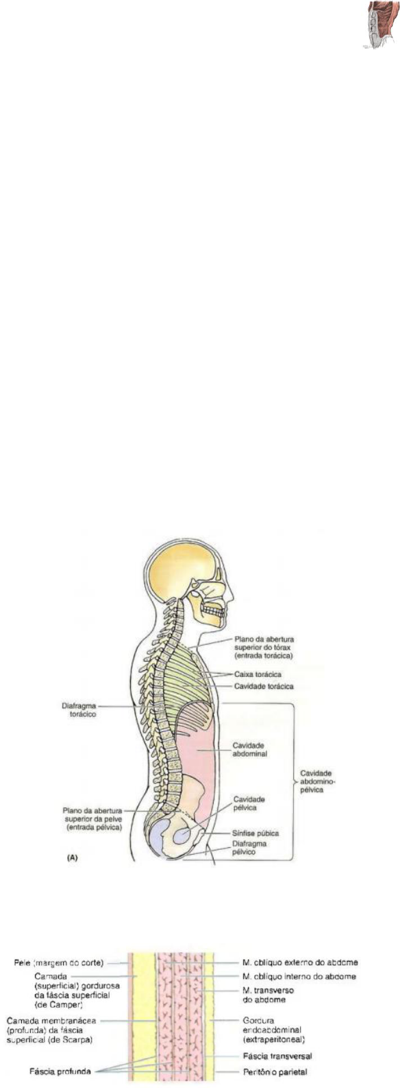 Carolina Targino 2018/1 Anatomia Parede Abdominal Anterolateral Abdome: A parte do tronco entre o tórax e a pelve, possui paredes musculotendíneas, exceto posteriormente onde a parede inclui as vértebras lombares e os discos intervertebrais. Limites: Superior: Cavidade torácica pelo M. diafragma (partes da cavidade abdominal e de seu conteúdo ficam contidas no tórax ósseo) Inferior: Abertura superior da pelve (arbitrário, pois a cavidade abdominal se comunica amplamente com a cavidade pélvica, com órgãos ditos abdominais podendo localizar-se parcial ou temporariamente na pelve e com órgãos pélvicos ocupando, às vezes, posição abdominal.) Pode-se dizer que a cavidade abdominal contém a maior parte dos órgãos do sistema digestivo, parte do sistema urogenital (rins, ureteres), o baço, as glândulas supra-renais, os grandes vasos e partes dos plexos autônomos. Contém também a grande membrana serosa do sistema digestivo, o peritônio, que envolve muitas vísceras abdominais. O esqueleto participa pouco das paredes abdominais, estando representado nela pelas cinco vértebras lombares, pelos discos interpostos aos corpos destas vértebras e pelas costelas mais inferiores. Suas paredes póstero-superior e ântero-lateral são eminentemente musculares e adaptam-se bem à expansão imposta pela gravidez ou pela obesidade. A maior parte da parede abdominal está disposta em camadas, que são as seguintes, da superfície para a profundidade: Pele Tela subcutânea: Camada superficial areolar (Camper): contínua com a tela que reveste o restante do corpo e que pode ser espessa nos obesos. Camada profunda membranácea (Scarpa): Estende-se sobre a parede torácica acima; Ao longo da linha axilar média lateralmente; Inferiormente, prolonga-se para a região anterior da coxa onde se funde com a fáscia muscular um dedo abaixo do ligamento inguinal; Na linha mediana não está fixada ao púbis, mas forma as bainhas tubulares para o pênis ou clitóris Abaixo continua-se sobre o períneo, formando um revestimento para o escroto ou lábio maior; No períneo se fixa de cada lado nas margens dos arcos do púbis; Posteriormente se funde com o centro tendíneo do períneo e com a margem posterior da membrana perineal. Músculos Fáscia endoabdominal (transversal) Tecido extraperitonial (gordura) Peritônio Parede Anterolateral do abdome Conceito Geral: É, habitualmente, dividida em nove regiões por duas linhas verticais e duas linhas horizontais. Existem diversas maneiras de posicionar as linhas de delimitação das regiões abdominais. Uma das maneiras mais utilizada na prática médica é aquela em que: As duas linhas verticais são as linhas hemiclaviculares, que vão do ponto médio da clavícula ao ponto médio do ligamento inguinal. A mais superior das linhas horizontais é plano subcostal, traçado tangenciando o ponto mais inferior da borda costal. A mais inferior das linhas horizontais é o plano transtubercular, que tangencia os tubérculos das cristas ilíacas. Nesta divisão as nove regiões da parede do abdome são, no sentido vertical e da direita para esquerda: Hipocôndrio direito Lombar direita Inguinal direita (ou fossa ilíaca direita) Epigástrica Umbilical Hipogástrica Hipocôndrio esquerdo Lombar esquerda Inguinal esquerda (fossa ilíaca esquerda) Nesta forma de divisão os limites da região inguinal não englobam a maior parte das estruturas relacionadas com a formação das hérnias inguinais. Assim, a substituição da linha hemiclavicular pela linha semilunar da bainha do m. reto amplia a área da região inguinal. Existem dificuldades em estabelecer a projeção das vísceras abdominais nas regiões da parede anterolateral. Apesar disto, a divisão da parede do abdome em regiões é útil para o registro dos sinais e sintomas dos pacientes, para a anotação dos resultados colhidos no exame físico destes pacientes e para auxiliar o direcionamento do raciocínio clínico. Pele: A pele da parede anterolateral do abdome é delgada, flexível e móvel. Glabra (sem pêlos) na sua maior parte apresenta, na região do púbis, uma distribuição pilosa típica. No terço médio da sua linha mediana está a cicatriz umbilical ou umbigo. Fundo da cúpula está em contato quase direto com o peritônio parietal, constituindo um ponto potencialmente fraco da parede abdominal. Tela subcutânea: Apresenta-se com duas camadas, uma superficial e adiposa, outra profunda e conjuntiva, as camadas areolar e laminar, respectivamente. A camada areolar (superficial) é de espessura muito variável, na dependência do estado nutricional do indivíduo. Na camada laminar (profunda) correm os principais vasos e nervos superficiais. Na sua parte inferior, mediana e anteriormente, encontra-se parte do ligamento suspensor do pênis (ou do clitóris), de natureza fibro-elástica. Obs.: Posteriormente a pele apresenta-se espessa, mobilizável lateralmente e fixa medianamente. A tela subcutânea, mediana e posteriormente, é densa, mais compacta, enquanto que anterolateralmente é mais frouxa. Músculos Anterolaterais: A proteção para os órgãos situados na cavidade abdominal depende, principalmente, de sua musculatura anterolateral que, além desta função, colabora com os músculos do dorso nos movimentos do tronco, na manutenção da posição ereta e ainda estabiliza a pelve quando, em decúbito dorsal ou ventral, se movem os membros inferiores. Apresenta-se em dois grupos: Um anterolateral, formado pelos m.m. o oblíquo externo, oblíquo interno e transverso, todos laminares e com suas fibras orientadas em sentido diferente; Situado medianamente, constituído pelo m. reto do abdome e pelo m. piramidal. A disposição espacial da musculatura anterolateral que lembra a de lâminas de madeira compensada comprimidas umas contra as outras com as fibras de cada lâmina orientadas diferentemente, o que lhe permite oferecer resistência com um mínimo de espessura. A aponeurose toracolomb