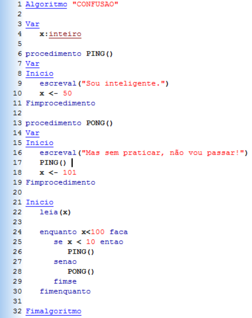 Questão 1/5 - Lógica de Programação e Algoritmos Nas Aulas 9 e 10 trabalhamos com funções e procedimentos. Observe o código abaixo que aborda este tema. Assinale a alternativa que contém a saída impressa na tela caso o valor lido na variável x seja 5. A Sou inteligente. Mas sem praticar, não vou passar! Sou inteligente. B Mas sem praticar, não vou passar! Sou inteligente. C Sou inteligente. Mas sem praticar, não vou passar! D Sou inteligente. E Mas sem praticar, não vou passar! Questão 2/5 - Lógica de Programação e Algoritmos A partir da Aula 5 trabalhamos com lógica iterativa. Na Aula 6 iniciamos os estudos com vetores e na Aula 7 iniciamos os estudos com matrizes. Acerca destes assuntos, observe as linhas de código abaixo. Nela temos uma matriz chamada preço recebendo diversos valores em diferentes posições. Avalie este bloco de código e selecione a alternativa que melhor se adequa para substituí-lo. A para i de 1 ate 2 faca para j de 1 ate 4 faca leia(preco[i,j]) fimpara fimpara B para i de 2 ate 1 faca para j de 4 ate 1 faca leia(preco(i,j)) fimpara fimpara C para i de 1 ate 2 faca para j de 1 ate 4 faca leia(preco[j,i]) fimpara fimpara D para i de 1 ate 2 faca para j de 1 ate 4 faca leia(preco[i]) fimpara fimpara E para i de 1 ate 4 faca para j de 1 ate 4 faca leia(preco[i,j]) fimpara fimpara Questão 3/5 - Lógica de Programação e Algoritmos A partir da Aula 5 trabalhamos com lógica iterativa. Na Aula 6 iniciamos os estudos com vetores. Acerca destes assuntos, observe as linhas de código abaixo. Nela temos uma matriz chamada preço recebendo diversos valores em diferentes posições. Avalie este bloco de código e selecione a alternativa que melhor se adequa para substituí-lo. A n<-8 para i de 1 ate n faca leia(preco(i)) fimpara B n<-8 para i de 1 ate n faca leia(preco[i]) fimpara C para i de 1 ate n faca leia(preco(k)) fimpara D para i de 1 ate n faca leia(preco) fimpara E para j de 1 ate n faca leia(preco) fimpara Questão 4/5 - Lógica de Programação e Algoritmos Nas aulas 9 e 10 trabalhamos com o conceito de funções pré-definidas. O algoritmo abaixo mostra o código que funciona da seguinte forma: o usuário digita uma palavra e uma letra qualquer e o pr ograma retorna (através da função pré-definida Pos) a posição daquela letra escolhida na palavra. Assinale a alternativa que explica exatamente o que acontece com o programa caso o usuário digite a palavra ARARA e escolha a letra A. A Neste caso a variável Posicao irá armazenar somente a posição da primeira ocorrência da letra A na palavra ARARA, não identificando todas as 3 ocorrências da mesma. B Neste caso a variável Posicao irá armazenar somente a posição da última ocorrência da letra A na palavra ARARA, não identificando todas as 3 ocorrências da mesma. C Neste caso a variável Posicao irá armazenar todas as 3 ocorrências da letra A na palavra ARARA. D Neste caso o programa dará um erro no VISUALG, não permitindo a execução do programa. E Neste caso a variável Posicao irá armazenar o valor ZERO, pois existem 3 ocorrências da letra A na palavra ARARA. Questão 5/5 - Lógica de Programação e Algoritmos Na Aula 9 trabalhamos com o conceito de Funções. Funções servem como um artifício de modularização do seu código. O algoritmo acima mostra um psedocódigo que contém uma função. Assinale a alternativa que descreve o funcionamento desta função. A A função calcula a soma dos quadrados dos valores. B A função calcula a soma do primeiro valor com o quadrado do segundo valor. C A função calcula a soma do quadrado do primeiro valor pelo segundo valor. D A função calcula o quadrado das somas dos valores. E A função calcula a razao dos quadrados dos valores.