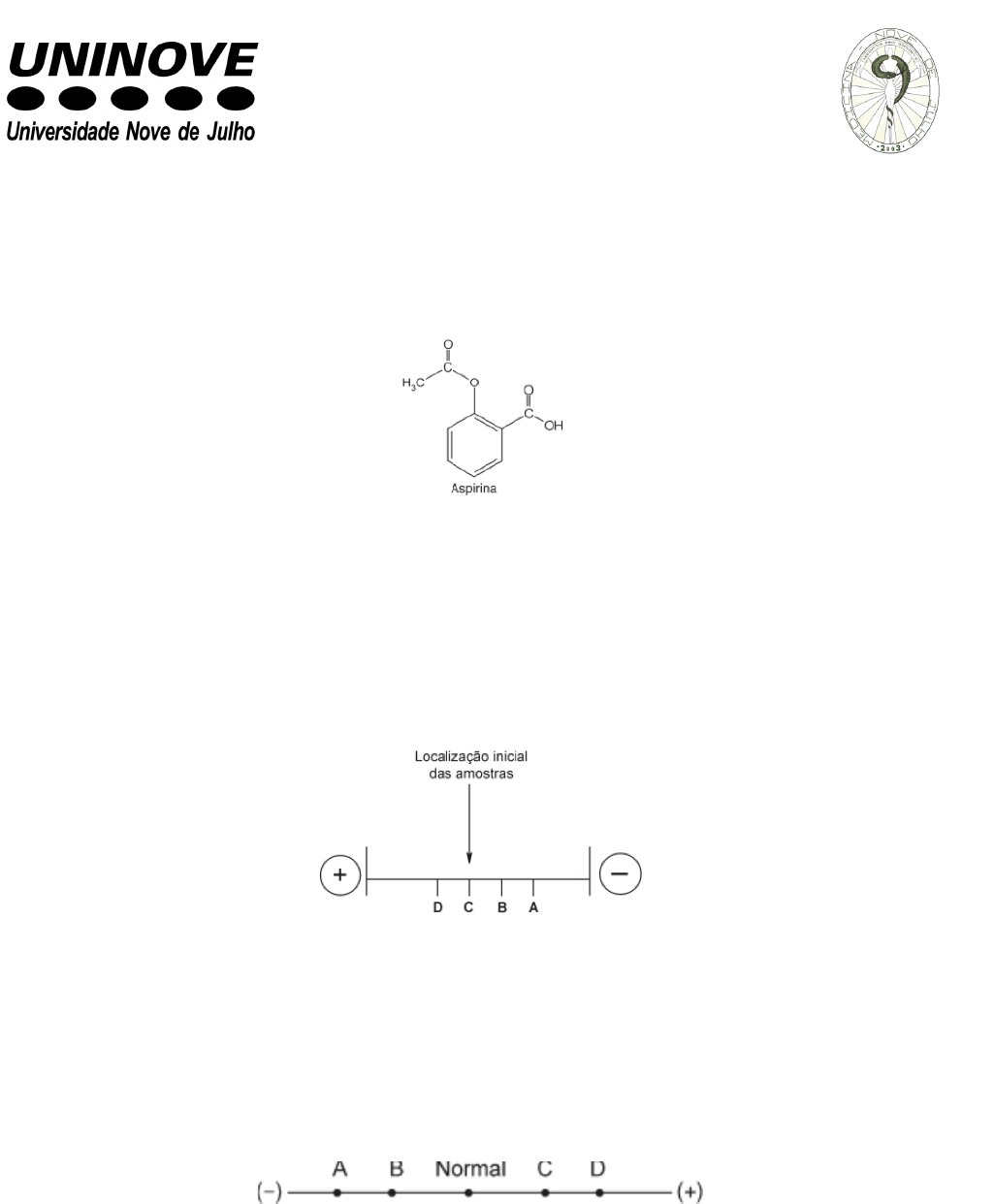 Bioquímica e Fisiologia Celular Medicina – XXIV – 2017 – 1º semestre Exercícios de Fixação 1. A aspirina (ácido acetilsalicílico) é um ácido fraco cujo pKa é 3,5. Com base nesta informação, a velocidade de sua absorção através da membrana plasmática seria maior no estômago (pH do suco gástrico = 1,5) ou no intestino delgado (pH = 6)? 2. Quatro soluções de um mesmo aminoácido foram submetidas à eletroforese em diferentes valores de pH (1; 6; 10 e 12), com a mesma voltagem e durante o mesmo tempo. Os resultados das quatro eletroforeses estão reunidos no esquema a seguir, onde a posição final do aminoácido está apresentada por A, B, C, D. Alanina: pK1 = 2,35; pK2 = 9,87 Aspartato: pK1 = 1,99; pK2 = 9,90; pKR = 3,90 Lisina: pK1 = 2,16; pK2 = 9,06; pKR = 10,54 a. O aminoácido utilizado foi Alanina, Aspartato ou Lisina? b. Fazer um esquema do resultado que seria obtido se o experimento houvesse sido feito com os outros dois aminoácidos. 3. A mobilidade eletroforética em pH = 8,6 da hemoglobina normal e de hemoglobinas anormais (que diferem da hemoglobina normal por substituição de um aminoácido) está representada abaixo: Identificar a posição (A, B, C ou D) correspondente a cada uma das seguintes hemoglobinas anormais: HbS — valina em lugar de glutamato HbJ — aspartato em lugar de glicina HbN — glutamato em lugar de lisina HbC — lisina em lugar de glutamato 4. Por que a tirosina é considerada um aminoácido essencial para fenilcetonúricos? Bioquímica e Fisiologia Celular Medicina – XXIV – 2017 – 1º semestre Exercícios de Fixação 5. De que maneira a atividade física promove uma melhora no quadro clínico de Fenilcetonúricos? Cite todas as moléculas envolvidas. 6. O aminoácido glicina é frequentemente utilizado como o ingrediente principal de um tampão de eletroforese em gel de poliacrilamida. O grupo amino da glicina, que tem pKa de 9,6, pode existir tanto na forma protonada (-NH3+) quanto como base livre (- NH2), devido ao equilíbrio reversível R-NH3+ R-NH2 + H+ a. Em qual intervalo de pH a glicina pode ser usada como tampão efetivo devido ao seu grupo amino? b. Em uma solução de 0,1M de glicina em pH 9, qual a fração de glicina que tem os seus grupos amino na forma – NH3+? c. Quando 99% das glicinas estão na forma –NH3+, qual a relação numérica entre o pH da solução e o pKa do grupo amino?