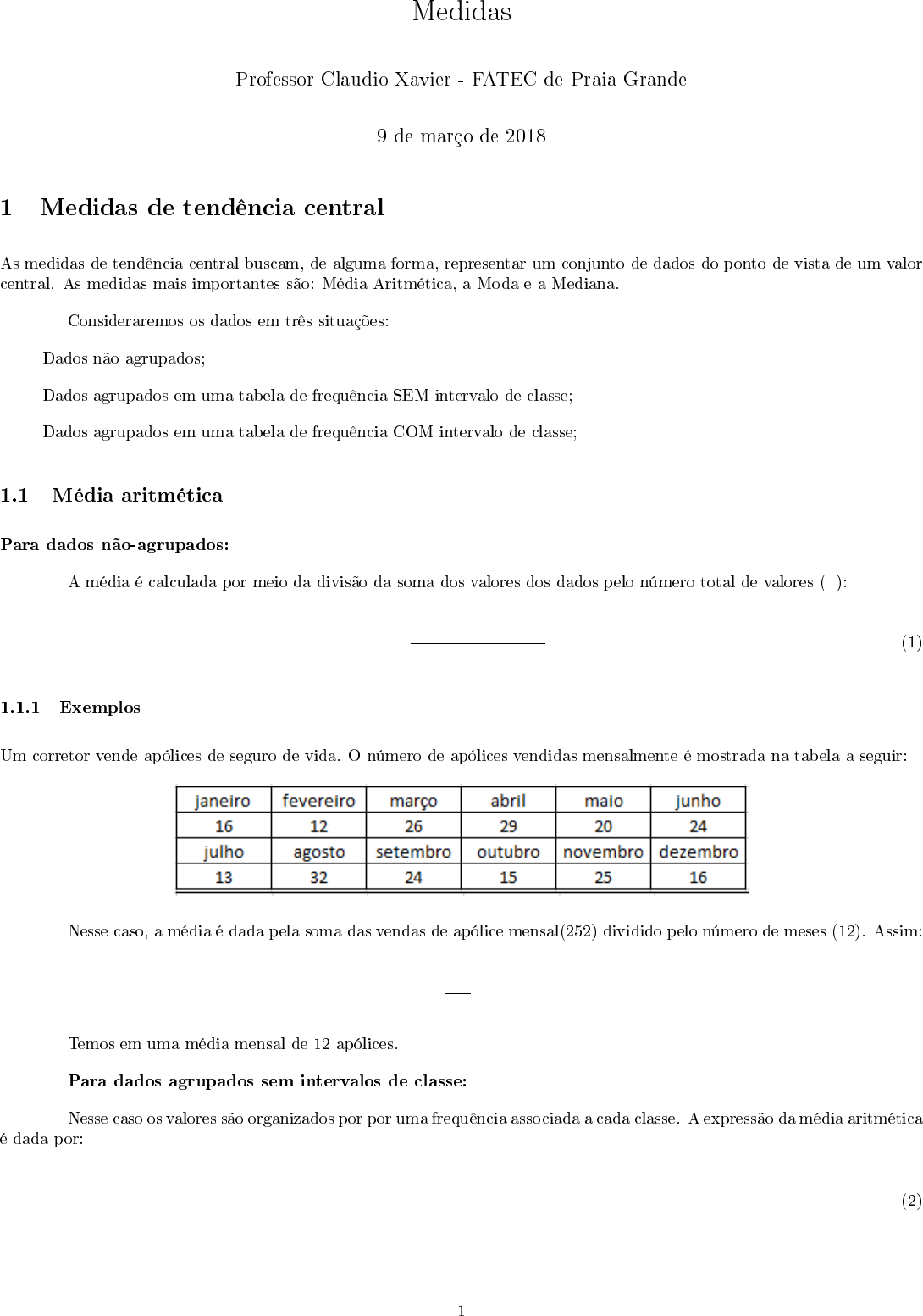 Medidas Professor Claudio Xavier - FATEC de Praia Grande 9 de março de 2018 1 Medidas de tendência central As medidas de tendência central buscam, de alguma forma, representar um conjunto de dados do ponto de vista de um valor central. As medidas mais importantes são: Média Aritmética, a Moda e a Mediana. Consideraremos os dados em três situações: • Dados não agrupados; • Dados agrupados em uma tabela de frequência SEM intervalo de classe; • Dados agrupados em uma tabela de frequência COM intervalo de classe; 1.1 Média aritmética x¯ Para dados não-agrupados: A média é calculada por meio da divisão da soma dos valores dos dados pelo número total de valores (n): x¯ = x1 + x2 + · · ·+ xn n (1) 1.1.1 Exemplos Um corretor vende apólices de seguro de vida. O número de apólices vendidas mensalmente é mostrada na tabela a seguir: Nesse caso, a média é dada pela soma das vendas de apólice mensal(252) dividido pelo número de meses (12). Assim: x¯ = 252 12 = 21 Temos em uma média mensal de 12 apólices. Para dados agrupados sem intervalos de classe: Nesse caso os valores são organizados por por uma frequência associada a cada classe. A expressão da média aritmética é dada por: x¯ = x1f1 + x2f2 + · · ·+ xnfn n (2) 1 1.1.2 Exemplos Foi realizada uma pesquisa em 50 residências da cidade de São Paulo com o objetivo de saber qual é o número de computadores em cada casa. A tabela a seguir mostra os resultados da pesquisa. Calcule a média. Resolução É prático acrescentar uma coluna ao lado da tabela e calcular cada valor de xifi: Observa-se que o total das parcelas xifi é dado por 86 e o número de dados é 50, temos que a média é: x¯ = 86 50 = 1, 72 Para dados agrupados com intervalos de classe: Nesse caso utiliza-se a mesma fórmula destacada no caso anterior. Entretanto, cada valor de xi deve ser calculado para cada intervalo de classe (como definimos na aula anterior). x¯ = x1f1 + x2f2 + · · ·+ xnfn n (3) Com xi = li + Li 2 (4) Exemplo Com o objetivo de regulamentar a configuração de aviões de transporte de passageiros, para especificar a distância entre o encosto e o assento e a largura das poltronas das aeronaves, uma empresa realizou o levantamento da altura dos passageiros, sendo que os resultados são apresentados na tabela a seguir: Nesse caso, deve ser calculado o ponto médio xi e os valores de xifi em duas colunas, como a seguir: Observando o total, temos que a média aritmética é dada por: x¯ = 18.754, 5 109 = 172, 06cm 1.2 Moda A moda é o dado que ocorre com maior freqUência em um conjunto de dados (esse dado é denominado valor modal). 2 Tabela 1: Tabela de frequência com a estatura dos passageiros i Estaturas (cm) xi Número de passageiros (fi) 1 150 ` 157 7 2 157 ` 164 19 3 164 ` 171 25 4 171 ` 178 26 5 178 ` 185 21 6 185 ` 192 8 7 192 ` 199 3 Total Tabela 2: Tabela de frequência com a estatura dos passageiros i Estaturas (cm) xi Número de passageiros (fi) 1 150 ` 157 7 153,5 1074,5 2 157 ` 164 19 160,5 3049,5 3 164 ` 171 25 167,5 4187,5 4 171 ` 178 26 174,5 4537,0 5 178 ` 185 21 181,5 3811,5 6 185 ` 192 8 188,5 1058,0 7 192 ` 199 3 195,5 586,5 Total 18754,5 Moda para dados não agrupados Exemplo Uma série é dado pelos dados brutos: 4,5,7,10,2,12,8,7,5,2,10,8,11,7,3,9,6,8 Organizando os valores em ordem crescente: 2,2,3,4,5,5,6,7,7,7,7,8,8,8,9,10,10,11,12. Temos que a o valor modal é 7 Mo = 7 Moda para dados agrupados sem intervalos de classe A partir da definição de moda, observa-se dado que possui maior frequência. Moda para dados agrupados com intervalos de classe Quando os dados são agrupados em intervalos de classe, a determinação da moda não é imediata. Para tal, deve ser usada a Fórmula de Czuber. Primeiramente deve ser determinada a classe com maior frequência, chamada de CLASSE MODAL. Em seguida devem ser determinados os valores: • lMo = limite inferior da classe modal • d1 = diferença entre a frequência da classe modal e a frequência da classe modal anterior a classe modal • d2 = diferença entre a frequência da classe modal e a frequência da classe modal posterior a classe modal • hMo = amplitude da classe modal Por fim, calcula-se a moda através da Fórmula de Czuber Mo = lMo + d1 d1 + d2 hMo 3 i Idade xi Pessoas que usaram a internet (fi) 1 10 ` 18 66 2 18 ` 26 87 3 26 ` 34 54 4 34 ` 42 42 5 42 ` 50 29 6 50 ` 58 16 7 58 ` 66 6 Total 1.2.1 Exemplos No bairro de Vila Mariana, foi realizada uma pesquisa relativa à idade de pessoas que utilizaram a internet nos últimos três meses. Calcule a idade modal dessa amostra. 1. A classe modal tem frequência 87, assim fMo = 87 2. As diferenças são dados por d1 = 87− 66 = 21 e d2 = 87− 54 = 33 3. O limite inferior da classe modal lMo = 18 4. E a amplitude da classe modal hMo = 26− 18 = 8. 5. Aplicando a Fórmula, temos: Mo = lMo + d1 d1 + d2 hMo = 18 + 21 21 + 33 8 = 21, 11 Portanto, a idade modal é 21,11 anos. 4 Exercícios Entregar na próxima aula 1. Determinar a media e a moda dos seguintes conjuntos de valores: (a) 2,3; 2,1; 1,5 ;1,9; 3,0; 1,7; 1,2; 2,1; 2,5 ;1,3; 2,0 ;2,7 0,8; 2,3; 2,1; 1,7 (b) 37; 38 ;33 ;42 ;35; 44; 36; 28; 37 ;35; 33; 40 ;36 ;35 ;37 2. Uma empresa produz vasos de cerãmica que são embalados em caixas. Em uma pesquisa realizada com uma amostra de caixas, revelou-se a existência de vasos defeituosos segundo a tabela abaixo: Pede-se: (a) Determine o valor médio de vasos defeituosos por caixa. (b) Determine o valor modal (moda) de vasos defeituosos por caixa. (c) Quantas caixas tem 2 ou mais vasos com defeito? Calcule o percentual. (d) Quantas caixas tem mais de 2 vasos com defeito? Calcule o percentual. (e) Quantas caixas tem tem pelo menos quatro vasos com defeito? Calcule o percentual. 3. Uma empresa especializada avalia o desempenho de uma fábrica em relação a produção diária de para-choques. Foi avaliado um período de 60 dias e os dados de produção foram organizados na tabela a segui