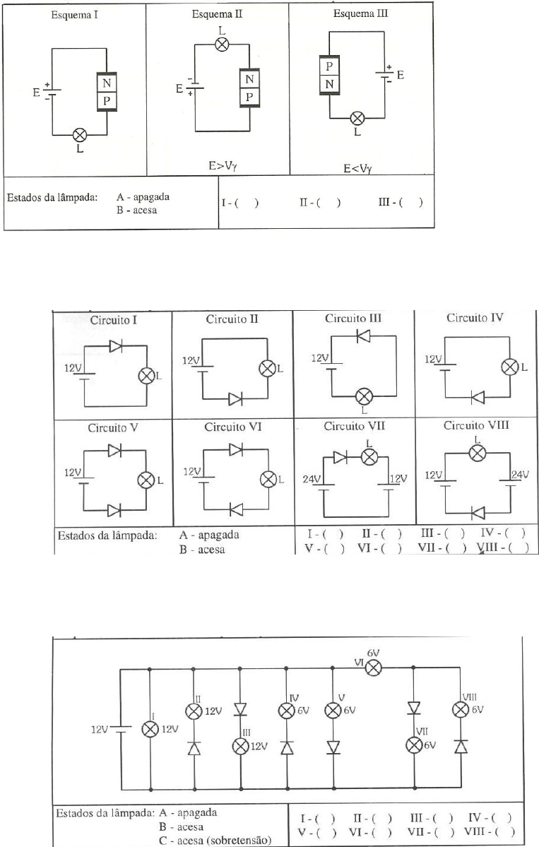 QUESTIONÁRIO 1 - Analise os esquemas I, II e III, e relacione-os com os estados A e B da lâmpada. 2 - Analise os circuitos I a VIII abaixo e relacione-os com os estados A e B das lâmpadas, sendo que todas eles estão especificadas para trabalharem com uma tensão elétrica de 12V. 3- Analise o circuito abaixo e indique o estado (A, B e C) em que se encontra cada uma das lâmpadas considerando suas especificações de tensão elétrica. 4 - A figura abaixo corresponde à curva característica do diodo retificador BY127. Determine graficamente os valores de aproximados de Vγ e rf. 5 - O diodo de Silício 1N914 possui as seguintes especificações: Vϒ=1,0 V e I Fmáx = 75 mA 6 - Considere o circuito e a curva característica do diodo ao lado: 7 -Considere o circuito do exercício 6, item (a) 8. Dê exemplos de materiais semicondutores. 9. Dê exemplo de impureza usada na preparação de um semicondutor tipo N? 10. Quais são os portadores de carga num material tipo P? 11. Qual é o fenômeno que ocorre na junção entre dois materiais semicondutores, um do tipo N, e outro do tipo P? 12. Quais são os componentes formados por uma única junção entre materiais tipo P e N? 13. Qual é a tensão mínima que precisamos aplicar a um diodo de germânio no sentido inverso? 14. A que se deve a pequena corrente que circula num diodo polarizado no sentido inverso? 15. Quais são os matérias semicondutores usados na fabricação dos diodos emissores de luz? 16. De que maneira é polarizado um diodo zener para funcionamento normal?