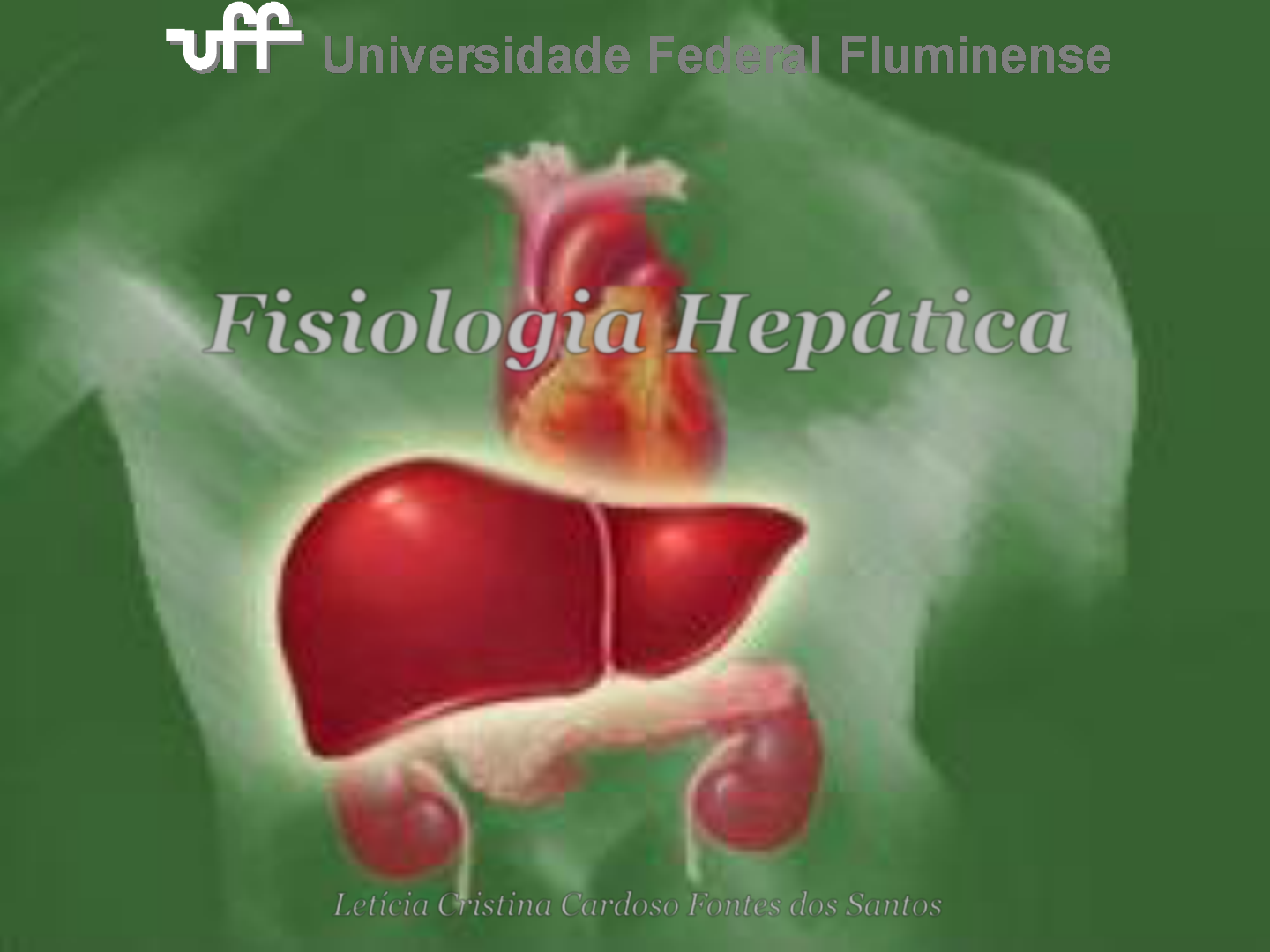 * * * Fisiologia Hepática Letícia Cristina Cardoso Fontes dos Santos * * * O Fígado Anatomia macroscópica do fígado Anatomia microscópica do fígado O vesícula biliar e a bile A ação dos sais biliares O metabolismo dos carboidratos O metabolismo dos lipídios O metabolismo das proteínas Outras funções do fígado As hepatopatias A ação do álcool no organismo A ressaca * * * Localização Hepática * * * Vista Anterior do Fígado * * * Superfície Inferior do Fígado * * * Vesícula Biliar e Glândulas Associadas * * * Relações Anatômicas * * * O Fígado Anatomia macroscópica do fígado Anatomia microscópica do fígado O vesícula biliar e a bile A ação dos sais biliares O metabolismo dos carboidratos O metabolismo dos lipídios O metabolismo das proteínas Outras funções do fígado As hepatopatias A ação do álcool no organismo A ressaca * * * Anatomia Microscópica do Fígado * * * Os Lóbulos Hepáticos * * * Os Lóbulos Hepáticos * * * Canalículos Biliares e Ductos * * * O Fígado Anatomia macroscópica do fígado Anatomia microscópica do fígado O vesícula biliar e a bile A ação dos sais biliares O metabolismo dos carboidratos O metabolismo dos lipídios O metabolismo das proteínas Outras funções do fígado As hepatopatias A ação do álcool no organismo A ressaca * * * Trajeto da Bile * * * Regulação da Secreção de Bile * * * Entrada da Bile no Intestino Delgado * * * O Fígado Anatomia macroscópica do fígado Anatomia microscópica do fígado O vesícula biliar e a bile A ação dos sais biliares O metabolismo dos carboidratos O metabolismo dos lipídios O metabolismo das proteínas Outras funções do fígado As hepatopatias A ação do álcool no organismo A ressaca * * * Estrutura dos Sais Biliares * * * Emulsificação da Gordura * * * Produtos da Digestão de Gorduras/Lipase * * * Circulação Enterohepática/Sais Biliares * * * O Fígado Anatomia macroscópica do fígado Anatomia microscópica do fígado O vesícula biliar e a bile A ação dos sais biliares O metabolismo dos carboidratos O metabolismo dos lipídios O metabolismo das proteínas Outras funções do fígado As hepatopatias A ação do álcool no organismo A ressaca * * * O metabolismo dos carboidratos Armazenamento de glicogênio; Gliconeogênese / glicogenólise; Papel importante na manutenção da glicemia normal. * * * O Fígado Anatomia macroscópica do fígado Anatomia microscópica do fígado O vesícula biliar e a bile A ação dos sais biliares O metabolismo dos carboidratos O metabolismo dos lipídios O metabolismo das proteínas O metabolismo das vitaminas As hepatopatias A ação do álcool no organismo A ressaca * * * Digestão Química: Gorduras Oxidação de ácidos graxos para obtenção de energia; Síntese de colesterol, fosfolipídios e lipoproteínas; Síntese de gordura a partir das proteínas e carboidratos. * * * O Fígado Anatomia macroscópica do fígado Anatomia microscópica do fígado O vesícula biliar e a bile A ação dos sais biliares O metabolismo dos carboidratos O metabolismo dos lipídios O metabolismo das proteínas O metabolismo das vitaminas As hepatopatias A ação do álcool no organismo A ressaca * * * O Metabolismo das Proteínas Desaminação de aminoácidos Amônia (NH3) (obtenção de energia) Formação de uréia para remoção de amônia dos líquidos corporais ciclo da uréia; Síntese de proteínas plasmáticas: albumina, globulinas, fatores de coagulação, dentre outros. * * * O Fígado Anatomia macroscópica do fígado Anatomia microscópica do fígado O vesícula biliar e a bile A ação dos sais biliares O metabolismo dos carboidratos O metabolismo dos lipídios O metabolismo das proteínas Funções do fígado As hepatopatias A ação do álcool no organismo A ressaca * * * Funções do Fígado Formação e secreção de bile; Armazenamento de glicogênio; Síntese de proteínas do plasma; Excreção de bilirrubina; Imunidade; Síntese de fatores de coagulação; Armazenamento de ferro; Armazenamento de vitaminas; Inativação de várias substâncias exógenas e endógenas; Degradação de hormônios. * * * O Fígado Anatomia macroscópica do fígado Anatomia microscópica do fígado O vesícula biliar e a bile A ação dos sais biliares O metabolismo dos carboidratos O metabolismo dos lipídios O metabolismo das proteínas Outras funções do fígado As hepatopatias A ação do álcool no organismo A ressaca * * * A Hepatite É a inflamação do fígado por qualquer causa. Comumente, é decorrente da ação de um vírus, sobretudo de um dos cinco vírus da hepatite (A, B, C, D ou E). As principais causas não virais da hepatite são o álcool e as drogas. Pode ser aguda (duração inferior a 6 meses) ou crônica. * * * A Icterícia É a coloração amarelada da pele e das escleras (branco dos olhos) causada por concentrações anormalmente elevadas da bilirrubina (pigmento biliar) no sangue. Remoção de eritrócitos velhos ou lesados bilirrubina Aumento de concentração de bilirrubina no sangue icterícia Causas: Inflamação ou outras alterações dos hepatócitos; Obstrução dos ductos biliares extra-hepáticos; Destruição de grandes quantidades de eritrócitos. Sintomas: Acolia fecal (fezes claras – “massa de vidraceiro”) Colúria (urina escura – “cor de Coca-cola”) * * * Hipertensão Porta Pressão sangüínea anormalmente elevada na veia porta; Dois fatores podem aumentar a pressão sangüínea nos vasos sangüíneos do sistema porta: O volume de sangue que circula através dos vasos; O aumento da resistência ao fluxo sangüíneo através do fígado. A causa mais comum de hipertensão porta é o aumento da resistência ao fluxo sangüíneo causado pela cirrose. Desenvolvimento de veias colaterais que conectam o sistema porta à circulação geral veias varicosas: Esôfago; Reto; Em torno da cicatriz umbilical (“cabeça de medusa”). * * * A Circulação Hepática * * * Colestase É a reduç