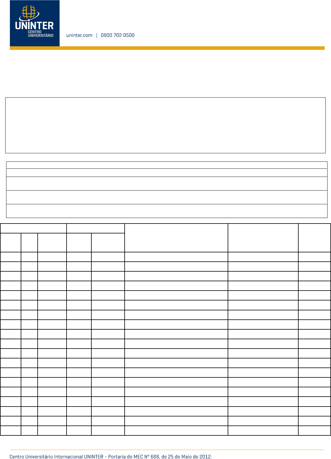 Licenciatura em Pedagogia FICHA DE FREQUÊNCIA ESTÁGIO SUPERVISIONADO MAGISTÉRIO ENSINO MÉDIO - 80 HORAS- Nome do aluno: ______________________________________________________________________RU: ______________ Apoio Presencial: ______________________________________________________________________________________ Curso: _______________________________________________________________________________________________ Tutor Presencial: ______________________________________________________________________________________ Instituição estagiada: ___________________________________________________________________________________ Diretor/Pedagogo:______________________________________________________________________________________ Esta Ficha de Frequência deve ser manuscrita, obedecendo à ordem cronológica e sem rasuras. Em cada registro deverá conter a assinatura do aluno e do responsável pela atividade. O Tutor é responsável pela assinatura das atividades fora do campo do estágio e cabe ao tutor também assinar e no verso, ao final desta ficha.¹ Ao Professor, Pedagogo ou Diretor da escola cabe assinar as atividades realizadas no campo de estágio e no verso, ao final desta ficha.² É necessário o carimbo da escola com o código de cadastro no INEP ou CNPJ ou, ainda, Portaria de Designação do Diretor da escola onde foi realizado o estágio. DATA / HORÁRIO ANO ________ ATIVIDADE REALIZADA ASSINATURA DO TUTOR PRESENCIAL¹ OU PEDAGOGO DA INSTITUIÇÃO PESQUISADA² ASSINATURA DO ALUNO DIA MÊS ENTRADA SAÍDA TOTAL HORAS DIA 2 ___________________________ _______________________________________ ASSINATURA DO TUTOR ASSINATURA DO PEDAGOGO/DIRETOR CARIMBO DA INSTITUIÇÃO ESCOLAR CNPJ, OU CÓDIGO DO INEP, OU PORTARIA DE DESIGNAÇÃO DO DIRETOR FICHA DE AVALIAÇÃO DE DESEMPENHO DE ESTÁGIO SUPERVISIONADO – PROFESSOR-SUPERVISOR1 Parte Concedente de Estágio:_____________________________________________________________________________________________ Professor supervisor:____________________________________________________________________________________________________ Estagiário: ___________________________________________________________________________________RU:______________________ Curso: _______________________________________________________________________________________________________________ Período de estágio referente ao acompanhamento: _____/____/____ a ____/____/____ Caro (a) colega, sua avaliação constitui-se um instrumento muito importante para a formação profissional de nosso (a) aluno (a). Por gentileza, avalie os itens abaixo considerando o desempenho do estagiário a partir dos conceitos EXCELENTE, BOM, REGULAR e INSUFICIENTE2. PARECER DO SUPERVISOR DA PARTE CONCEDENTE ASPECTOS ATITUDINAIS EXCELENTE BOM REGULAR INSUFICIENTE Assiduidade e cumprimento do horário Disciplina e responsabilidade: observância das normas internas e zelo pelo patrimônio. Cooperação: disposição para cooperar com os colegas e alunos Interesse: comprometimento demonstrado para as tarefas a serem realizadas Cumpriu o planejamento de estágio? Apresentação pessoal: o aluno apresenta-se de forma adequada (indumentária) ao ambiente escolar ASPECTOS RELATIVOS À OBSERVAÇÃO E PRÁTICA PEDAGÓGICA1 Observação pedagógica: os questionamentos do aluno acerca do PPP e da realidade da escola foram pertinentes para a sua formação docente? A observação participativa nas aulas foi 1 Esta ficha avaliativa não significa aprovação no Estágio, é necessário que se cumpra os demais requisitos para aprovação. 2 EXCELENTE: 9 a 10. BOM: 7 a 8,9. REGULAR: 5 a 6,9. INSUFICIENTE: 0 A 4,9. 4 adequada? Metodologia de ensino: a metodologia e estratégias utilizadas pelo estagiário eram adequadas aos conteúdos desenvolvidos e à realidade dos alunos? Relacionamento com os alunos: Mostra-se mediador do processo de ensino e aprendizagem? De que forma se dão as solicitações de participação do grupo no desenvolvimento do trabalho? Considera o conhecimento a bagagem cultural acerca do conteúdo) já construído pelos alunos? Propõe-se a reelaborar com os alunos o novo conhecimento que será construído através de suas aulas? Dinamismo: (nos procedimentos, há a presença de metodologias variadas? Há organização do trabalho durante as dinâmicas propostas?) Domínio de Conteúdo: (o estagiário demonstra conhecimento sobre os conteúdos que está trabalhando?) Planejamento da docência: o aluno adequou a sua prática docente ao planejamento do professor regente? Elaborou e apresentou o plano de aula ao professor regente? Com relação ao desempenho do estagiário, o que você destacaria como ponto forte e como ponto frágil do seu fazer docente? Você afirmaria que o desempenho do(a) estagiário(a) alcançou ou superou as necessidades dos alunos e da escola? Observações e sugestões: Assinatura do professor supervisor _________________________ Assinatura do Tutor do Polo de Apoio Presencial _________________________ Local, data: __________________, ______/______/______ Local, data: __________________, ______/______/______