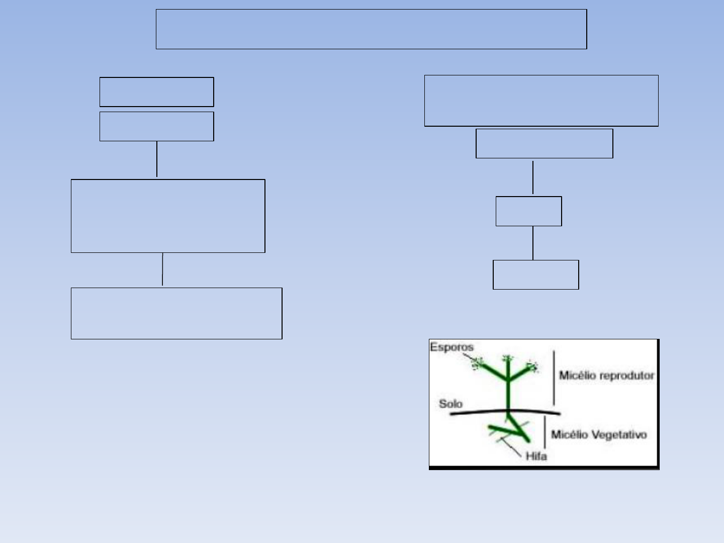 REPRODUÇÃO DOS FUNGOS LEVEDURAS FUNGOS FILAMENTOSOS (MOFOS/ BOLORES) unicelulares multicelulares REPRODUÇÃO ASSEXUADA (maioria) Brotamento/gemulação Fissão binária HIFAS hialinas/demáceas Septadas/cenocíticas MICÉLIO DIFERENTES TIPOS DE MICÉLIO E PROPÁGULOS DE ACORDO COM O MODO DE REPRODUÇÃO DOS FUNGOS VEGETATIVO MICÉLIO PROPÁGULOS ASSEXUADOS BLASTOCONÍDIO INTERNOS REPRODUTIVO PROPÁGULOS ASSEXUADOS PROPÁGULOS SEXUADOS ARTROCONÍDIO CLAMIDOCONÍDIO EXTERNOS INTERNOS EXTERNOS CONÍDIOS ESPORÂNGIOSPOROS BASIDIOSPOROS ASCOSPOROS MICÉLIO REPRODUTIVO FUNGOS FILAMENTOSOS São classificados e identificados pelo tipo de esporo ou conídio Mitose divisão celular (mais frequente) ASSEXUAIS ESPOROS SEXUAIS Ocorre fusão de 2 núcleos (menos frequente) REPRODUÇÃO ASSEXUADA 1. EXTERNA CONÍDIOS DISPERSÃO DO FUNGO Os conídios/esporos (poeira) são externos e produzidos sobre conidióforos Conídios de Penicillium agrupados em forma de pincel Conídios de Aspergillus agrupados em forma de cabeça ao redor de uma vesícula 2. EXTERNA Os esporos ficam armazenados DENTRO de estruturas que precisam ser rompidas para que ocorra a dispersão do fungo ESPORÂNGIOS ARMAZENA OS ESPORANGIÓSPOROS REPRODUÇÃO SEXUADA TEM QUE OCORRER A UNIÃO DE 2 GAMETAS OS ESPOROS RESULTAM DA FUSÃO DE NÚCLEOS DE TIPOS SEXUAIS OPOSTOS DE UMA MESMA ESPÉCIE DE FUNGO 1. INTERNA Os esporos são chamados de ASCOSPOROS e ficam dentro de estruturas chamadas de ASCOS (forma de bolsa). Os ascos ficam dentro dos ASCOCARPOS: CLEISTOTÉCIO, PERITÉCIO E APOTÉCIO 2. EXTERNA Os esporos são conhecidos como BASIDIÓSPOROS e se originam no ápice de um BASíDIO Tipo de reprodução realizada pelos COGUMELOS (basidiomicetos) CLASSIFICAÇÃO DOS FUNGOS Os fungos verdadeiros pertencem a divisão EUMYCOTA e possuem 5 subdivisões, mas apenas essas quatro abrigam os fungos de importância médica FUNGOS PERFEITOS: se reproduzem sexuada e assexuadamente FUNGOS IMPERFEITOS: apenas assexuadamente Os fungos dessa subdivisão possuem micélio não septado e a reprodução pode ser SEXUADA ou ASSEXUADA (esporangiósporos) ZIGOMICETOS Os fungos dessa subdivisão possuem micélio septado e quando a reprodução é SEXUADA produzem ASCOSPOROS. Também se reproduzem assexuadamente (conídios). ASCOMICETOS BASIDIOMICETOS Os fungos dessa subdivisão possuem micélio septado e quando a reprodução é SEXUADA produzem BASIDIOSPOROS. Também se reproduzem assexuadamente (conídios). DEUTEROMICETOS Os fungos dessa subdivisão possuem micélio septado e se reproduzem APENAS ASSEXUADAMENTE. São conhecidos como fungos imperfeitos e nessa subdivisão estão a maioria dos fungos de importância médica. PORTANTO, NO LABORATÓRIO A IDENTIFICAÇÃO DESSES FUNGOS DEVE SER FEITA PELAS CARACTERÍSTICAS DOS ESPOROS ASSEXUADOS (CONIDIOS)