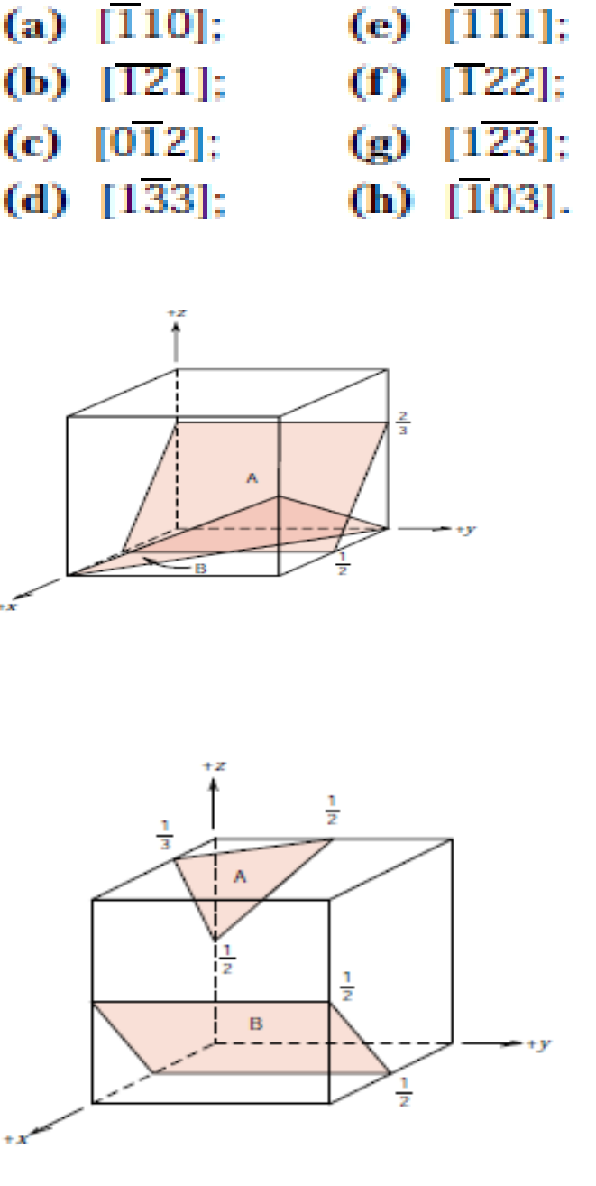 1 – Dentro de uma celula unitaria cubica, esboce as seguintes direções 2 – Determine os indices de Miller para os planos mostrados na celula 3 – Determine os indices de Miller para os plano mostrados nas seguintes células 4 =Determine os indices de Miller para os planos mostrados na seguinte célula unitária 1/2 5 - Determine os indices para a direções mostradas na célula cúbica