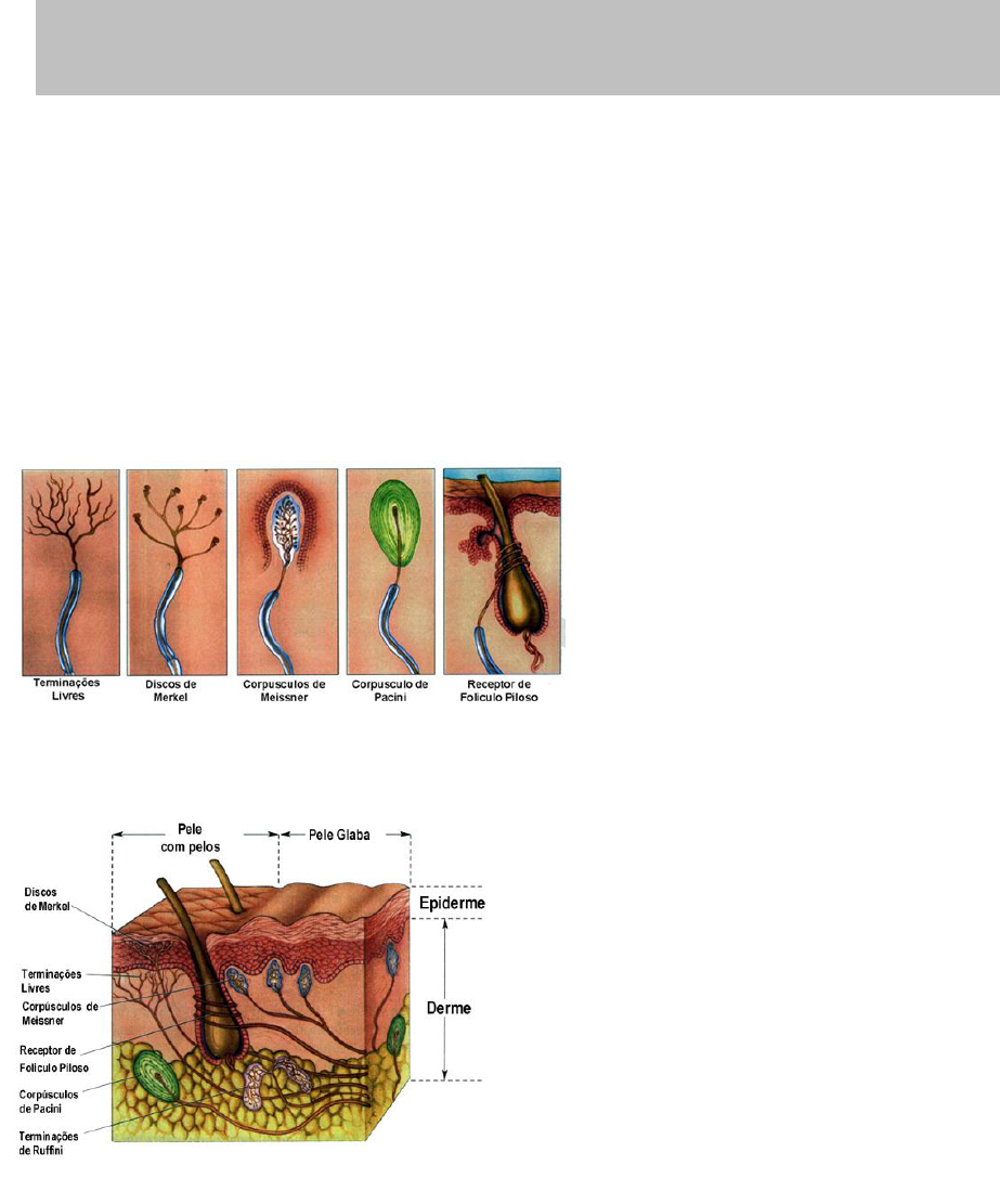 Apostila do Curso de Fisiologia 2007 Departamento de Fisiologia, IB Unesp-Botucatu Profa. Silvia M. Nishida 61 SENTIDO SOMESTÉSICO O sistema sensorial somático, ou sistema somatossensorial é responsável pelas experiências sensoriais evocadas em órgãos sensoriais que não pertencem aos sentido especial. Os receptores sensoriais somestésicos estão espalhados pelo corpo todo, ao contrário dos órgãos especiais, cujos receptores estão restritos na cabeça. O sentido somático geral do corpo (=somestesia) evoca as seguintes as modalidades perceptuais: Tato/Pressão e Vibração: eliciado por mecanorreceptores da superfície corporal (pele); Propriocepção: eliciado por deslocamentos mecânicos dos músculos e articulações (tecidos profundos); Dor: eliciado por vários receptores que respondem a estímulos intensos de outras modalidades (potencialmente lesivos) e devido à lesão tecidual. Sensação térmica: eliciado por receptores térmico para o calor e frio. Compare os diferentes tipos de receptores somestésicos. Repare como neste caso, não há células sensoriais secundárias associadas às fibras dos neurônios periféricos: os próprios terminais destes neurônios possuem estruturas modificadas (livres ou então associadas a cápsulas). MECARRECEPTORES DA PELE A pele nos protege do meio ambiente externo contra a continua perda de água e a invasão de microrganismos indesejáveis e também nos proporciona muitas informações sensoriais. A pele é um órgão sensorial com uma infinidade de terminações nervosas. Levando-se em consideração as regiões com pelos e sem (glaba, como nas mãos e nos pés), os mecanorreceptores estão ilustrados na figura ao lado. Estes nos possibilitam reconhecer sensações como tato, pressão, adejo e vibração. Cada um dos receptores mecânicos possui uma peculiaridade na maneira de responder aos estímulos adequados (freqüência de estimulação) e possui campos receptivos de tamanhos diferentes. Os estímulos mecânicos abrem canais iônicos mecano-dependentes, geram PR graduados e excitatórios de baixa voltagem na região do terminal sensitivo. Se a despolarização atingir o limiar na zona de gatilho dos PA (canais de Na e K voltagem dependentes) serão desencadeados os PA com freqüências características. Os impulsos nervosos são conduzidos ao longo das fibras aferentes dos neurônios aferentes de primeira ordem até o SNC, seja através dos nervos espinhais ou cranianos, conforme a origem no corpo. Apostila do Curso de Fisiologia 2007 Departamento de Fisiologia, IB Unesp-Botucatu Profa. Silvia M. Nishida 62 Experimentamos constantemente a necessidade de examinar ativamente os objetos com as mãos para verificar características como textura, forma e peso. A pele proporciona ainda sensações agradáveis que uma leve brisa nos provoca ou de um cafuné carinhoso. As sensações mecânicas oriundas da pele dependem de como os diferentes receptores estão espalhados pelo corpo e como respondem aos estímulos. Uma maneira muito simples permite a pesquisa sobre a sensibilidade dos mecanorreceptores da pele. Com um estimulador mecânico, são pesquisadas as freqüências dos PA desencadeados nas fibras aferentes correspondentes ao campo de inervação. Sobre a palma da mão observa-se que os campos receptivos dos corpúsculos de Pacini são amplos e os de Meissner, bem pequenos. A tabela abaixo mostra comparativamente as respostas para os demais receptores. Aplicando-se estímulos que aumentam progressivamente de intensidade, depois se torna constante e em seguida, removido rapidamente, observa-se que os receptores de Pacini e de Meissner respondem apenas quando o estimulo está sendo aplicado e removido e durante a sustentação do estimulo, param de responder. Isto significa que a principal propriedade destes receptores é o de detectar a presença/ausência de estímulos e ignorar aqueles que se tornam constantes (receptores de adaptação rápida). Tal propriedade os qualifica como excelentes detectores da freqüência com que um estimulo mecânico é aplicado na pele. Já os de Merkel respondem melhor a taxa de variação com que o estimulo está sendo aplicado. Quando a intensidade do estimulo para de variar, a freqüência dos PA diminui, ou seja, adaptam-se a estímulos constantes porem mais lentamente. Os de Ruffini, respondem tanto à aplicação como à manutenção do estimulo, quase sem nenhuma alteração na freqüência dos PA. Estes receptores de adaptação mais lenta têm como propriedades, detecção da duração e intensidade dos estímulos mecânicos sobre a pele. A faixa de freqüência que melhor estimula os corpúsculos de Pacini está entre 200 a 300Hz; os de Meissner, em trono de 50Hz. Quando a freqüência cai menos de 50 Hz, as terminações de Ruffini e Meissner evocam sensações de adejo. Tipos de receptores Natureza do estimulo Propriedade dos receptores Pressão Meissner e terminações dos folículos pilosos Vibração de baixa freqüência Adaptação rápida Adejo Corpúsculos de Pacini Vibração de alta freqüência Adaptação rápida Vibração Corpúsculos de Merkel e Rufini Pressão Adaptação lenta Tato-presão A pelagem de outros mamíferos forma uma camada de ar que serve como isolante térmico e lhes garante a identificação dos estímulos mecânicos que nela incide como a força e o sentido do vento. Nos seres humanos, os terminais nervosos dos folículos pilosos, apenas nos ajudam detectar delicados estímulos mecânicos que defletem a sua inclinação. Apostila do Curso de Fisiologia 2007 Departamento de Fisiologia, IB Unesp-Botucatu Profa. Silvia M. Nishida 63 Discriminação de dois pontos Com o uso de um compasso, é possível mapear a região da pele com maior e menor capacidade para discriminação entre dois pontos. O mapa ao lado indica que nas costas, a resolução espacial é bastante pequena (42mm) ao contrario do dedo indicador e polegar (2,5mm). Quanto maior a capacid