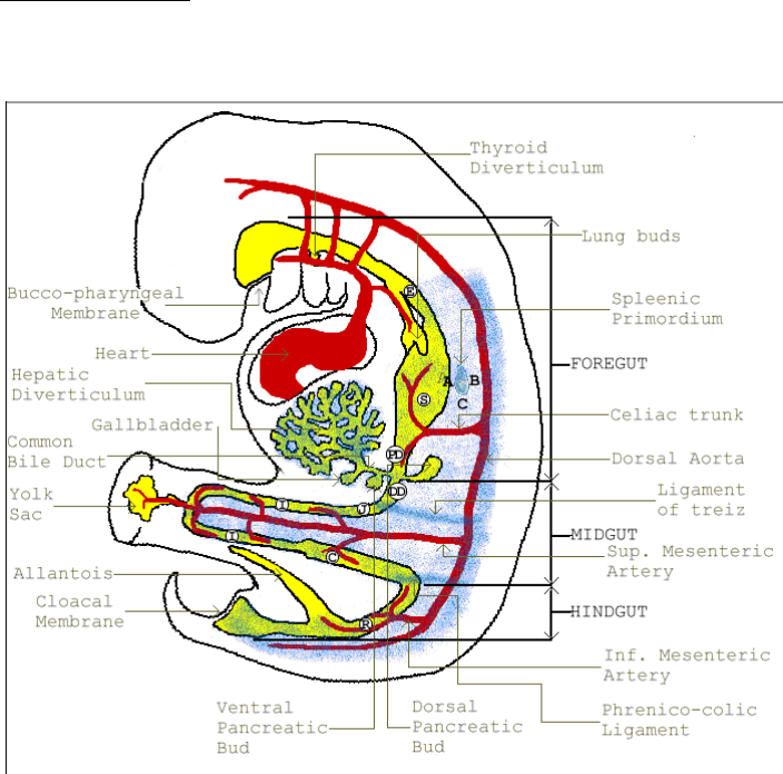 Diogo Araujo – Med 92 Sistema Digestório Com o dobramento do embrião, formam-se três partes do sistema digestivo primitivo. A partir de diferenciações regionais, desencadeadas por relações do endoderma com o mesênquima, formam se os órgãos do tubo. O intestino primitivo é formado pelo endoderma, que o reveste internamente. Após o dobramento do embrião e a formação “passiva” do intestino primitivo, o mesoderma passa a conduzir o desenvolvimento do sistema digestório, pela síntese de fatores que levam à diferenciação do endoderma para formar epitélios distintos. As células se diferenciam cito, funcional e histologicamente para exercer diferentes funções. O intestino primitivo anterior se divide em faringe primitiva (porção mais anterior) e porção posterior do intestino primitivo anterior. Nesse estágio do desenvolvimento, além do intestino primitivo, há a membrana bucofaríngea, o pedículo vitelino (que liga o intestino primitivo médio ao saco vitelino) e a cloaca (onde termina não só o intestino primitivo posterior, mas o sistema urogenital também). A membrana cloacal também está presente na região caudal do embrião, formando o limite posterior do proctodeu, que é uma depressão do ectoderma embrionário. No desenvolvimento do intestino primitivo, há três processos morfológicos iniciais: - Elongação das estruturas do intestino primitivo; - Rotação [ou seja, as estruturas se movem para adquirir posição adequada]; - Herniação de estruturas; Posteriormente, há os seguintes processos: - Histogênese, em que cada parte do tubo digestivo vai adquirir características que as distinguem; - Diferenciação funcional [maturação funcional], em que cada tecido do tubo terá uma função (secreção, contração, etc.). As três partes do intestino primitivo não se desenvolvem isoladamente. A aorta, próxima do intestino primitivo, fornece ramos que irrigam porções especificas do intestino e de seus derivados: - Intestino primitivo anterior: na sua porção caudal, é irrigado pelo tronco celíaco. - Intestino primitivo médio: é irrigado pela artéria mesentérica superior (resultado da fusão das artérias vitelínicas). - Intestino primitivo posterior: é irrigado pela artéria mesentérica inferior. A porção caudal do intestino primitivo anterior origina o esôfago, o estômago, parte do duodeno, fígado e pâncreas. São estruturas irrigadas pelo tronco celíaco. O intestino primitivo médio forma parte do duodeno, jejuno, íleo, colo ascendente, ceco com apêndice e parte do colo transverso. São irrigados pela mesentérica superior. O intestino primitivo posterior forma parte do colo transverso, colo descendente, colo sigmóide, reto e parte do canal anal. São irrigados pela mesentérica inferior. Esôfago O esôfago vai desde o orifício onde surge o sistema respiratório até uma porção dilatada do intestino primitivo anterior (onde surge o estômago). Em princípio, o esôfago é curto. Mas, com a formação do pescoço e a descida do coração, ele sofre um alongamento. Além disso, em princípio, ele tem uma luz tubular. Aos poucos, o seu endoderma se prolifera e a sua luz se oblitera temporariamente. Depois, ele se recanaliza e surge o epitélio e as glândulas características do esôfago. Quanto à sua parte muscular, o esôfago possui mais músculo estriado esquelético nas suas porções superiores e músculo liso nas inferiores. No seu terço superior, o mesênquima presente nos arcos faríngeos mais inferiores formam o tecido muscular esquelético do esôfago. Já nas porções mais inferiores, é o mesoderma esplâncnico circunjacente que dá origem ao músculo liso. Estômago Inicialmente, o estômago possui uma posição diferente da presente no adulto. Ele se mostra como uma bolsa fusiforme entre o esôfago e o duodeno, sem uma diferenciação característica. No entanto, posteriormente, o estômago sofre um processo de proliferação diferencial. Ou seja, a porção dorsal do estômago cresce muito em relação à região ventral. Assim, a região dorsal forma uma grande curvatura. Já a ventral, que cresce pouco, forma a pequena curvatura. Na cavidade peritoneal, os órgãos do tubo digestivo estão presos à parede posterior e à anterior por meio de mesos. Mesos são pregas peritoneais, que advêm da camada de mesoderma que recobre o celoma intra-embrionário. São pregas peritoneais duplas. O celoma intra-embrionário, quando fecha toda a comunicação com o extra-embrionário durante o dobramento, forma a cavidade peritoneal. Com relação ao estômago, há um meso dorsal e um ventral. São chamados de mesogástrio dorsal e mesogástrio ventral. A grande curvatura fica presa pelo mesogástrio dorsal e a pequena, pelo ventral. OBS: Todos os órgãos possuem meso dorsal. Em alguns órgãos, o meso ventral desaparece. O estômago está preso pelos mesogástrios ventral e dorsal. Com o processo de proliferação diferencial do estômago e a formação das curvaturas, o estômago passa a sofrer um processo de rotação no sentido horário, girando 90º ao redor de seu eixo. Então, a face esquerda do estômago fica como face anterior do estômago e a direita, posterior. Em seguida, há uma movimentação do extremo pilórico, que toma uma posição para a direita e para cima. Assim, o estômago adquire a sua posição característica do adulto. Quando o estômago gira e traciona o mesogástrio posterior, há formação do omento maior. Além disso, entre as partes do omento maior, forma-se a cavidade omental pequena (bolsa omental menor). No mesogástrio ventral, cresce o fígado. No dorsal, crescem o baço e uma parte do pâncreas. A cauda do pâncreas que surge no mesogástrio posterior é empurrada contra a parede dorsal do abdome, de maneira que ela se fusiona com a região posterior. Assim, somente a sua região anterior fica revestida pelo peritônio. Então, a cauda do pâncreas é dita retroperitoneal