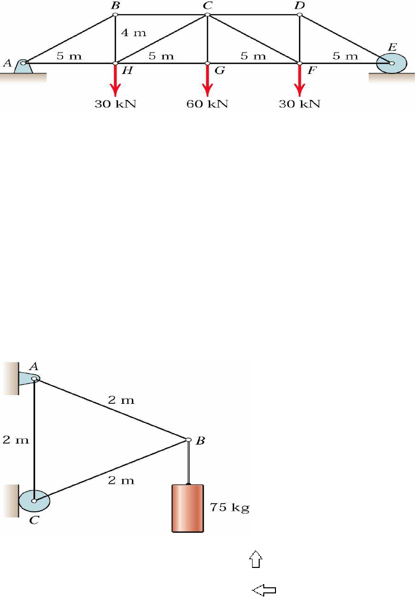 3ª Lista de exercícios de Mecânica Geral I Análise de estruturas – Treliças • Determine as reações nos apoios, e os esforços nas barras da treliça ilustrada. AB = -96,047 kN compressão CD = -75 kN compressão AH = 75 kN tração GF = 112,5 kN tração BH = 60 kN tração FD = 60 kN tração BC = -75 kN compressão DE = -96,047 kN compressão HC = -48,023 kN compressão FE = 75 kN tração HG = 112,5 kN tração RAx = 0 kN CG = 60 kN tração RAy = 60 kN CF = -48,023 kN compressão RBy = 60 kN • Determine os esforços nas barras da treliça ilustrada. AB = 75 kg tração RAy = 75 kg AC = 37,5 kg tração RAx = 65 kg BC = -75 kg compressão RCx = 65 kg • Determine os esforços nas barras da treliça ilustrada. AB = 12,006 kN tração BC = 5,2 kN tração AE = -3 kN compressão DC = -6,003 kN compressão EB = -5,2 kN compressão RAx = 10,4 kN ED = -6,003 kN compressão Ray = 3 kN BD = 6 kN tração REx = 10,4 kN • Utilizando o método das seções determine os esforços nas barras BE, BC e AE. BE = -13,763 kN compressão BC = 2,225 kN tração AE = 20,663 kN tração • Utilizando o método das seções determine os esforços nas barras IH, BC e BH. IH = 40 kN tração BH = -47,14 kN compressão BC = -6,67 kN compressão • Utilizando o método das seções determine os esforços nas barras BC,BG e AG. BC = -981,3 N compressão BG = -399,3 N compressão AG = 836,5 N tração • Determine os esforços das barras HG, HI, AB e AE. HG = -3,89 kN compressão HI = 3,01 kN tração AB = -3,89 kN compressão AE = 3,95 kN tração