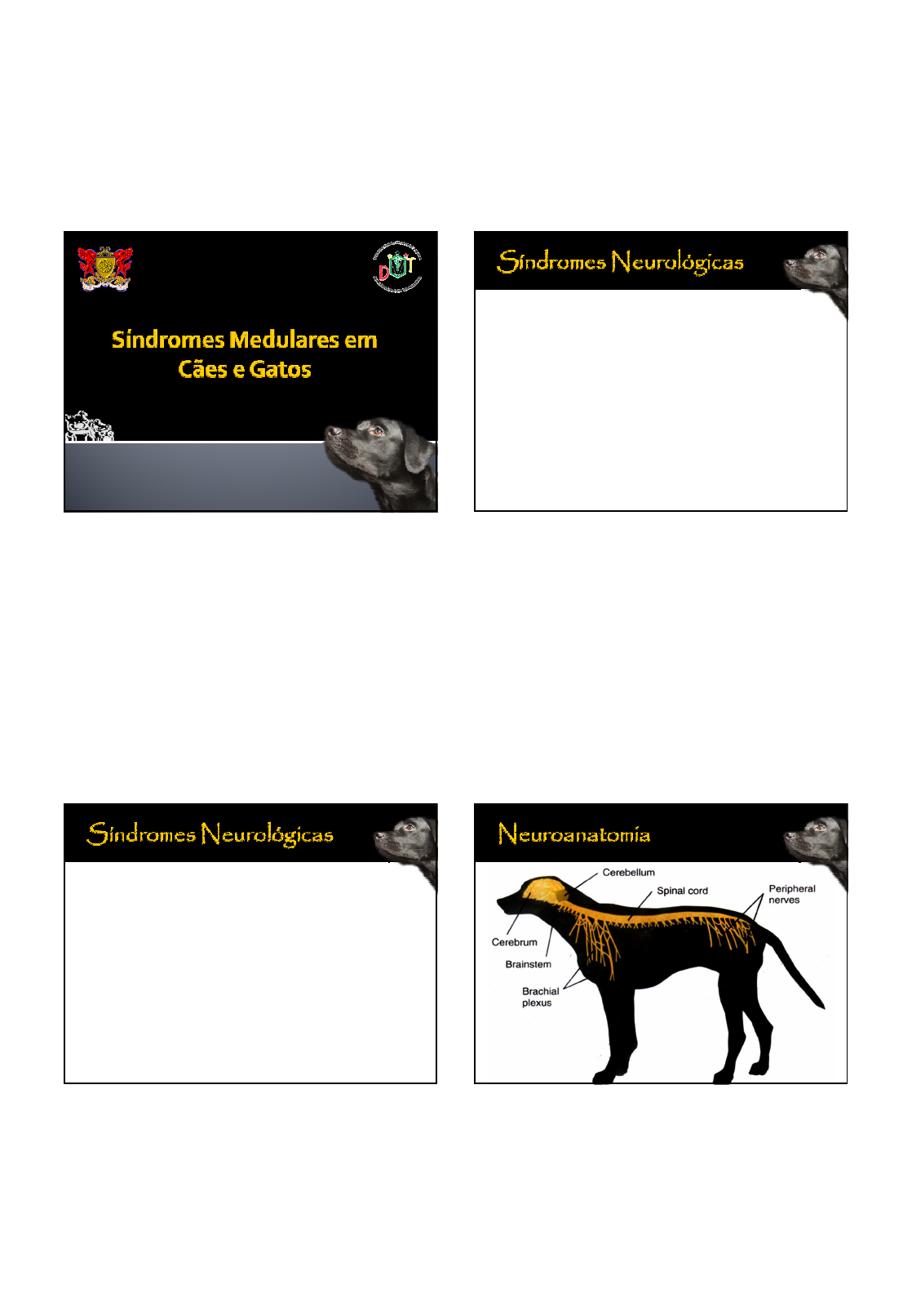 5/13/2010 1 Pablo Herthel Mestrando em Cirurgia de Pequenos Animais – UFV Grupo de Pesquisa Células-tronco Mesenquimais e Terapia Reparativa - CNPq Especialista em Clínica e Cirurgia de Pequenos Animais - UFV UNIVERSIDADE FEDERAL DE VIÇOSA CENTRO DE CIÊNCIAS BIOLÓGICAS E DA SAÚDE DEPARTAMENTO DE VETERINÁRIA GEAC - UFV Grupo de Estudos de Animais de Companhia � Conjunto de sinais e sintomas específicos previsíveis, que resulta de uma determinada lesão do SNC, SNP ou músculos esqueléticos; � Nem todos os sintomas clínicos estão sempre presentes. � Grupo uniforme de sinais clínicos, produzidos pelo mesmo mecanismo e que se repetem em várias afecções. � 4 síndromes medulares; � 6 síndromes encefálicas; � Síndromes neuropáticas; � Síndromes miopáticas; � Síndromes episódicas; � Síndrome multifocal. 5/13/2010 2 5/13/2010 3 � Neurônio motor superior � Ação inibitória da atividade motora intrínseca de cada segmento medular. LESÃO DO NEURÔNIO MOTOR SUPERIOR Funçãomotora Paresia ou plegia (paralisia espástica) Reflexos Normais ou aumentados (hiperreflexia) Tônus muscular Normal ou aumentados (hipertonia) Atrofia muscular Lenta, por desuso � Neurônio motor inferior � Inervação motora dos músculos através dos nervos periféricos. LESÃO DO NEURÔNIO MOTOR INFERIOR Funçãomotora Paresia ou plegia (paralisia flácida) Reflexos Ausentes (arreflexia) ou diminuídos (hiporreflexia) Tônus muscular Diminuído (hipotonia) ou perda (atonia) Atrofia muscular Rápida, por denervação Tamanho e localização das fibras Função Sinais observados Prognóstico Propriocepção Déficits proprioceptivos Favorável Motricidade voluntária Paresia/Plegia Reservado Sensibilidade superficial Perda da dor superficial Reservado Sensibilidade profunda Perda da dor profunda DesfavorávelP E R D A R E T O R N O PROPRIOCEPÇÃO MOVIMENTOS VOLUNTÁRIOS SENSIBILIDADE SUPERFICIAL CONTROLE DA BEXIGA SENSIBILIDADE PROFUNDA 5/13/2010 4 T3-L3 � Cervical; � C1 - C5 � Cervicotorácica; � C6 - T2 � Toracolombar; � T3 - L3 � Lombossacra. � L4 - S3 � Cervical; � C1 - C5 � Cervicotorácica; � C6 - T2 � Toracolombar; � T3 - L3 � Lombossacra. � L4 - S3 LOCALIZAÇÃO SINAIS MEMBRO TORÁCICO SINAIS MEMBRO PÉLVICO NMS NMS NMI NMS Normal NMS Normal NMI C1-C5 C6-T2 T3-L3 L4-S3 5/13/2010 5 SÍNDROME CERVICAL � APRESENTAÇÃO CLÍNICA � Hemiparesia, tetraparesia a plegia; � Dor cervical, rigidez cervical; � Retenção urinária espástica; � Síndrome de Horner. � APRESENTAÇÃO CLÍNICA � Hemiparesia, tetraparesia a plegia; � APRESENTAÇÃO CLÍNICA � Dor cervical, rigidez cervical; 5/13/2010 6 � APRESENTAÇÃO CLÍNICA � Dor cervical, rigidez cervical; � APRESENTAÇÃO CLÍNICA � Dor cervical, rigidez cervical; � APRESENTAÇÃO CLÍNICA � Retenção urinária espástica; � APRESENTAÇÃO CLÍNICA � Retenção urinária espástica; 5/13/2010 7 � APRESENTAÇÃO CLÍNICA � Retenção urinária espástica; � APRESENTAÇÃO CLÍNICA � Retenção urinária espástica; N. pudendo (+) esfíncter externo N. pélvico (+) detrusor N. hipogástrico (-) detrusor 5/13/2010 8 Fonte: Kelly Pontes, 2009 � APRESENTAÇÃO CLÍNICA � Síndrome de Horner. � APRESENTAÇÃO CLÍNICA � Síndrome de Horner. � APRESENTAÇÃO CLÍNICA � Síndrome de Horner. 5/13/2010 9 � APRESENTAÇÃO CLÍNICA � Síndrome de Horner. � CAUSAS � AGUDO ▪ Discopatias; ▪ Trauma; ▪ Toxoplasmose/Neosporose; ▪ Subluxação atlanto axial; ▪ Luxação atlanto occipital; ▪ Má formação occipito atlantoaxial; ▪ MEG; ▪ Cinomose; ▪ Erlichia; ▪ Fungo. � CAUSAS � CRÔNICO ▪ Discopatia; ▪ Subluxação atlanto axial; ▪ Neoplasias. SÍNDROME CERVICOTORÁCICA 5/13/2010 10 � APRESENTAÇÃO CLÍNICA � Tetraparesia, hemiparesia ou tetraplegia; � Retenção urinária espástica; � Síndrome de Horner; � Panículo diminuído. � APRESENTAÇÃO CLÍNICA � Retenção urinária espástica; � APRESENTAÇÃO CLÍNICA � Síndrome de Horner. � APRESENTAÇÃO CLÍNICA � Panículo diminuído. 5/13/2010 11 � CAUSAS: � AGUDO ▪ Discopatia; ▪ Trauma medular; ▪ Infarto fibrocartilaginoso; ▪ Hemorragia; ▪ Neoplasias; ▪ Cinomose; ▪ Discoespondilite; ▪ Erlichiose; ▪ Toxoplasmose/neosporose; ▪ Fungo. � CAUSAS: � CRÔNICO ▪ Síndrome de Wobbler; ▪ Discopatia; ▪ Neoplasias; ▪ Abscessos; ▪ Discoespondilite. SÍNDROME TORACOLOMBAR 5/13/2010 12 � APRESENTAÇÃO CLÍNICA � Ataxia de membros posteriores; � Paraparesia, paraplegia; � reflexo do panículo; � Retenção urinária espástica; � Schiff Sherrington . � APRESENTAÇÃO CLÍNICA � Paraparesia, paraplegia; � APRESENTAÇÃO CLÍNICA � Paraparesia, paraplegia; � APRESENTAÇÃO CLÍNICA � reflexo do panículo; 5/13/2010 13 � APRESENTAÇÃO CLÍNICA � Retenção urinária espástica; � APRESENTAÇÃO CLÍNICA � Schiff Sherrington . � APRESENTAÇÃO CLÍNICA � Schiff Sherrington . � CAUSAS: � AGUDO com dor, progressivo ▪ Meningomielite infecciosa; ▪ Meningite responsiva a corticóides; ▪ Neoplasia; ▪ Discoespondilite; ▪ Discopatia; ▪ Hemorragia. 5/13/2010 14 � CAUSAS: � AGUDO, com dor, não progressivo ▪ Trauma; ▪ Fratura; ▪ Luxação. � CAUSAS: � AGUDO, sem dor, não progressivo ▪ Infarto fibrocartilaginoso � CAUSAS: � CRÔNICO, progressivo, sem dor ▪ Mielopatia degenerativa; ▪ Discopatia; ▪ Neoplasias . SÍNDROME LOMBOSSACRA 5/13/2010 15 � APRESENTAÇÃO CLÍNICA � Paresia, ataxia, cifose; � Hiporreflexia ou pseudo-hiperrelexia do patelar; � Retenção ou incontinência urinária; � APRESENTAÇÃO CLÍNICA � Paresia, ataxia, cifose; � APRESENTAÇÃO CLÍNICA � Paresia, ataxia, cifose; � APRESENTAÇÃO CLÍNICA � Retenção ou incontinência urinária; 5/13/2010 16 � APRESENTAÇÃO CLÍNICA � Esfíncter anal dilatado, reflexo 