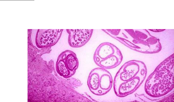 Diogo Araujo – Med 92 Filariose Linfática Parasito Reino: Animalia Filo: Nemathelminthes Classe: Nematoda Família: Onchocercidae Gênero: Wuchereria Espécies: Wuchereria bancrofti - Esses vermes, chamados de filarídeos, não são geo-helmintos. Eles precisam de um vetor (mosquito) para completar seu ciclo. - W. bancrofti e mais duas espécies são causadoras da filariose linfática, também chamada de filaríase ou elefantíase (fase crônica). No Brasil, a W. bancrofti tem maior importância. - As infecções ocorrem mais no nordeste e no norte (PA, AL, PE). - Estima-se que, no mundo, existam 120 milhões de pessoas infectadas. - Hospedeiro definitivo: homem. - Hospedeiro intermediário: mosquito vetor. - Vermes adultos: possuem de 3,5 a 10 cm. São vermes esbranquiçados, delgados, cilíndricos, com dimorfismo sexual (machos menores que fêmeas). Os machos possuem extremidade posterior recurvada ventralmente com espículo. Estão presentes nos linfonodos e alimentam- se de linfa. Após a cópula, a fêmea coloca larvas (microfilárias). Diogo Araujo – Med 92 Em cortes dos linfonodos e vasos linfáticos, podem aparecer vermes adultos cortados transversalmente. - Microfilárias: possuem uma membrana externa flexível chamada de bainha. Medem menos de 1 cm e estão na corrente sanguínea. Ao microscópio, podem ser vistas várias células em seu interior (que irão formar órgãos no verme adulto). Na cauda, há núcleos que vão até a sua ponta (há um padrão de dois núcleos em série na ponta) Diogo Araujo – Med 92 - Larvas: estão presentes no vetor. Existem as larvas L1, L2 e L3 (infectante). OBS: A Mansonella ozzardi também está presente em algumas áreas do Brasil. Ela não é patogênica, mas ao encontrar uma microfilária num exame de sangue, é necessário fazer diagnóstico diferencial. Características: - as microfilárias não têm bainha; - os vermes adultos se encontram no mesentério e em outras membranas da cavidade abdominal; - ela, geralmente, não causa sintomas. Vetor - O principal inseto transmissor é a fêmea da espécie Culex quinquefasciatus. - Ela realiza hematofagia noturna, preferencialmente. - Há outros vetores preferenciais em outros continentes. Diogo Araujo – Med 92 Ciclo de vida - É heteroxênico. - As fêmeas colocam larvas. São ditas larvivíparas. Diogo Araujo – Med 92 - As microfilárias circulam no sangue, mas não perdem a bainha. - No homem há vermes adultos e microfilárias. - No vetor há larvas. Transmissão - Unicamente por picada do mosquito vetor contendo as larvas infectantes. - Um paciente que é transfundido com um sangue contendo microfilárias não desenvolve a filariose. Isso porque essas microfilárias não conseguem formar vermes adultos nos linfonodos. As microfilárias ficam apenas circulantes. O indivíduo, então, serve como um reservatório. Evolução - Indivíduos podem ser assintomáticos e sintomáticos. - Geralmente, os pacientes assintomáticos são aqueles que não desenvolvem resposta imune ao hospedeiro. - O número de larvas, a idade do paciente, a intensidade das reações inflamatórias, a resistência do parasito, a freqüência de reinfecções, tudo influencia no desenvolvimento do quadro de filariose e na progressão dos sintomas. - A evolução da filariose linfática é lenta. - Os vermes adultos formam novelos no interior de linfonodos. Assim, provocam reação inflamatória do local e diminuição da circulação de linfa. - Além disso, eles possuem mecanismos para driblar o sistema imune. Assim, conseguem produzir infecções crônicas. - Esse parasito faz simbiose com uma bactéria do gênero Wolbachia. Assim, pode haver infecção secundária do órgão comprometido. - Os parasitos costumam causar doenças por dois mecanismos: - Ação mecânica, promovendo a estase linfática e o derramamento de linfa. - Ação imune, com reações alérgicas ao parasito (eosinofilia pulmonar, formação de granulomas nos pulmões, aumento de IgE). - Fase aguda: há a febre filarial, com dor, inflamação dos linfonodos, náuseas e vômitos. Após esse período, cerca de 10 a 15% dos pacientes evoluem para a forma crônica. Diogo Araujo – Med 92 - Fase crônica: linfedema, com represamento dessa linfa e aumento progressivo do órgão afetado. - Aumento do volume do órgão por derramamento de linfa, associado a infecções secundárias, leva ao quadro de elefantíase (um quadro crônico, irreversível). - Geralmente, há acometimento de membros superiores, inferiores, órgãos genitais, mamas. Diagnóstico - Diagnóstico laboratorial com coleta de sangue para identificação de microfilárias. - As microfilárias exibem uma periodicidade quanto ao local em que estão. No período diurno, costumam ficar em vasos profundos, como nos capilares pulmonares. No período noturno, elas vão para a circulação periférica. Assim, o exame de sangue deve ser feito no período entre 23h e 1h, em que ocorre o pico de concentração de microfilárias na circulação periférica. - Testes imunológicos podem ser feitos, mas não são comumente utilizados. Tratamento - Medicamentoso para eliminação de vermes adultos e microfilárias, com dietilcarbamazina e ivermectina. - Deve haver higienização do local afetado, massagem para drenar linfa, uso de meias elásticas. - Pode ser feito tratamento cirúrgico e plástica reparativa. Profilaxia - Tratamento de pessoas infectadas. - Eliminação do vetor. - Educação em saúde. - Uso de telas e mosqueteiros à noite.