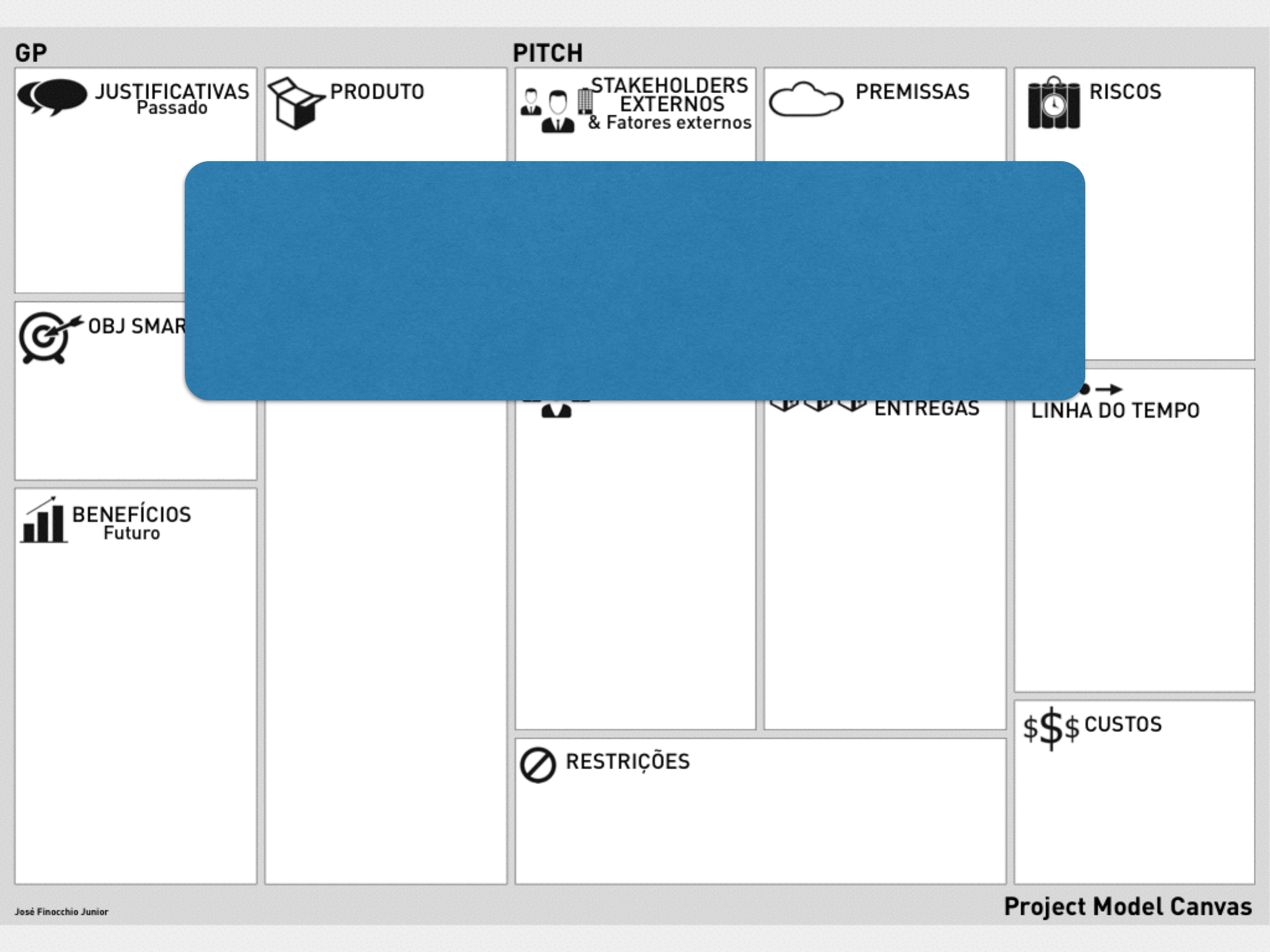 Project Model Canvas Project Model Canvas Gerenciamento de projetos Project Model Canvas Visão integrada de tudo o que interessa ao projeto, voltado a quem interessa Gerente do projeto Frase que capta a essência do projeto! ! Elevator pitch Por quê? O quê? Quem? Como? Quando e quanto? Explicar:! ! - quais problemas você quer resolver,! - quais demandas você quer atender,! e/ou! - quais oportunidades você quer explorar. Por exemplo, para uma pessoa querendo emagrecer:! ! - Colesterol aumentando! - Mobilidade reduzida! - Imagem mal-cuidada! - Roupas não cabem Apresentar seus objetivos SMART:! ! eSpecíficos! Mensuráveis! Alcançáveis! Realistas! delimitados no Tempo Por exemplo, para uma pessoa querendo emagrecer:! ! - Emagrecer 10 kg com saúde até 28.fev, tendo apoio multidisciplinar e incorporando hábitos saudáveis e gastando até R$ 6.500,00 Apresente os benefícios esperados desse projeto! ! O que será ganho quando o projeto terminar? Por exemplo, para uma pessoa querendo emagrecer:! ! - Colesterol normal! - Redução de probabilidade de doenças! - Redução de gastos com saúde em R$ 80 mil nos próximos 5 anos! - Inspiração para família e amigos! - Aumento da receita nos negócios através da melhoria da imagem Apresente o produto Por exemplo, para uma pessoa querendo emagrecer:! ! - Eu reeducado e 10 kg mais magro Apresente requisitos com as seguintes características:! ! - Unitário (se refere a só uma coisa)! - Completo e abrangente! - Consistente (não- contraditório com outros requisitos)! - Atômico (sem conjunções - se, e, ou, portanto, mas, quando, conforme, à medida que) Apresente requisitos com as seguintes características:! ! - Rastreável (ligado às necessidades dos interessados no produto)! - Atual (continua válido quando o projeto termina)! - Factível! - Objetivo (apresenta fatos, e não opiniões)! - Verificável Por exemplo, para uma pessoa querendo emagrecer:! ! - IMC < 25! - Percentual de gordura < 24%! - Dieta adquirida de 2000 kcal/ dia! - Nova rotina de esportes: 30 min. 5 dias por semana! - Novo hábito alimentar rico em fibras, pobre em gordura e açúcar Stakeholders externos: pessoas ou organizações envolvidos ou afetados pelo projeto (cliente, patrocinador, fornecedores, governo etc.) Fatores externos: ambiente em que o projeto se insere (economia, clima, tecnologia, leis etc.) Por exemplo, para uma pessoa querendo emagrecer:! ! - Stakeholders: esposa, mãe, colegas de happy-hour e amigos esportistas! - Fatores: clima e ritmo de trabalho Apresente a equipe, não só em termos de pessoas mas de seus papéis Por exemplo, para uma pessoa querendo emagrecer:! ! - Eu (gerente), médico, nutricionista e treinador físico Apresente as premissas:! ! - Suposições positivas sobre o que está fora do alcance do gerente do projeto! - Aquilo que se espera dos stakeholders e fatores externos! ! Se mudam as premissas, muda o projeto. Por exemplo, para uma pessoa querendo emagrecer:! ! - Minha mãe não vai forçar a barra com suas sobremesas! - Teremos mais de 90% dos dias de treinamento sem chuva pesada! - Colegas de trabalho vão apoiar a nova atitude abstêmia Apresente os grupos de entrega do projeto, que são etapas sequenciais simples para completar o projeto.! ! Na construção de uma casa, por exemplo, temos:! ! 1. Fundação! 2. Alvenaria! 3. Cobertura! 4. Acabamento Por exemplo, para uma pessoa querendo emagrecer:! ! 1. Gestão do projeto! 2. Apoio médico! 3. Reeducação alimentar! 4. Aquisições! 5. Exercícios físicos Apresente as restrições:! limitações (internas e externas) que diminuem a liberdade de opções das equipes.! ! - Tempo! - Quantidade de pessoas! - Material disponível! - Contratos! - Tecnologia Por exemplo, para uma pessoa querendo emagrecer:! ! - Não posso gastar mais de R$ 6500,00 nos 4 meses do programa! - O treino deve ser fora do horário comercial! - 50% do treino deve ser na academia do meu condomínio Apresente os riscos à execução do projeto, afetando diretamente seus objetivos. Podem ser globais ou específicos.! ! Apresente a causa, o risco e o efeito. Por exemplo, para uma pessoa querendo emagrecer:! ! Causa: sou radical e ansioso! Risco: ficar doente devido a dieta exagerada! Efeito: cancelamento do projeto! ! Causa: pouco costume a exercícios! Risco: lesões! Efeito: diminuição do resultado! ! Causa: mãe me vê subnutrido e insiste! Risco: quebrar dieta e comer sobremesas! Efeito: diminuição do resultado Defina prazos para cada grupo de entregas.! ! Divida o tempo disponível em 4 partes iguais.! ! Não acumule muitas entregas para o último quarto. Por exemplo, para uma pessoa querendo emagrecer:! ! 1. Gestão do projeto: 1o-3o quartos! 2. Apoio médico: 1o-2o quartos! 3. Reeducação alimentar: 2o-4o quartos! 4. Aquisições: 1o-2o quartos ! 5. Exercícios físicos: 2o-4o quartos Calcule uma estimativa dos custos do projeto, levando em conta trabalho, material, contratações e riscos.! ! Mantenha uma estimativa simples. Não inclua TUDO que será utilizado Por exemplo, para uma pessoa querendo emagrecer:! ! 1. Gestão do projeto: R$90 (material)+R$300 (mão-de-obra)! 2. Apoio médico: R$1110! 3. Reeducação alimentar: R$500 (materiais)+R$450 (serviços)! 4. Aquisições: R$ 500 (material) + R$ 1000 (equipamento)! 5. Exercícios físicos: R$ 1400 (serviços)
