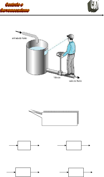Prof. Celso – Módulo 1 1 1 Sistema de Controle: é um sistema cuja saída é controlada para assumir um valor determinado ou seguir uma determinada entrada. Fig.01 – Sistema de controle manual para regular o nível de fluído em um reservatório. O operador ajusta a válvula observando o nível atual do fluído. Sistema: é a interação entre vários componentes, sendo de interesse apenas a relação entre a entrada e a saída. Exemplos de Sistemas: - Usina Hidreétrica - Motor elétrico - Automóvel - Mesa rotativa Os componentes (ou os processos) podem ser representados por blocos Entrada Saída Combustível Eletricidade Usina Entrada Saída Potência Rotação Elétrica mecânica Motor Elétrico Entrada Saída Acelerador Velocidade Automó- vel Entrada Saída Tensão Rotação mecânica Mesa Rotativa Prof. Celso – Módulo 1 2 2 Planta: é o equipamento a ser controlado (motor, atuador, reator, etc) Processo: é todo fenômeno, natural ou artificial, que evoluem segundo uma dinâmica (processo químico, biológico, etc.) Perturbação externa ou distúrbio: São sinais com efeitos indesejados sobre o processo Formas de Sistemas de Controle Sistema em malha aberta: é um sistema composto por uma planta ou processo e um controlador sem que haja interferência do sinal de saída no sinal de controle. Sinal de Entrada Controle Saída Temperatura Potência Temperatura desejada Sistema em malha fechada (ou sistema realimentado, ou sistema com retroação): Uma parcela do sinal de saída é realimentado junto à entrada do sistema. Sinal de Entrada Erro Controle Saída Temperatura Potência Temperatura desejada Sistemas de Controle Sistemas em Malha Aberta: Sistemas em Malha Fechada: Maior ganho Sistemas estáveis Sistemas mais simples Menor custo Mais preciso Menos sensível a distúrbios Sistemas menos sensíveis a variações dos componentes Maior velocidade de resposta Maior faixa de passagem Controlador (Chave seletora) Processo ou Planta (Aquecedor Elétrico) Controlador (Ch Seletora) Processo (Aq. Elétrico) Sensor (Termômetro) Prof. Celso – Módulo 1 3 3 Sistemas em Malha Aberta – Elementos Controlador Sinal de Entrada Controle Saída valor ação de variável variável desejado controle manipulada controlada Elemento (ou estratégia) de controle: Determina a ação que deve ser tomada visando o controle do processo. Elemento de correção (atuador): age sobre a variável manipulada provocando mudança no processo. Processo (ou planta): sistema no qual uma variável é controlada. Exemplo: Sinal de Entrada Controle Saída Tensão Veloc (velocidade real desejada) Elemento de controle Processo ou Planta Elemento de correção (Atuador) Elem.controle amplificador Processo Mesa Rot. Atuador Motor CC Exercício: 1) Os seguintes sistemas são em malha aberta ou em malha fechada? Por que? a) Uma chaleira elétrica que desliga quando a água ferve. b) Um refrigerador. c) Uma chapa elétrica usada em lanchonete (Trembão). d) Pregão da bolsa de valores. Prof. Celso – Módulo 1 4 4 Sistemas em Malha Fechada – Elementos Comparação Controlador Sinal de Entrada Erro Controle Saída valor ação variável variável desejado de manipulada controlada controle Elemento de comparação: Compara o valor de referência (ou valor desejado) com o valor medido da variável controlada. Elemento (ou estratégia) de controle: Determina a ação que deve ser tomada visando o controle do processo. Elemento de correção (atuador): age sobre a variável manipulada provocando mudança no processo. Processo (ou planta): sistema no qual uma variável é controlada. Sensor (ou transdutor, ou elemento de medida): converte o sinal da variável controlada para valores adequados a ser aplicado no comparador. Exemplo: Entrada Saída Tensão Veloc (veloc. real desejada) Elemento de controle Processo ou Planta Elemento de correção (Atuador) Sensor + - Sensor tacômetro Elem.controle amplificador Processo Mesa Rot. Atuador Motor CC + - Amplificador diferencial Prof. Celso – Módulo 1 5 5 Realimentação Negativa: O sinal é enviado de volta para que seja subtraído da entrada. É necessário para que o controle possa ser realizado. Realimentação Positiva: O sinal é enviado de volta para que seja adicionado ao sinal de entrada Exemplos: 1) Desenhar o diagrama de blocos para um sistema em malha aberta de um ar- condicionado usado para aquecer uma sala. Especificar os elementos do sistema. Entrada (ou valor de referência): Temperatura desejada na sala. Saída - Variável controlada: Temperatura da sala. Elemento de controle: pessoa manipulando uma chave seletora. Elemento de correção (ou atuador): aquecedor. Processo (ou planta): a sala. Entrada Saída Temperatura Temperatura desejada da sala 2) Desenhar o diagrama de blocos para um sistema em malha fechada de um ar- condicionado usado para aquecer uma sala, considerando que o operador compare visualmente a temperatura atual através de um termômetro. Especificar os elementos do sistema. Entrada (ou valor de referência): Temperatura desejada na sala. Saída - Variável controlada: Temperatura da sala. Elemento de comparação: a pessoa comparando o valor medido com o valor desejado. Sinal de erro: diferençaentre a temperatura medida e a temperatura desejada. Elemento de controle: pessoa manipulando uma chave seletora. Elemento de correção (ou atuador): aquecedor. Processo (ou planta): a sala. Sensor: termômetro. Realimentação: negativa. Entrada Saída Temperatura Temp desejada real Elem.controle Pessoa c/ chave seletora Processo Sala Atuador aquecedor Sensor termômetro Elem.controle pessoa Processo Sala Atuador aquecedor+ - Prof. Celso – Módulo 1 6 6 Exercício: 2) A figura abaixo mostra um sistema de controle para a velocidade de rotação de um motor. O potenciômetro é usado para ajustar o valor de referência, isto é, a tensão que será aplicada ao amplificador diferencial. O amplificador diferencial compara e amplifica a diferen