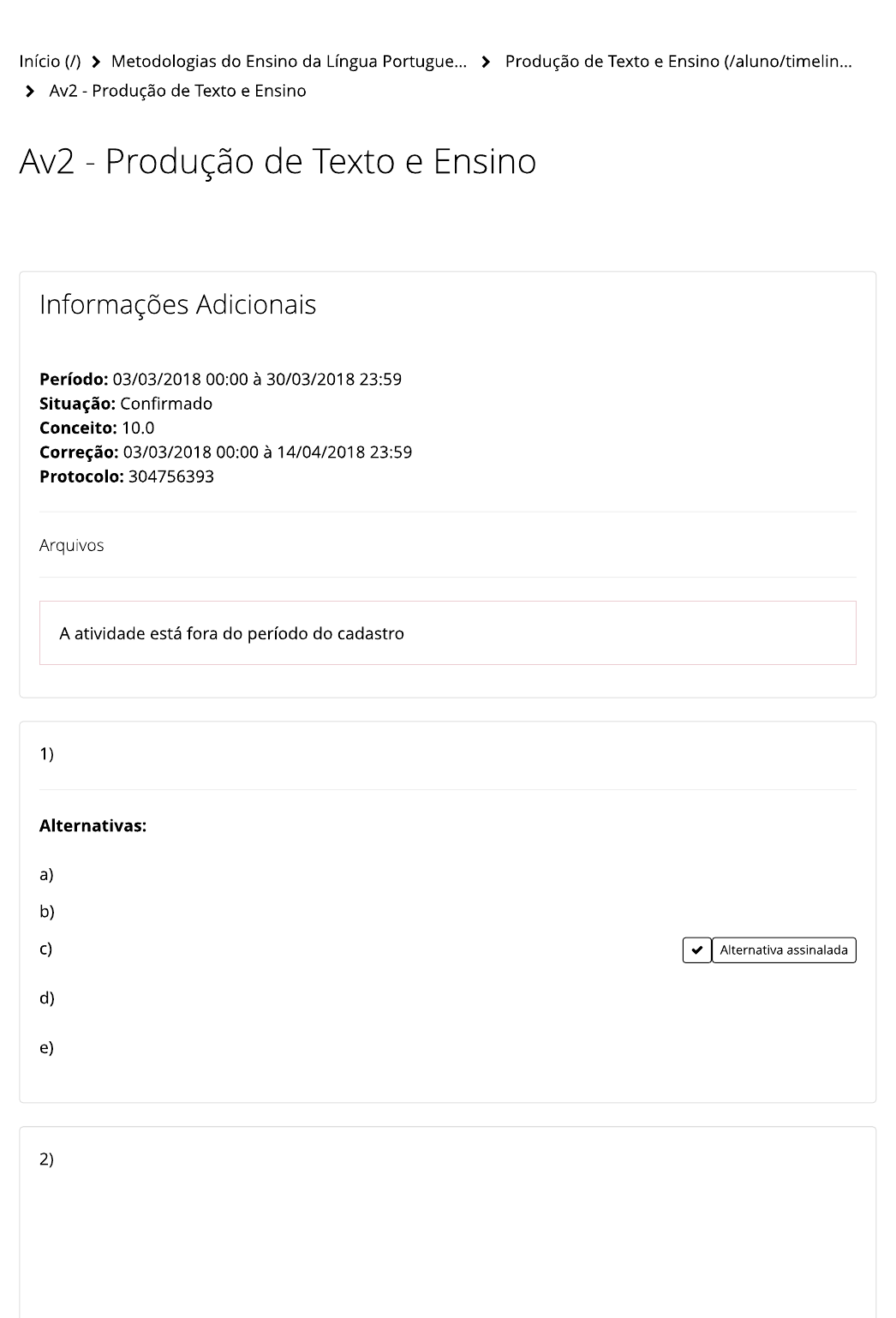 Assinale a alternativa que melhor comenta sobre o assunto paragrafação, do ponto de vista linguístico. O escritor obterá um texto bem organizado, uniforme e claro, capaz de manter a atenção e boa vontade do leitor. O parágrafo denota pausa mais forte do que o simples ponto final. As ideias podem ser encadeadas ou desenvolvidas em processos muito variados, por isso a estruturação dos parágrafos necessariamente também vai ser variada. O parágrafo encerra um pensamento ou um grupo de pensamentos que, em geral, têm com o parágrafo antecedente relação menos íntima do que a que liga os períodos de um mesmo parágrafo. Organizar e desenvolver ideias em parágrafos é difícil; por isso, requer um método que facilite o trabalho do escritor. Leia o seguinte trecho, extraído dos PCN. “Cabe, portanto, à escola viabilizar o acesso do aluno ao universo dos textos que circulam socialmente, ensinar a produzi-los e a interpretá-los. Isso inclui os textos das diferentes disciplinas, com os quais o aluno se defronta sistematicamente no cotidiano escolar e, mesmo assim, não consegue manejar, pois não há um trabalho planejado com essa finalidade.” (BRASIL, 1997, p. 26). Com base no trecho acima, podemos entender que 3 são os itens principais no trabalho com a produção textual: (1) Planejar a aula de produção textual; (2) Corrigir os textos; (3) Propiciar a refacção textual. Porém, Colaborar - Av2 - Produção de Texto e Ensino https://www.colaboraread.com.br/aluno/avaliacao/index/2110274901?a... 1 de 3 25/04/2018 18:39 o item (2) é subdividido em 10 categorias. Uma delas foi escrita de maneira errada (as alternativas têm sempre 2 itens). Assinale, então, a alternativa que contém um dos itens errado. apontamento de outra voz que aparecer no texto, que não seja a do escritor; coesão entre as orações concordância verbal e nominal; forma composicional grafia adequada das palavras; organização da forma composicional do gênero textual que está sendo trabalhado sinais de pontuação; morfologia titulação adequada ao texto; uso das maiúsculas e minúsculas Ensinar a produção textual não é tarefa fácil, porém Arruda e Oliveira (2012) trabalham em prol de facilitar essa tarefa. Assim eles dizem: “Nessa perspectiva, o ensino de leitura e produção de textos na escola, deve voltar-se para a ampliação e a consolidação dos conhecimentos do(a) estudante para agir em práticas letradas de prestígio, ‘o que inclui o trabalho sistemático com textos literários, jornalísticos, científicos, técnicos etc., considerados os diferentes meios em que circulam: imprensa, rádio, televisão, internet, etc.’ (OCEM, BRASIL, 2006, p. 33). De acordo com os PCN+ (BRASIL, 2002), na atividade de produção de textos, os(as) estudantes devem ser orientados(as) a ter clareza sobre 5 itens, 4 dos quais estão corretos nas alternativas, porém 1 está errado. Assinale, então, a alternativa INCORRETA: A quem seu texto se dirige De que forma esse texto se tornará público O lugar social do qual fala O momento quando o texto estará terminado O que tem a dizer sobre o tema proposto, de acordo com suas intencionalidades Na teoria vygotskiana, a Zona de Desenvolvimento Proximal (ZPD) é a distância entre dois níveis. Assinale, então, a alternativa que CORRETAMENTE transcreve quais são esses níveis. Autônoma e Real Real e Poten Realizacional e Potencializadora Resolutiva e Potencial Subjetivismo Idealista e Objetivismo Abstrato Assinale a única alternativa INCORRETA, pois NÃO identifica o que é ser professor, para Vygotsky, ou seja, quais são as características da ação docente. Colaborar - Av2 - Produção de Texto e Ensino https://www.colaboraread.com.br/aluno/avaliacao/index/2110274901?a... 2 de 3 25/04/2018 18:39 Aceitar interpretações ou leituras adequadas Deve agir na ZDP Deve facilitar o domínio e a apropriação dos diferentes instrumentos culturais ao aluno. É a pessoa competente que deve desenvolver estratégias para ajudar o aluno na resolução de problemas. É o mediador da aprendizagem do aluno. Colaborar - Av2 - Produção de Texto e Ensino https://www.colaboraread.com.br/aluno/avaliacao/index/2110274901?a... 3 de 3 25/04/2018 18:39