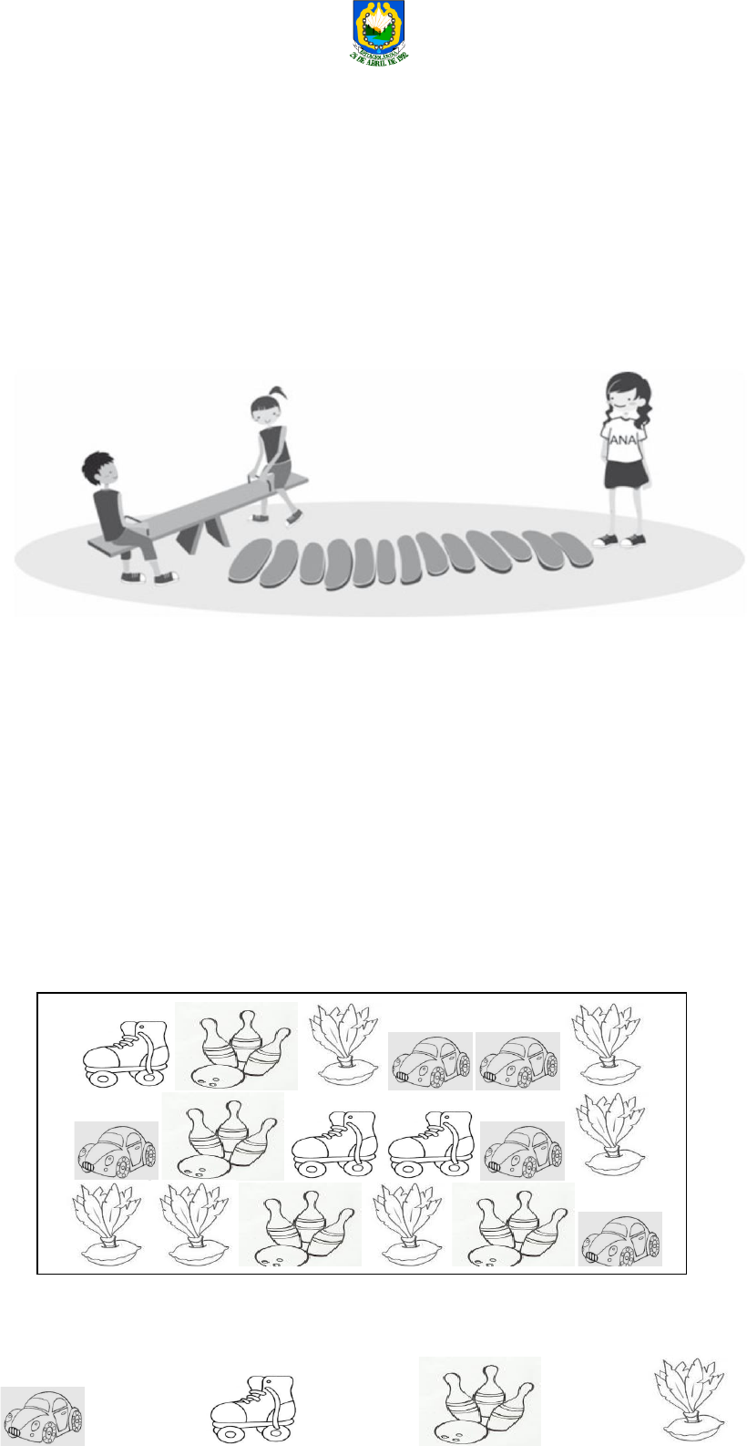 Estado do Acre Secretaria Municipal de Educação e Desporto/SEMED Escola Municipal de Ensino Fundamental José Hassem Hall Filho ALUNO (A): _____________________________________________________________________ PROFESSOR (A)_________________________________________________________________ DATA: ______/________/ 2017 QUESTÃO 01: QUESTÃO ANA ESTAVA BRINCANDO NO PARQUE. FAÇA UM X NA ALTERNATIVA QUE MOSTRA QUANTAS PEDRAS SEPARAM ANA DE SEUS AMIGOS. A) ( ) 13 B) ( ) 15 C) ( ) 12 D) ( ) 11 QUESTÃO 02 FAÇA UM X NA ALTERNATIVA QUE MOSTRA O NÚMERO SESSENTA E SEIS. A) ( ) 6 B) ( ) 7 C) ( ) 66 D) ( ) 76 QUESTÃO 03 VEJA OS BRINQUEDOS QUE SAMUEL TEM EM CASA [ FAÇA UM “X” NA ALTERNATIVA QUE INDICA QUAL BRINQUEDO QUE SAMUEL MAIS TEM EM CASA. A) ( ) B) ( ) C) ( ) D) ( ) QUESTÃO 04 OBSERVE A PLACA DE TRÂNSITO. FAÇA UM X NA ALTERNATIVA QUE INDICA A FIGURA GEOMÉTRICA QUE SE PARECE COM A PLACA DE TRÂNSITO. A) ( ) B) ( ) C) ( ) C) ( ) QUESTÃO 05 FAÇA UM X NA ALTERNATIVA DO DESENHO QUE REPRESENTA O CÍRCULO. A ( ) B ( ) C ( ) D ( ) QUESTÃO 06 DA CAIXA COM DOZE BOMBONS QUE JOANA GANHOU RESTAM APENAS CINCO. FAÇA UM X NA ALTERNATIVA QUE MOSTRA O NÚMERO DE BOMBONS QUE JOANA JÁ COMEU. A) ( ) 5 B) ( ) 7 C) ( ) 9 D) ( ) 12 QUESTÃO 07 O QUADRO MOSTRA A QUANTIDADE DE ALUNOS POR TURMA EM UMA ESCOLA. TURMA NÚMERO DE ALUNOS 1º ANO 24 2º ANO 33 3º ANO 21 4º ANO 28 FAÇA UM X NA ALTERNATIVA QUE MOSTRA A TURMA QUE TEM MAIS ALUNOS. A) ( ) 1º ANO B) ( ) 2º ANO C) ( ) 3º ANO D) ( ) 4º ANO QUESTÃO 08 Ana coleciona bonecas. Quantas são as bonecas de Ana? Descubra e escreva o resultado dentro do quadradinho: QUESTÃO 09 João coleciona figurinhas. Quantas são as figurinhas de João? Descubra e escreva o resultado dentro do quadradinho. QUESTÃO 10 Escreva em cada quadradinho os números que a professora vai ditar. QUESTÃO 11 QUANTAS PATAS TEM 4 CACHORROS, SABENDO QUE 1 CACHORRO POSSUI 4 PATAS. A) ( ) 4 B) ( ) 8 C) ( ) 12 D) ( ) 16 QUESTÃO 12 CRISTINA DISTRIBUIU 8 DOCINHOS EM 2 CAIXAS IGUAIS, COLOCANDO A MESMA QUANTIDADE DE DOCINHOS EM CADA CAIXA. FAÇA UM X NA ALTERNATIVA QUE INDICA QUANTOS DOCINHOS ELA COLOCOU EM CADA CAIXA. A) ( ) 4 B) ( ) 8 C) ( ) 2 D) ( ) 10 QUESTÃO 13 PAULA RECEBEU DE SEU PAI ALGUMAS NOTAS E MOEDAS PARA OS BRINQUEDOS DA PRACINHA. MARQUE COM UM X A ALTERNATIVA QUE REPRESENTA A QUANTIA QUE PAULA RECEBEU: A) ( ) 10 REAIS B) ( ) 7 REAIS C) ( ) 9 REAIS D) ( ) 8 REAIS QUESTÃO 14 VEJA O CALENDÁRIO. O MÊS EM QUE NÓS ESTAMOS É: (A) MARÇO. (B) ABRIL. (C) JUNHO. (D) DEZEMBRO BOA ATIVIDADE!!!!!!!!!!!!!!